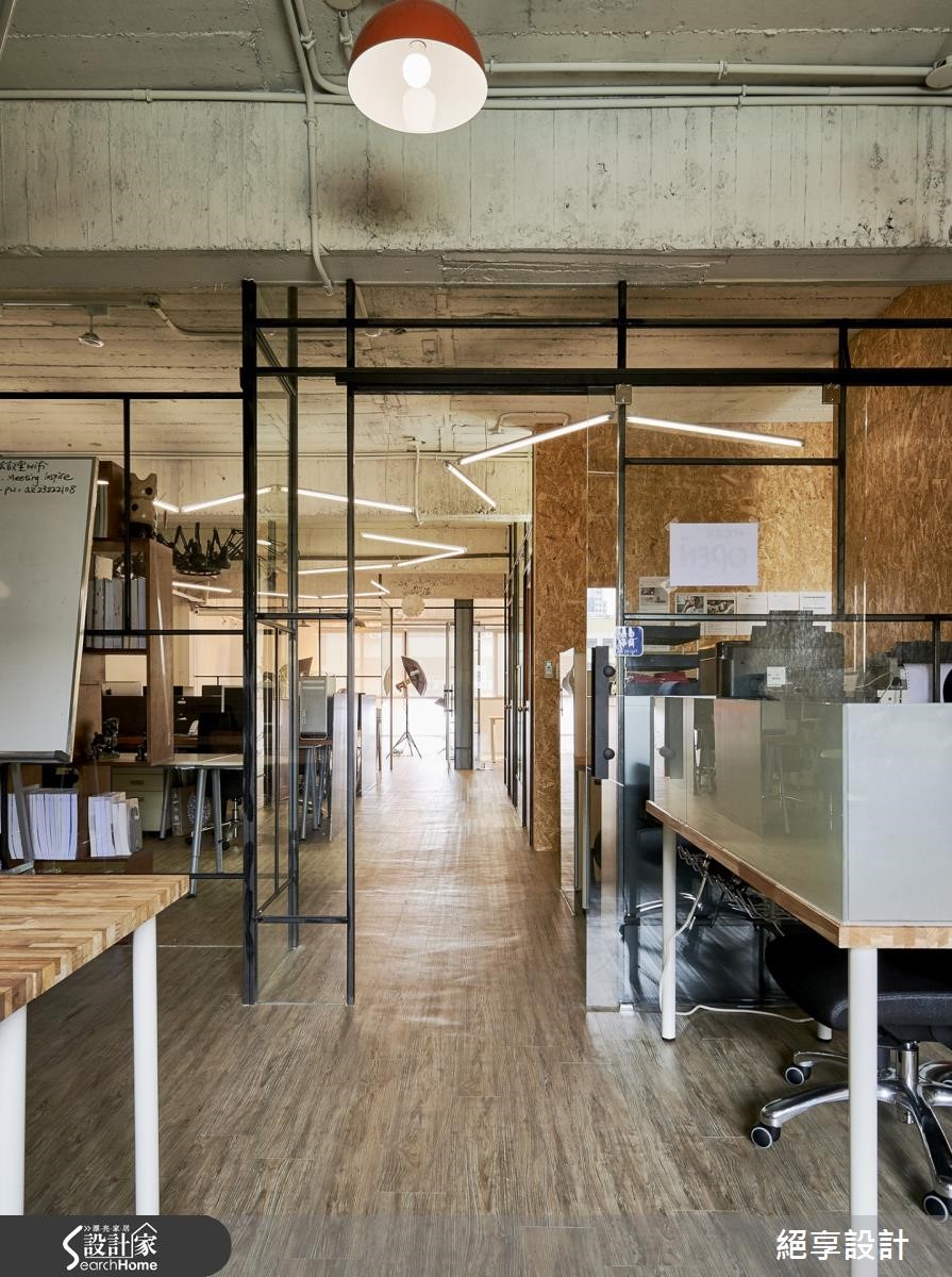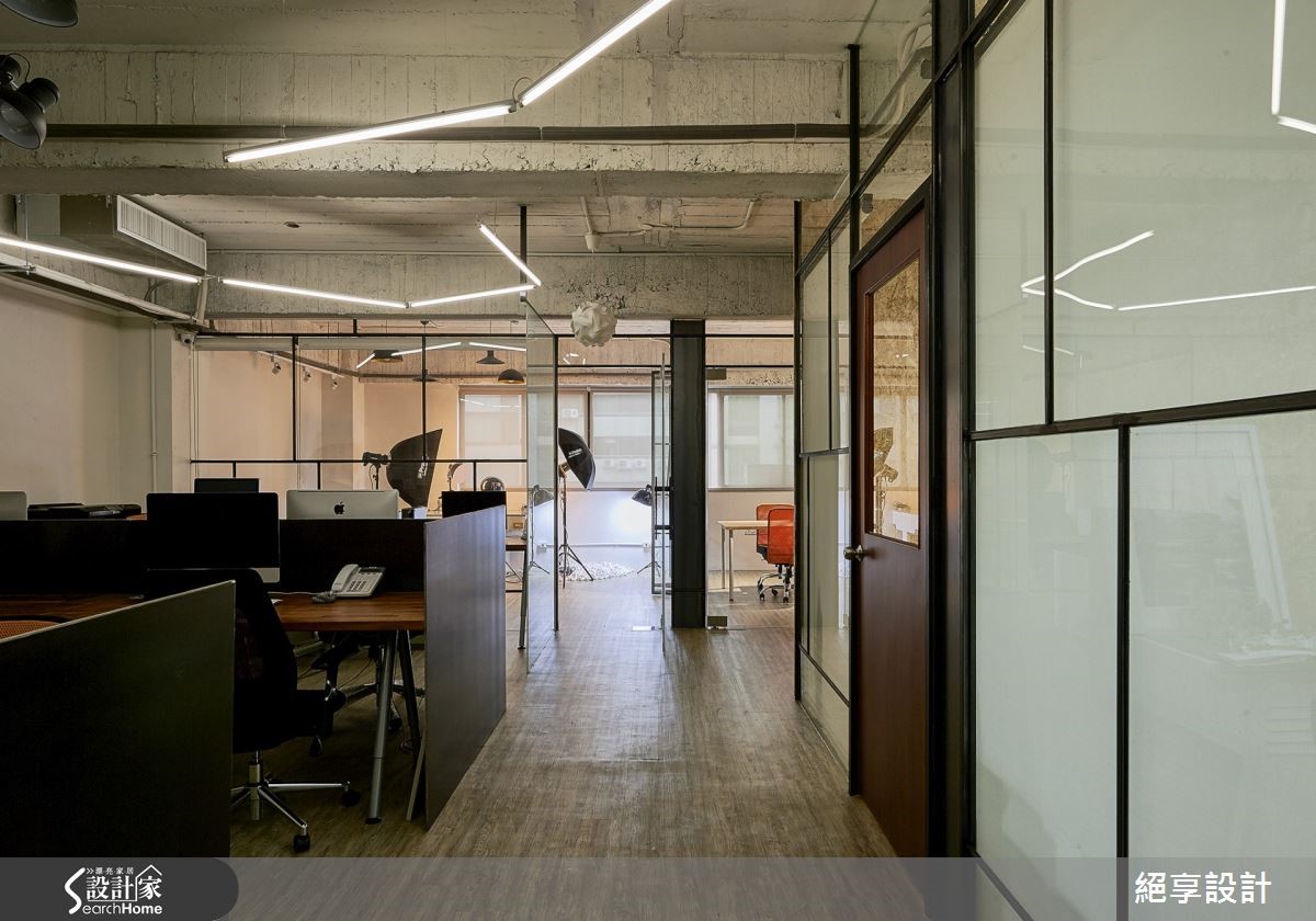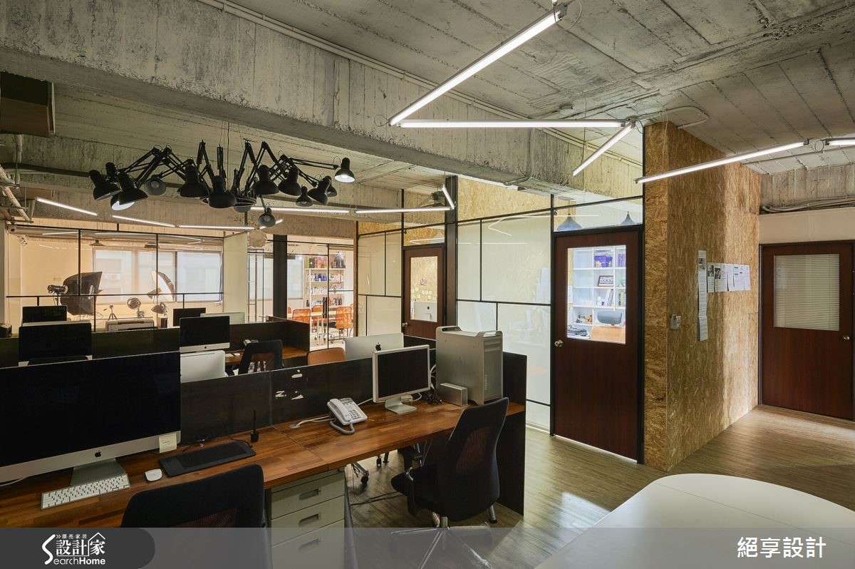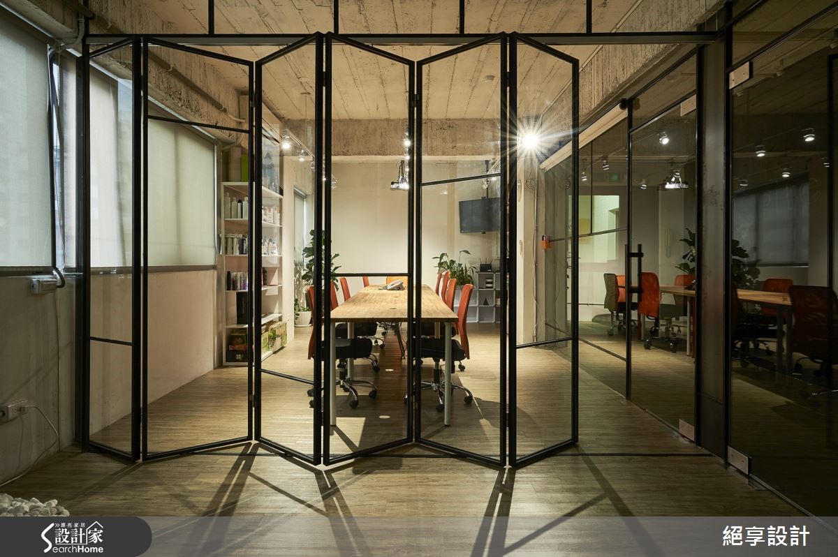 在这户165坪的办公室中,设计师为了达到不过度装修、旧物能够回收再利用,以及创造出弹性的空间运用,特别选用原始质材做为空间基底,玻璃隔断的安排让光源自然游走于室,照亮裸露的建材肌理,酝酿出loft的自然与怀旧氛围。【善用折门,缔造空间弹性】办公室中大面铺陈原始的水泥粉光,结合旧板模结构,创造出天花的粗糙质感。原色泥作再搭配铁件元素,办公室里还特别利用OSB板,打造出主管办公室与布告墙,周围还有一些旧家具与门板的运用,呼应环保自然的设计初衷。整体空间里让透明的玻璃搭以铁件框架,通透隔断有效引入自然光源,营造轻盈明亮的效果;粗细不一的铁件穿梭在清透质感的玻璃质材中,框构出层次美感且不失穿透的空间特性。而会议室与摄影棚之间,特别以折叠门结合卷帘的区隔方式,替领域转移间缔造出弹性与变化。