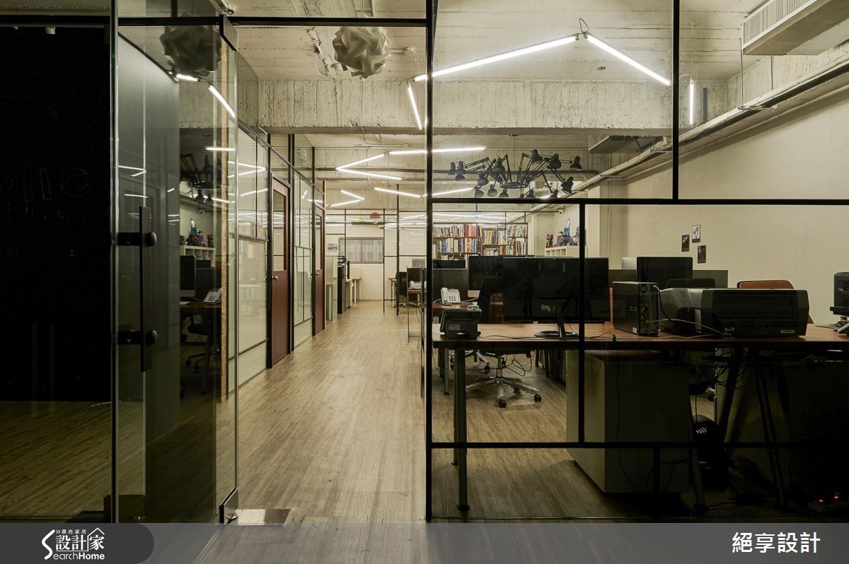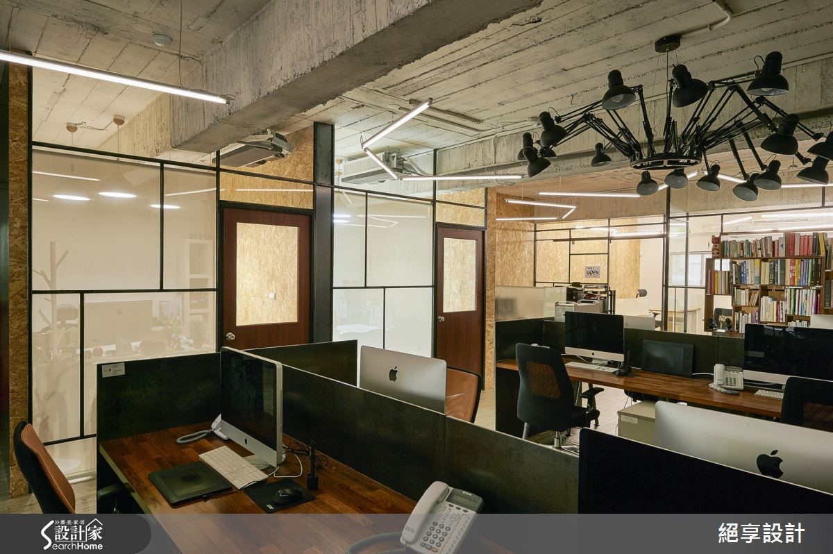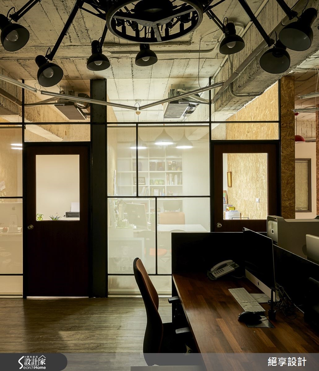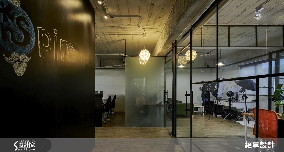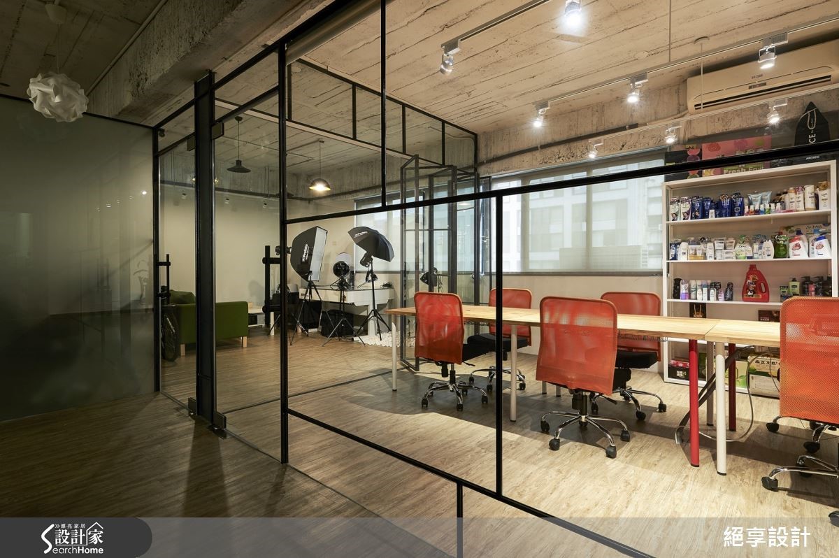 在这户165坪的办公室中,设计师为了达到不过度装修、旧物能够回收再利用,以及创造出弹性的空间运用,特别选用原始质材做为空间基底,玻璃隔断的安排让光源自然游走于室,照亮裸露的建材肌理,酝酿出loft的自然与怀旧氛围。【善用折门,缔造空间弹性】办公室中大面铺陈原始的水泥粉光,结合旧板模结构,创造出天花的粗糙质感。原色泥作再搭配铁件元素,办公室里还特别利用OSB板,打造出主管办公室与布告墙,周围还有一些旧家具与门板的运用,呼应环保自然的设计初衷。整体空间里让透明的玻璃搭以铁件框架,通透隔断有效引入自然光源,营造轻盈明亮的效果;粗细不一的铁件穿梭在清透质感的玻璃质材中,框构出层次美感且不失穿透的空间特性。而会议室与摄影棚之间,特别以折叠门结合卷帘的区隔方式,替领域转移间缔造出弹性与变化。