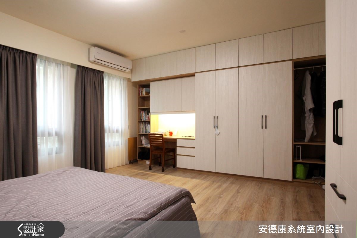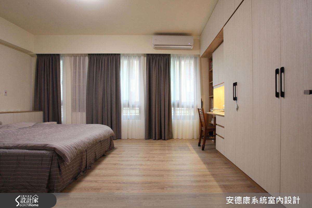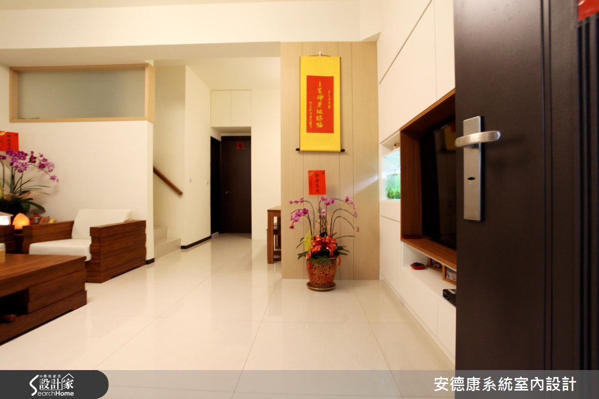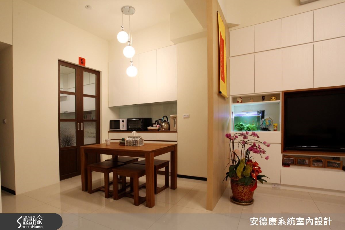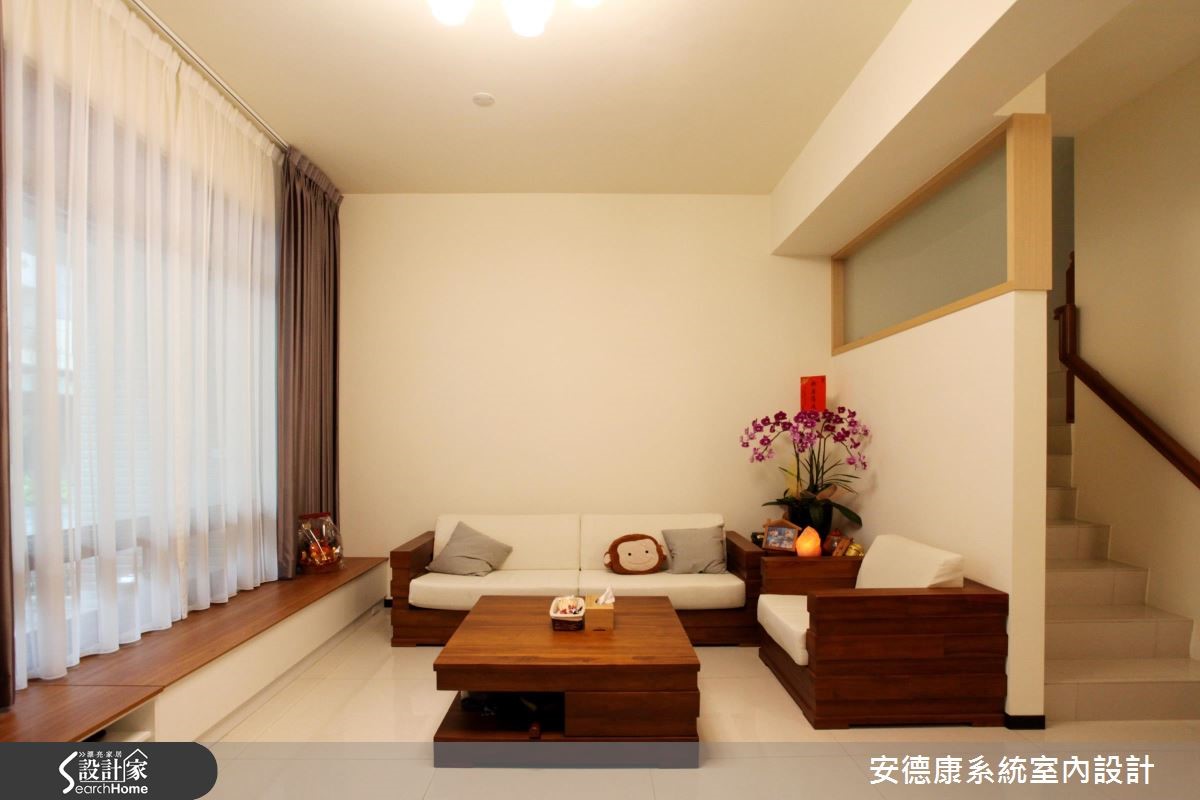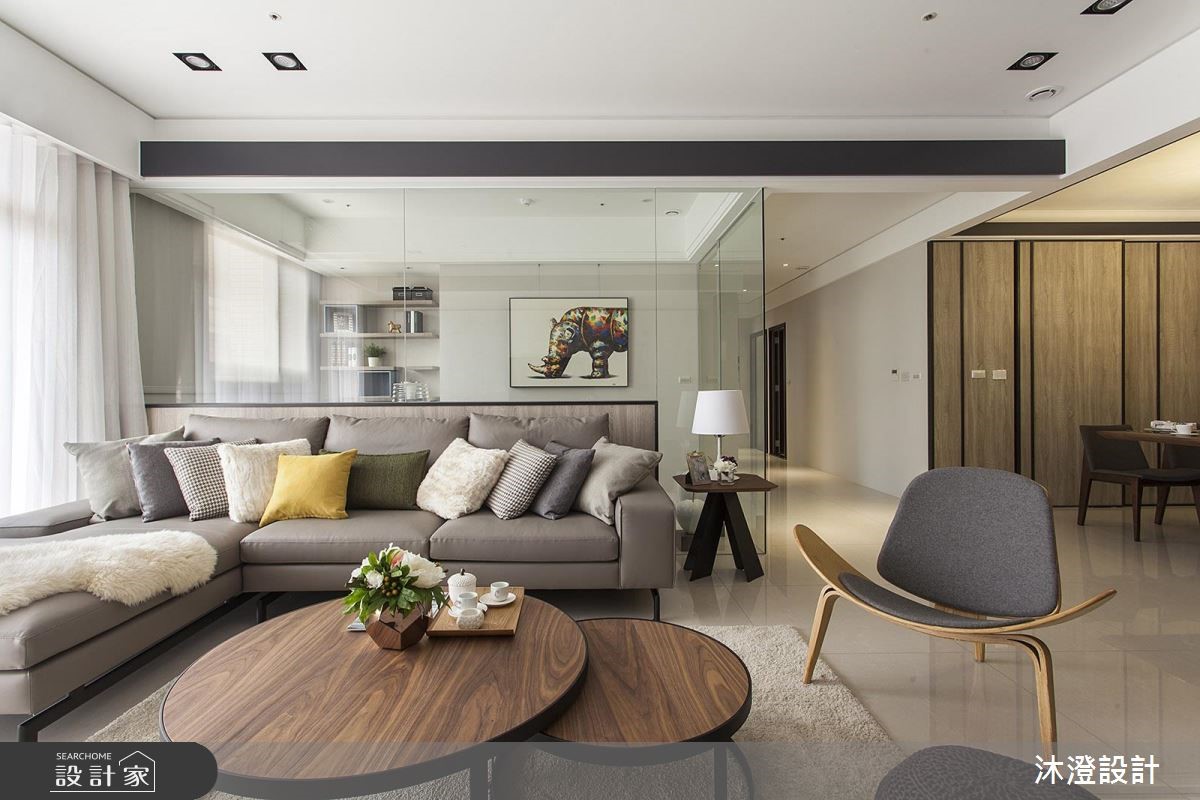 原本一家4口入住在3室2厅的大楼里,小孩纷纷长大,经济更有余裕,自然转换到独栋楼的住家空间。为了有效维持开阔的空间,沿梁下的机灵空间设置收纳,不仅整平空间线条,也让家人享有更舒适的生活体验。 【浅淡配色,展现淡雅居家】步入客厅空间,发现整体以轻装修做为设计重点,并利用系统柜加强收纳机能。没有华丽复杂的柜体设计,反以现代感的简约线条轻轻描绘,营造出干净、开阔的生活领域。电视墙的侧边利用木作创造一面屏风,让人不会一进家门就看到厨房景象,同时界定出客、餐厅。餐厨区则以木作搭配玻璃的推拉门设计,区隔烹调与用餐空间,创造清爽的居家环境。从一楼到二楼的梯间则利用浅木纹包框,搭配磨砂玻璃做为隔断,引入公领域的明亮光源,体现雅致明亮的生活气息。