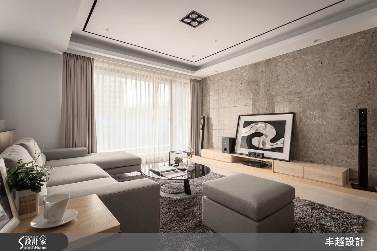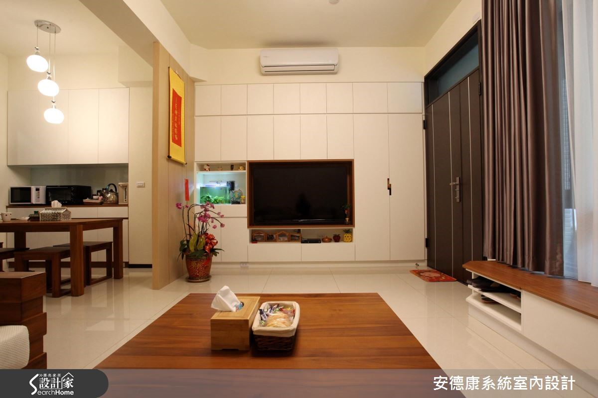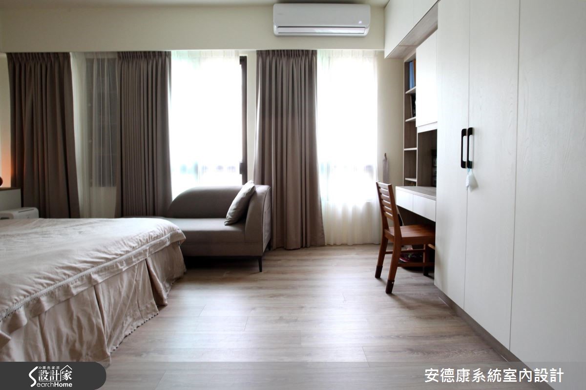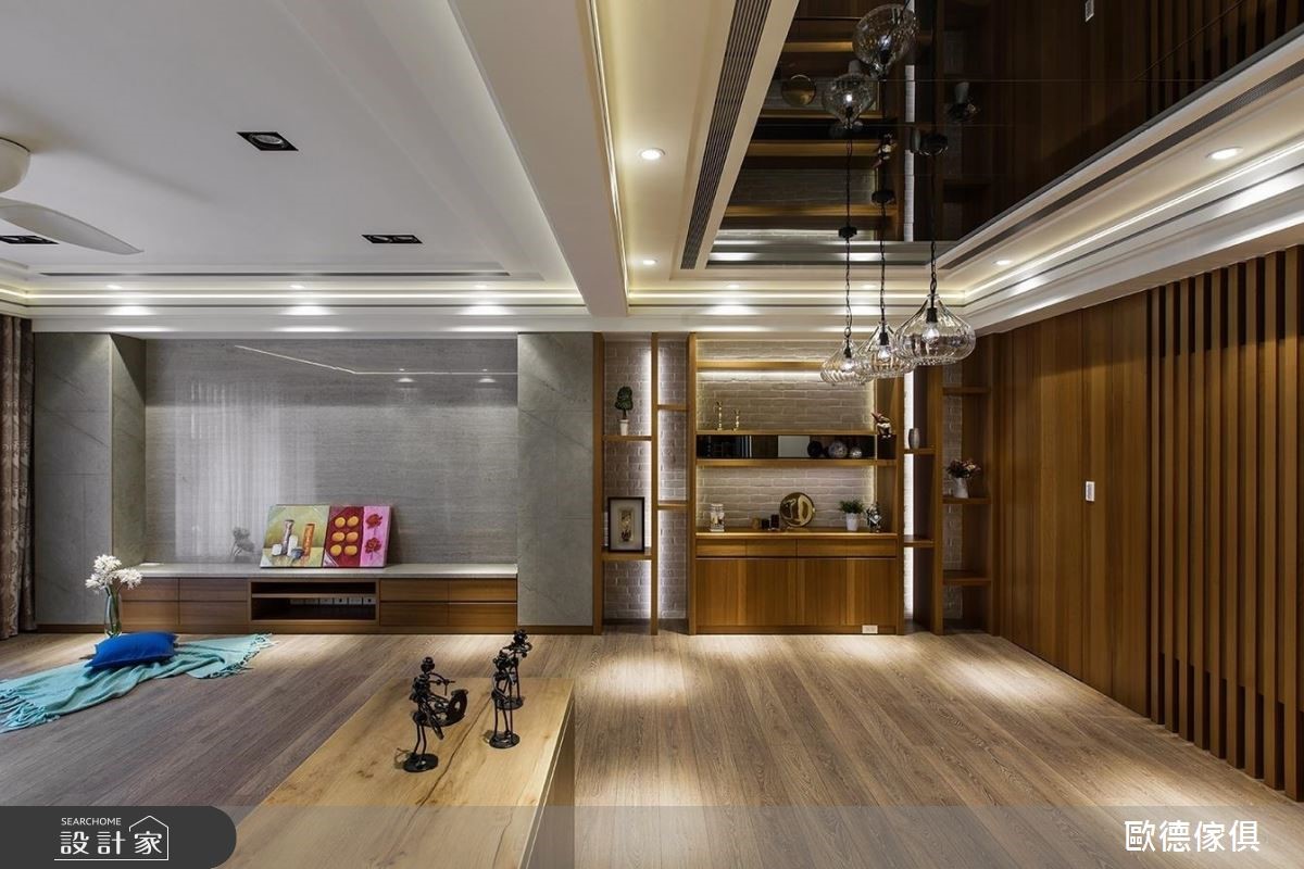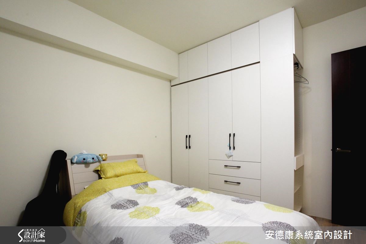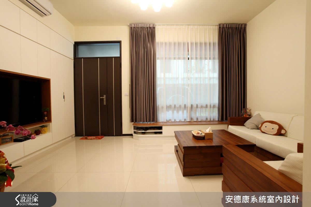 原本一家4口入住在3室2厅的大楼里,小孩纷纷长大,经济更有余裕,自然转换到独栋楼的住家空间。为了有效维持开阔的空间,沿梁下的机灵空间设置收纳,不仅整平空间线条,也让家人享有更舒适的生活体验。 【浅淡配色,展现淡雅居家】步入客厅空间,发现整体以轻装修做为设计重点,并利用系统柜加强收纳机能。没有华丽复杂的柜体设计,反以现代感的简约线条轻轻描绘,营造出干净、开阔的生活领域。电视墙的侧边利用木作创造一面屏风,让人不会一进家门就看到厨房景象,同时界定出客、餐厅。餐厨区则以木作搭配玻璃的推拉门设计,区隔烹调与用餐空间,创造清爽的居家环境。从一楼到二楼的梯间则利用浅木纹包框,搭配磨砂玻璃做为隔断,引入公领域的明亮光源,体现雅致明亮的生活气息。