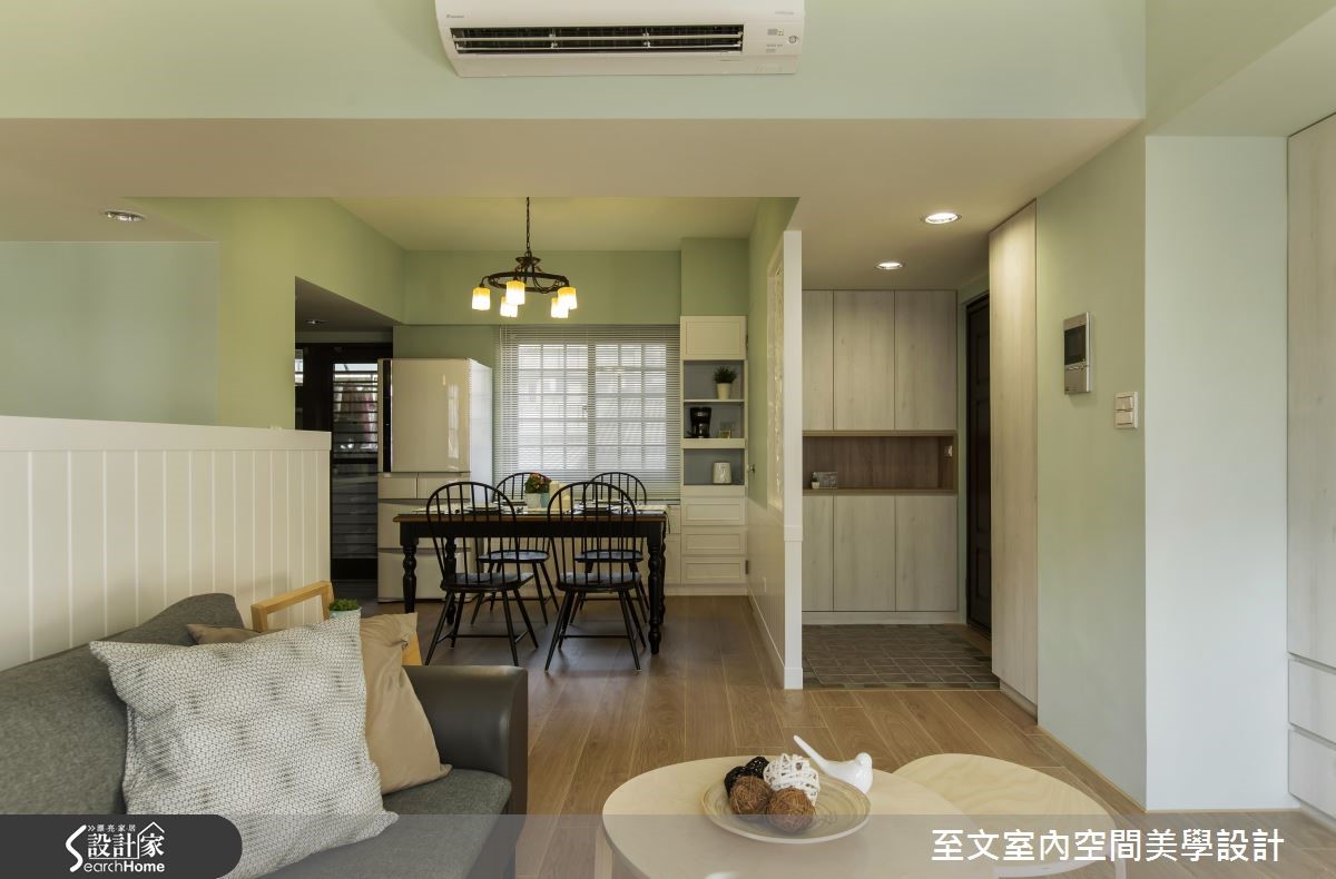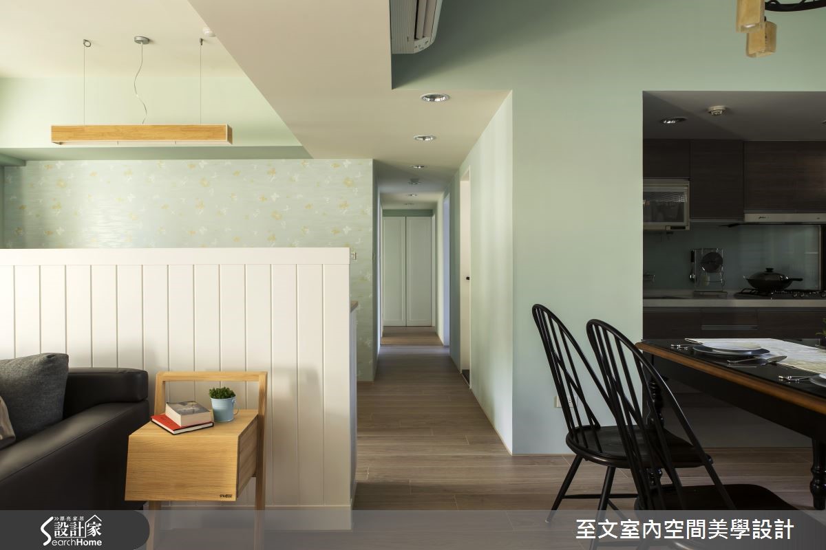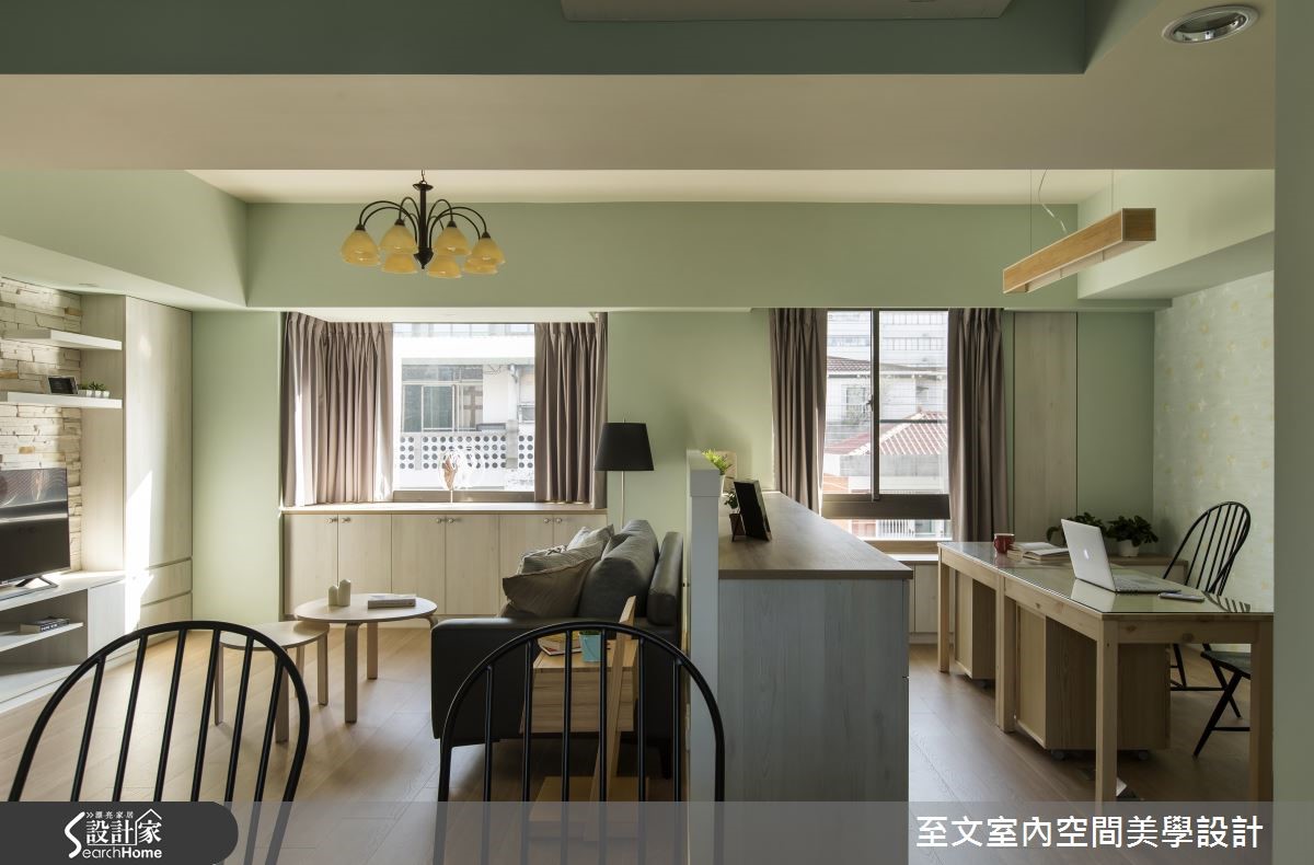 自英国留学归国的夫妻相当想念在英国求学时的点点滴滴,透过设计师的格局重整,将英国乡村风格注入居家空间,让99平方米的二手房化身美好回忆。 【粉嫩配色和墙纸,流露柔美氛围】设计团队规划隔断时,为业主两个儿子规划大小一致的房间,并增设开放书房,满足一家四口对于公、私领域的需求。玄关地坪以进口砖混搭出英式复古气息,开放式客厅与餐厨空间则以嫩芽绿为主轴,接着在书房搭配同色系碎花墙纸,创造柔美气息。设计师为客厅与书房之间规划与柜体结合的120厘米的墙板,巧妙化解沙发无靠背的问题。客厅电视墙结合柜体与文化石,创造平衡对称的设计,并沿窗下设置矮柜增加收纳。主卧以纯白墙板搭配碎花墙纸,与色调淡雅的木质家具散发优雅的英式气息。