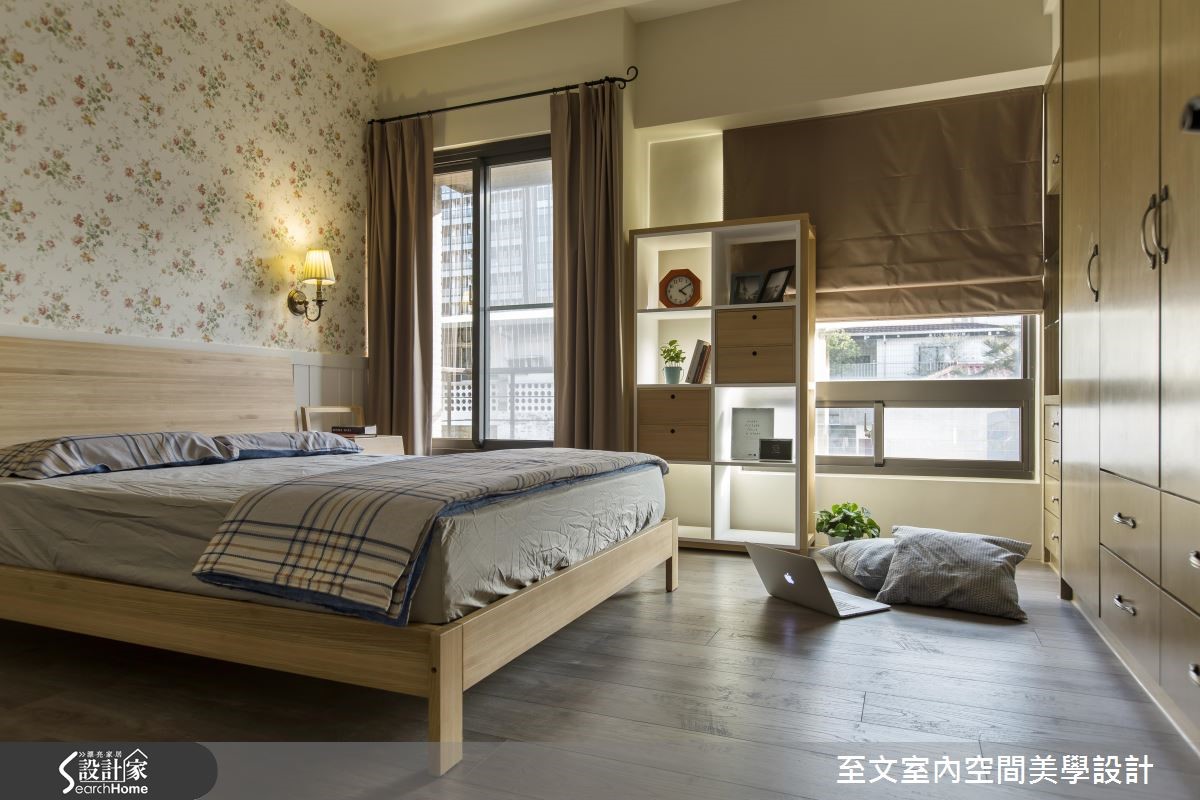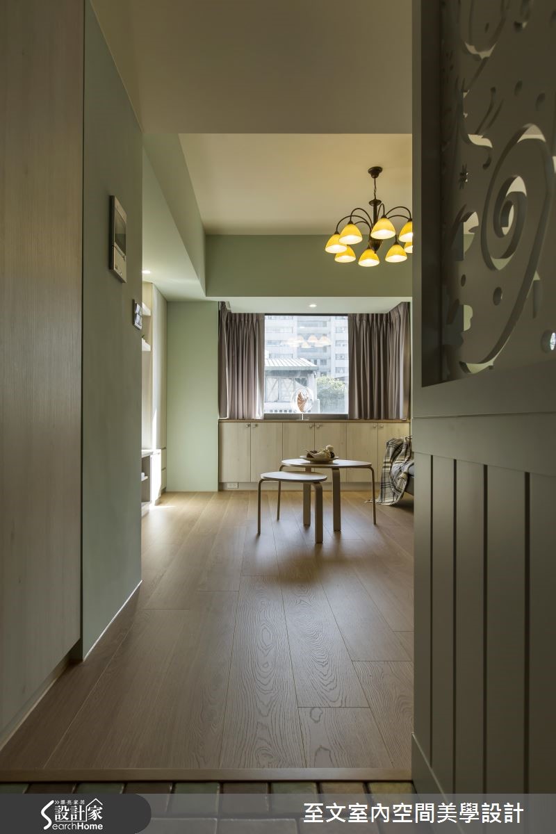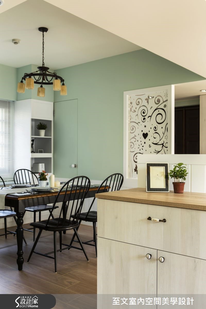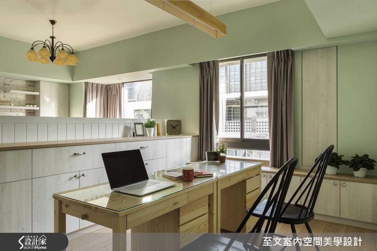 自英国留学归国的夫妻相当想念在英国求学时的点点滴滴,透过设计师的格局重整,将英国乡村风格注入居家空间,让99平方米的二手房化身美好回忆。 【粉嫩配色和墙纸,流露柔美氛围】设计团队规划隔断时,为业主两个儿子规划大小一致的房间,并增设开放书房,满足一家四口对于公、私领域的需求。玄关地坪以进口砖混搭出英式复古气息,开放式客厅与餐厨空间则以嫩芽绿为主轴,接着在书房搭配同色系碎花墙纸,创造柔美气息。设计师为客厅与书房之间规划与柜体结合的120厘米的墙板,巧妙化解沙发无靠背的问题。客厅电视墙结合柜体与文化石,创造平衡对称的设计,并沿窗下设置矮柜增加收纳。主卧以纯白墙板搭配碎花墙纸,与色调淡雅的木质家具散发优雅的英式气息。