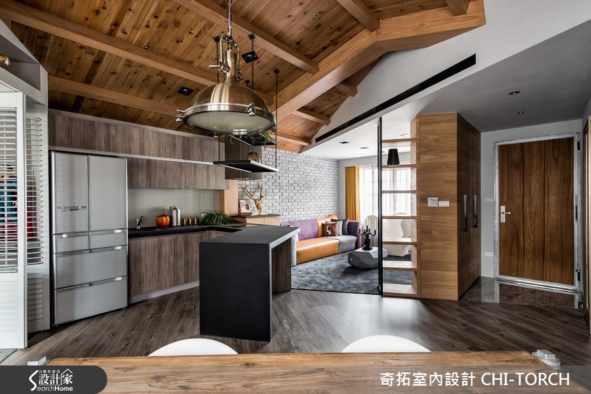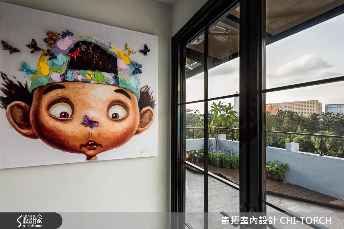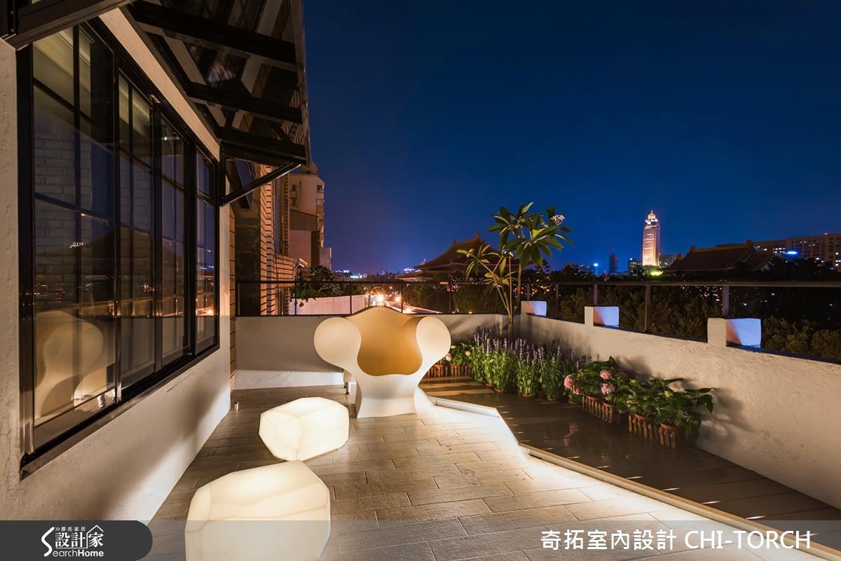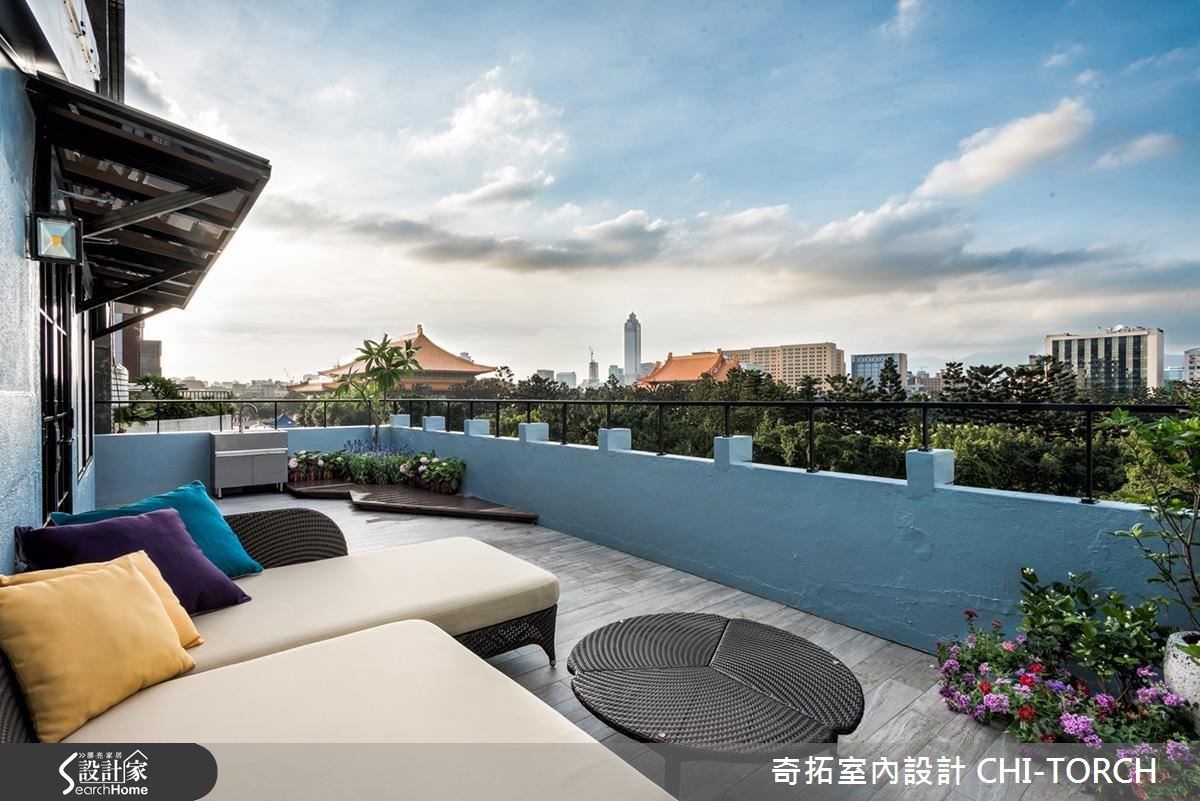 因为爱上阳台的风景视野,长居海外屋主决定买下老屋重新改造。设计师跳脱寻常格局的思维,把男屋主欣赏的美式现代风,以及女屋主喜爱的美式斜屋顶完美共融,混搭出新颖而舒适的居家风格。 【斜地板串联视觉,营造趣味】老屋的改造重点包含防水、隔热层的处理,彻底解决漏水、壁癌与隔热问题。室内空间以纽约都会式的黑格子窗与室外区隔,将充足的阳光带进屋内,搭配仿旧文化石墙面,凸显出光影的立体层次感。使用开放式手法规划,把客厅、餐厨、卧室、书房串联让空间显得更宽敞;各领域间以斜向地板划分,创造利落而有个性的线条,再辅以百叶折门弹性区隔公、私领域的隐私界限。偌大的户外阳台区重新整理地面后,铺上木栈板种植花草。墙面绘上清爽的天蓝色,呼应了阳台外的一整片的天空色彩,摆上简单的户外家具,无论在白天、夜晚都是迷人的休闲观景区。