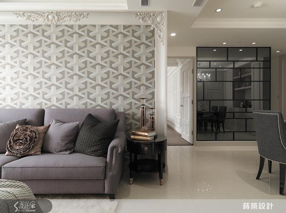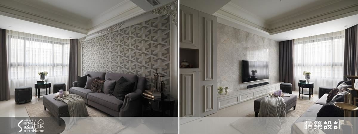 原有客厅在靠窗处架高地板有间和室,在拆除后将原本凹向更衣室的墙面拉齐,虽然客厅实际面积变少,空间感却因为方正格局反而扩大许多;主墙壁面以繁复的线板点缀,搭配图腾壁纸装饰出华丽感,显得大方又沉稳(左图)。