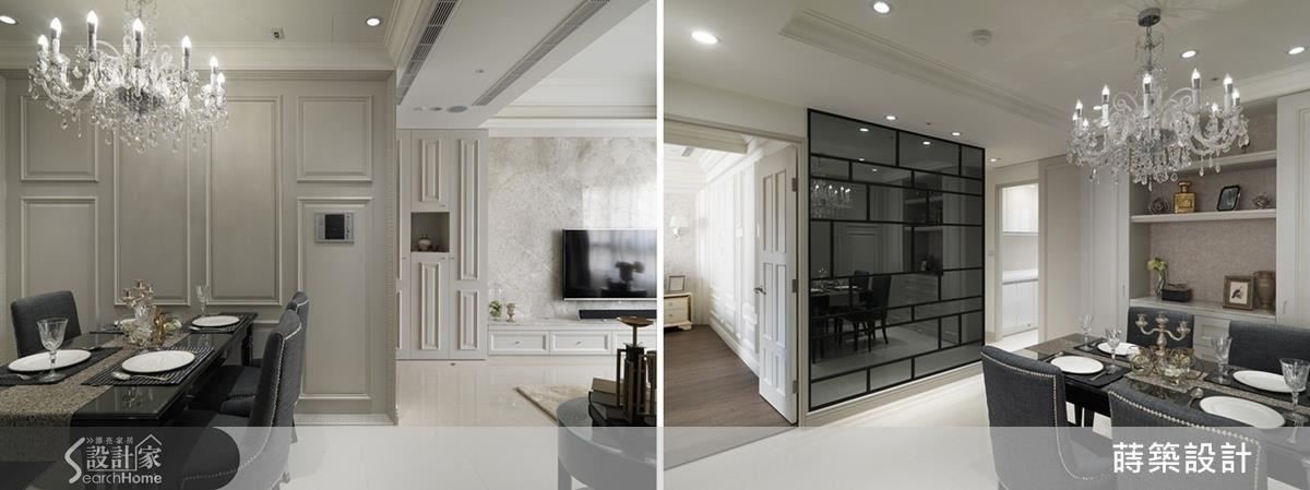 壁面上呼应客厅,以线板做出各种四方形组合,形成空间趣味(左图)。至于餐桌另一面墙,则以灰镜及黑框的四方形组合,除了利用镜面放大视觉空间,不规则形状切割活泼空间氛围,而灰镜内隐藏收纳元素,机能完备(右图)。