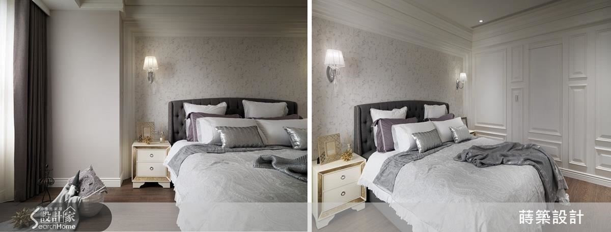 主卧室的床头在拆除大而无当的包覆后,改以素雅的墙纸取代木作装修,大大增加使用空间,不但放得下大尺寸的双人床,还能在靠窗处预留婴儿床的位置(左图)。