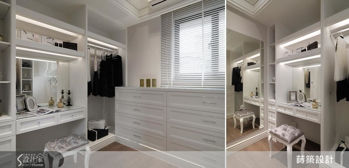 主卧的更衣室全部以白色柜体,配合间接光源、施华洛世奇的水晶把手,营造出明亮、宽敞又时尚的空间(左图)。