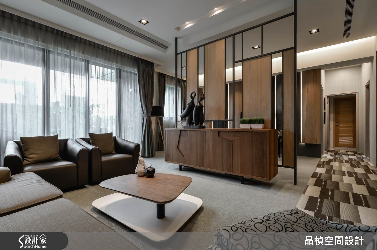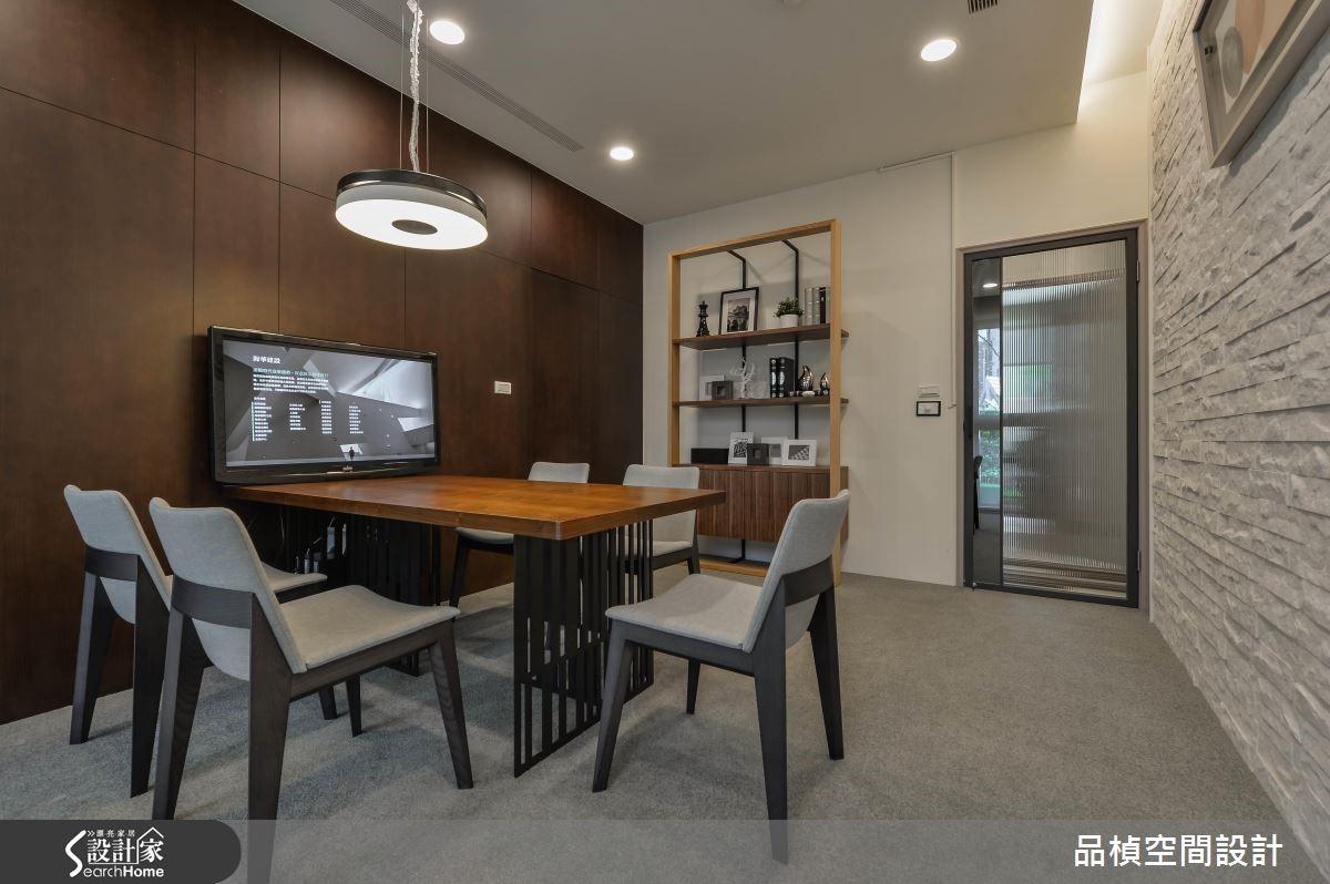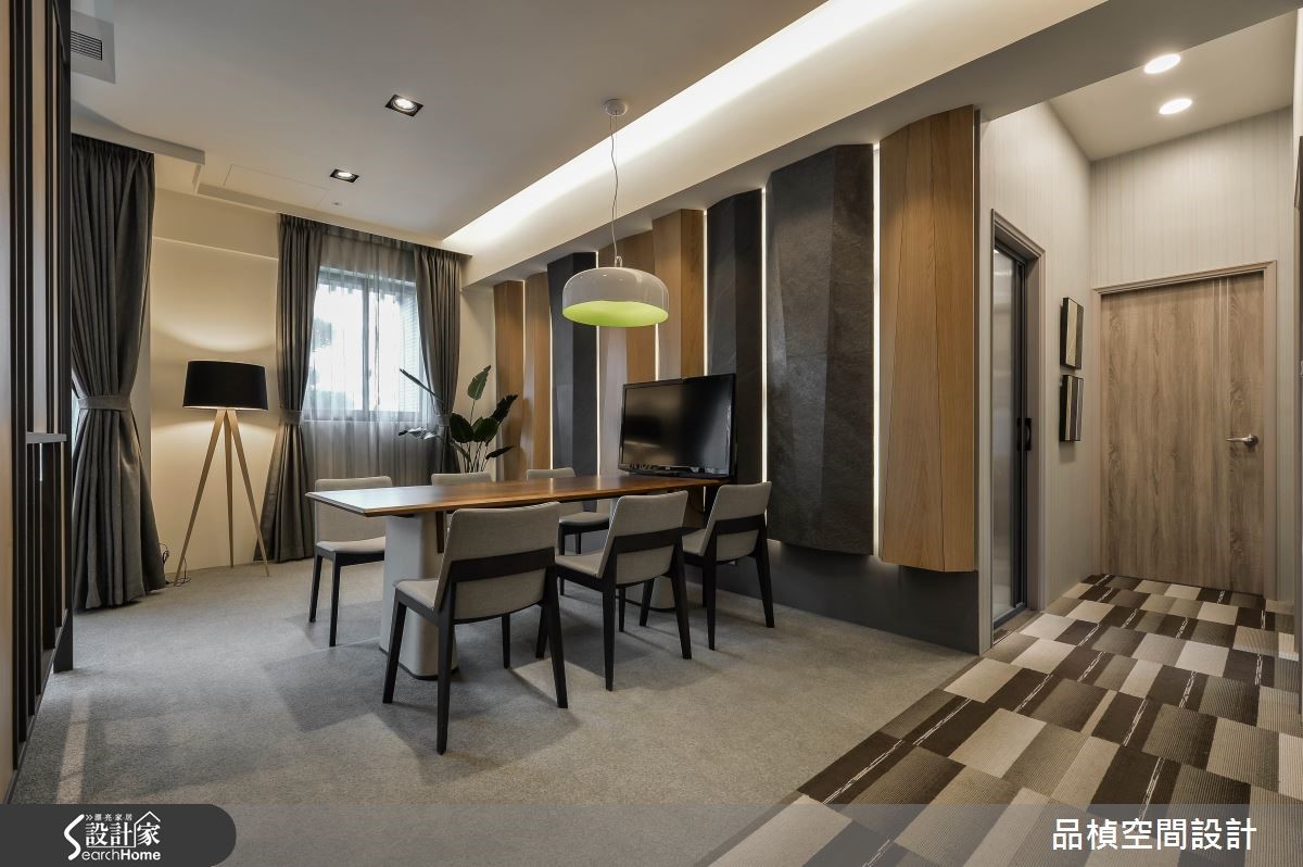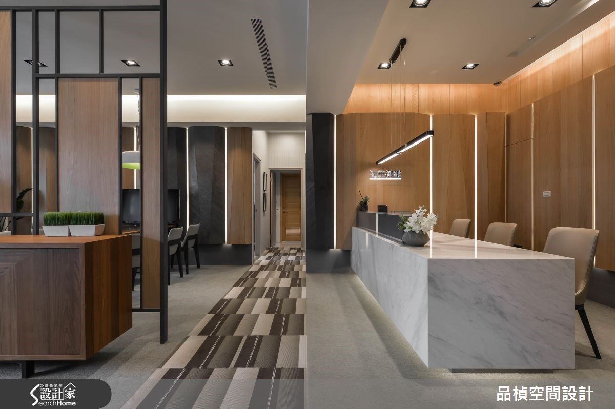 温润的木纹游走一室,彷佛将户外的自然情境引入室内,搭配间接内嵌光源的手法,柔和的光晕映照在粗犷的壁面、银狐大理石的吧台,搭佐空间里的雕塑对象、艺术画作,酝酿静谧、柔美的空间氛围。 【不同建材装饰 调和出层次感】三色长形拼接的地坪从玄关处开始蔓延,延伸至尽头的客用浴室,拉出风格廊道,界定出场域机能又串连起各个空间。铁件与木作搭接起镂空屏风,区隔出接待区与洽谈区,屏隔前方摆设木作矮柜与雕塑逸品,型塑艺术装饰。接待区里原始自然的石材、艺术创作与弧形交织的沙发椅身相互融合,创造人文风景;吧台区到洽谈区的壁面以木皮与石材装饰,冷暖相间的质材变化调和出层次感的室内情境。