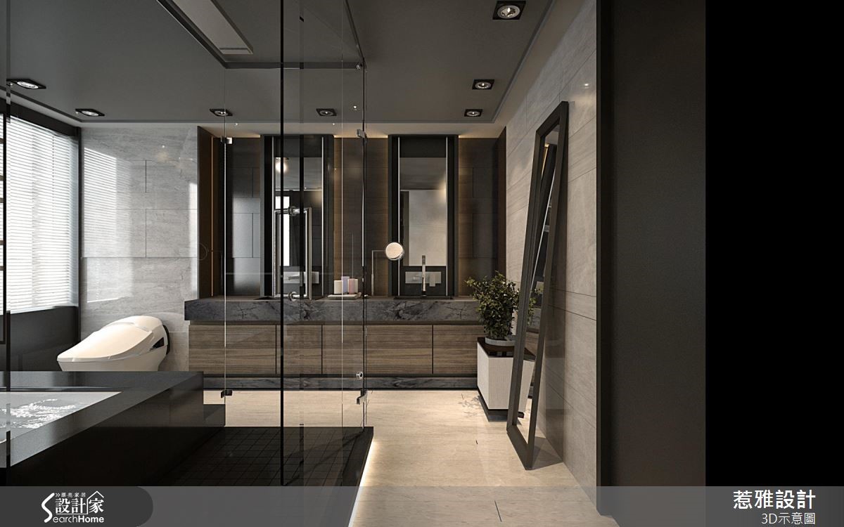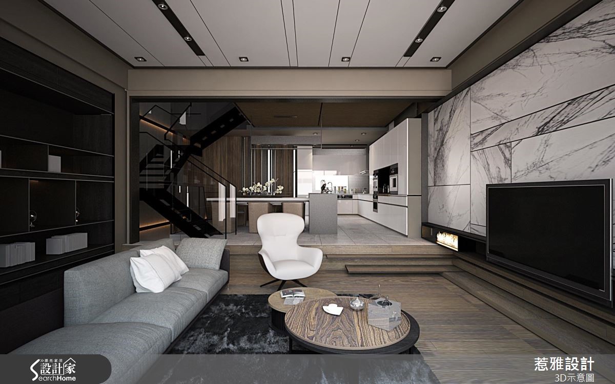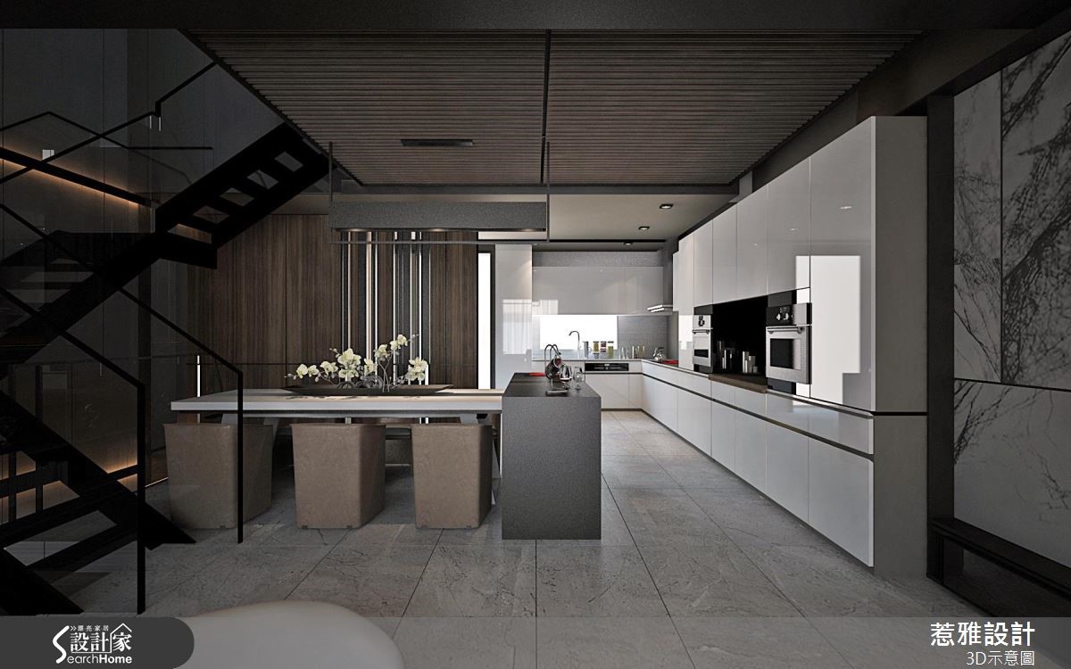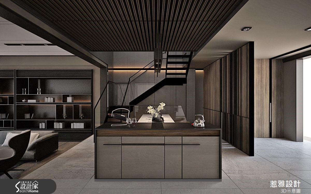没想到苏州园林的美景也能转化为室内的视觉风格,置身大宅内,每前进一步,彷佛翻开古色古香的扉页,眼睛所到之处尽是细腻纹理的石材、直线或沟槽所刻划出的立面,交织出壮阔空间。【黑铁与石材,交织利落风情】利落的现代风格成为空间的美学展演,黑铁、石材与木纹肌理的搭配下,鲜明的纹理在一片寂静氛围里呼之欲出,彷佛苏州园林里一幕幕奇峰异石与山水相映的奇幻景致。【铁件梯阶造型,细腻刻划层次】大面积石材与木作的安排,则创造出壮阔的视觉尺度,隐然大器又不失美学风范;铁件勾勒出阶梯造型且游走在空间之中,细腻的描绘出领域在空间里的转换与变化。【镂空隔屏,引进自然光源】餐厅与厨房之间则藉由木作屏风,些微划分出领域机能,屏隔中央以镂空的结构呈现,从厨房侧门带来的自然光,也随着缝隙漫延至用餐领域,展现洁净明亮的视野。