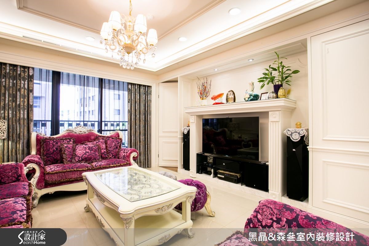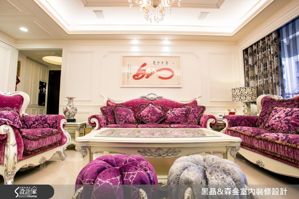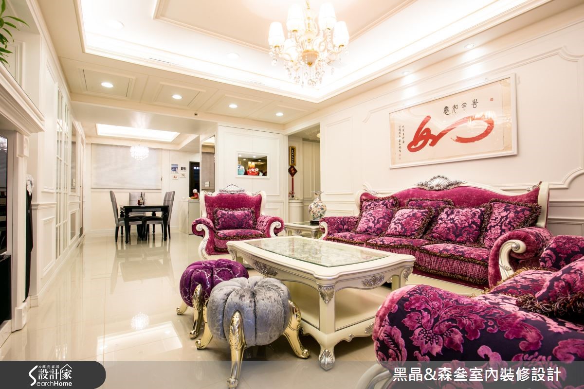新古典风格源于欧洲皇室,讲究设计细节与线板雕刻,体现生活的奢华与富饶,在设计师的考究与设计之下,172平方米的大宅将重点放在摆件、布艺搭配,并透过紫红色作为汇聚目光的主调,打造空间的华丽风采。【大胆跳色,打造空间视觉焦点】客厅以白色为主调,大胆采用紫红色绒布沙发作为主角,并以金属椅架妆点,展现优雅尊贵的质感,同时在仿壁炉电视墙、天花板与墙面等处勾勒古典线板,描绘净白而细致的空间表情,沙发墙则悬挂一幅中式字画,在新古典中蕴藏东方的人文脉络。餐厅设计主轴有别于客厅,少了雕花、线板点缀,呈现利落的现代时尚感,并融入玻璃烤漆、大理石等多元建材,塑造简白温馨的用餐场景;而寝卧则显得甜美温馨,配置碎花壁纸及窗帘,且大量摆设屋主收集的玩偶抱枕,诉说着居住者反璞归真的童心。