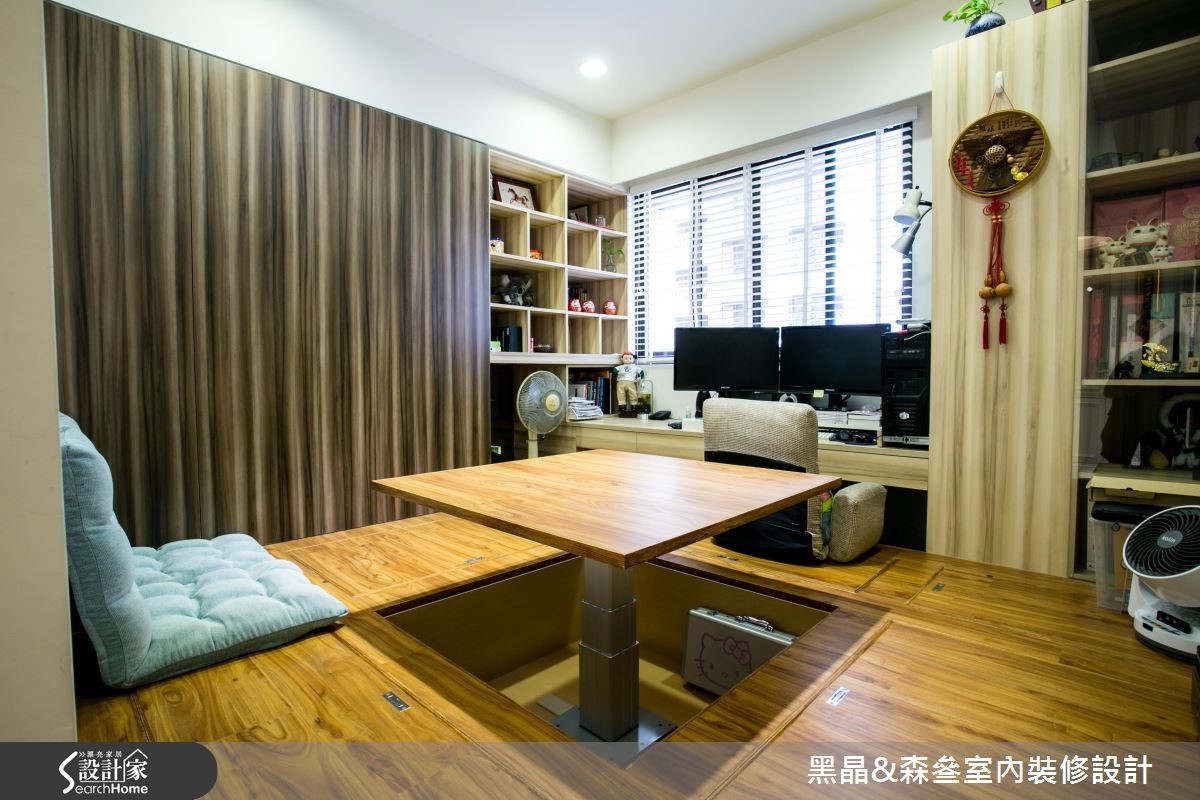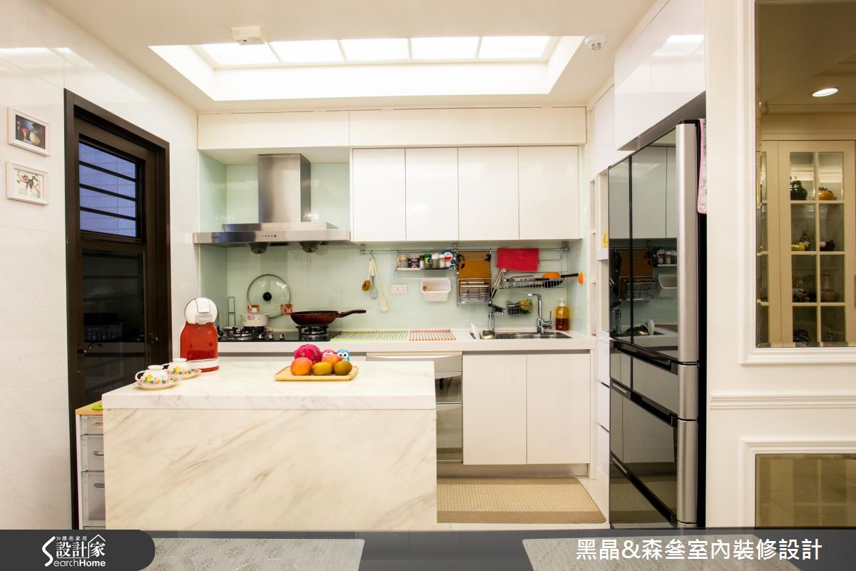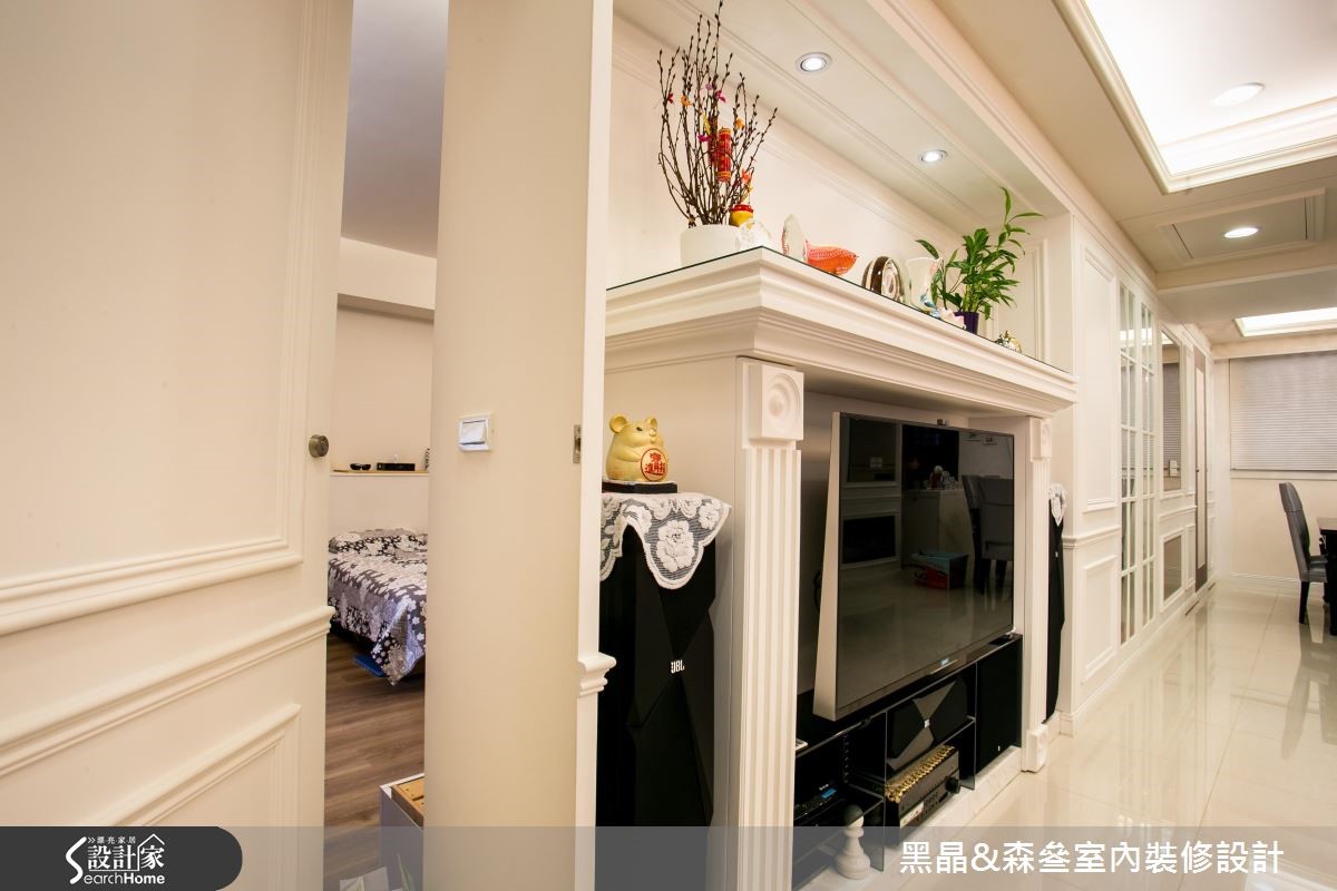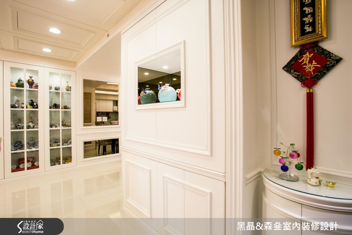 新古典风格源于欧洲皇室,讲究设计细节与线板雕刻,体现生活的奢华与富饶,在设计师的考究与设计之下,172平方米的大宅将重点放在摆件、布艺搭配,并透过紫红色作为汇聚目光的主调,打造空间的华丽风采。【大胆跳色,打造空间视觉焦点】客厅以白色为主调,大胆采用紫红色绒布沙发作为主角,并以金属椅架妆点,展现优雅尊贵的质感,同时在仿壁炉电视墙、天花板与墙面等处勾勒古典线板,描绘净白而细致的空间表情,沙发墙则悬挂一幅中式字画,在新古典中蕴藏东方的人文脉络。餐厅设计主轴有别于客厅,少了雕花、线板点缀,呈现利落的现代时尚感,并融入玻璃烤漆、大理石等多元建材,塑造简白温馨的用餐场景;而寝卧则显得甜美温馨,配置碎花壁纸及窗帘,且大量摆设屋主收集的玩偶抱枕,诉说着居住者反璞归真的童心。