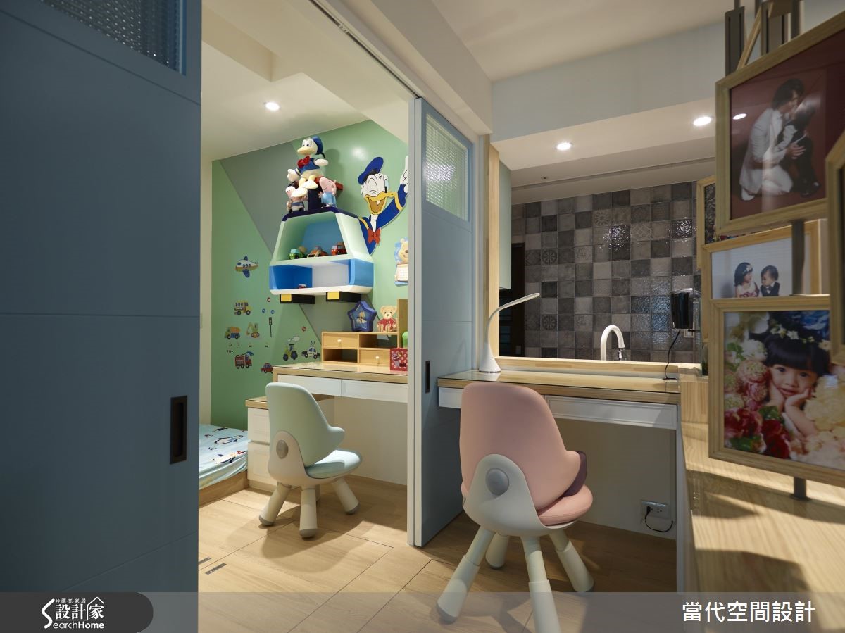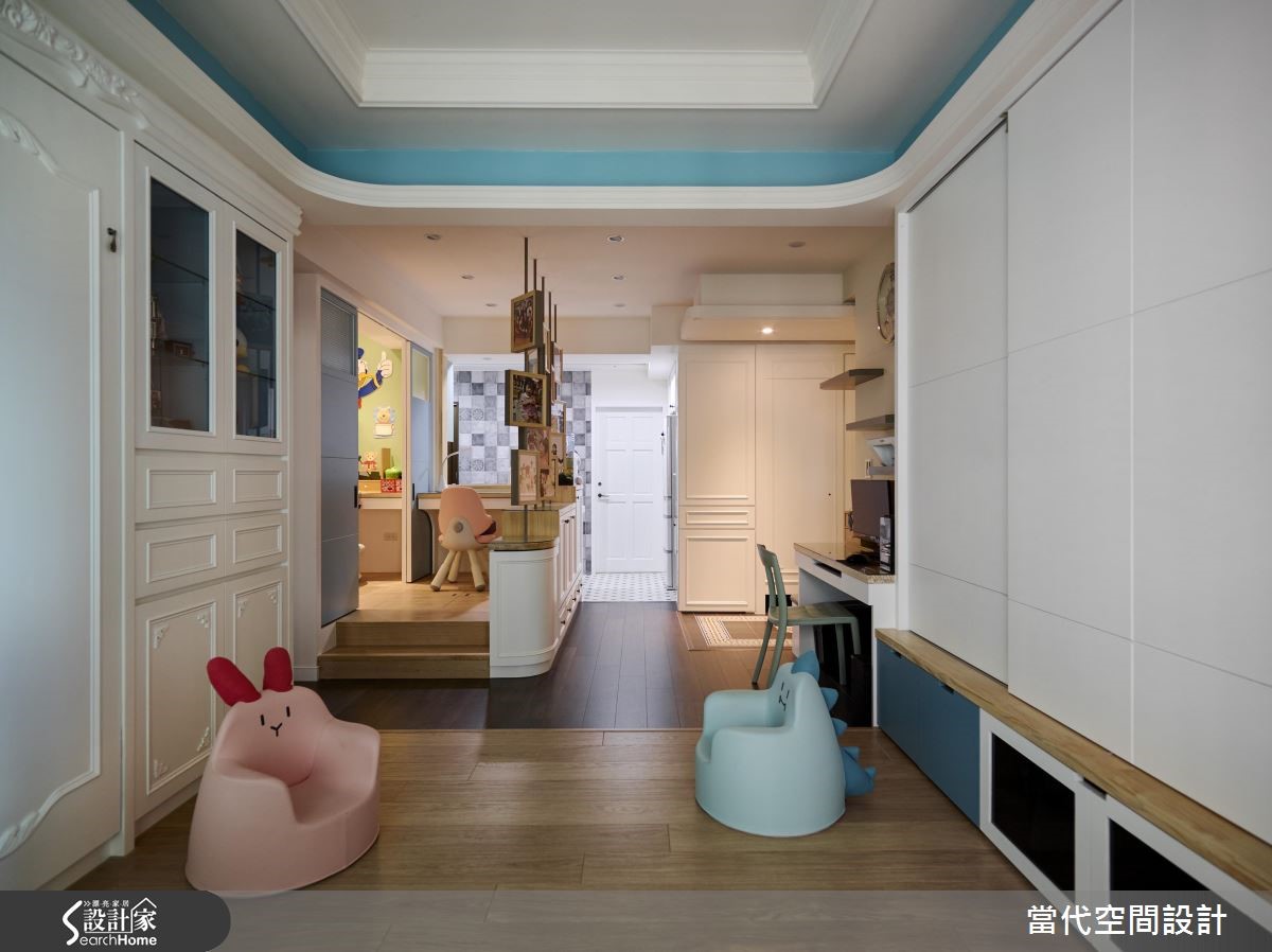 在83平米的二手房内,设计师以美式风为基底,挹注复合式设计概念,改善动线与收纳机能,并以照片妆点居家,藉由影像道出家的故事,增添生活中的情感与温度。【L型开放格局创造开阔动线】玄关处让地坪、壁面呈现黑白对比,再饰以雕花线板与图腾点缀,表现沉稳不失优雅的氛围,对应尽头的照片屏风设计,型构出一幅带有暖意的聚焦端景;并以此相片屏风作为中介点,往前后区划成客厅与厨房范围。于客厅铺述暖调木地板、整合多重收纳功能,给予可收放的桌体配置,兼具游戏、起居、休憩及餐厅主题;厨房则取各式磁砖铺贴出清爽格调,在 L 型格局的开放规划之下,不仅合宜使用空间,更与其他场域形成自在对话。【镂空相片墙兼具书房隔断功能】而充满趣味性的相片隔屏旁侧,是架高且弹性开放的书房,可作为孩子的阅读游戏之地,阖上浅蓝色门片,即与厅区适时隔绝、网罗安静与隐私,一旁的粉红色座椅,亦兼具了梳妆台功能,达成生活上的多元使用。