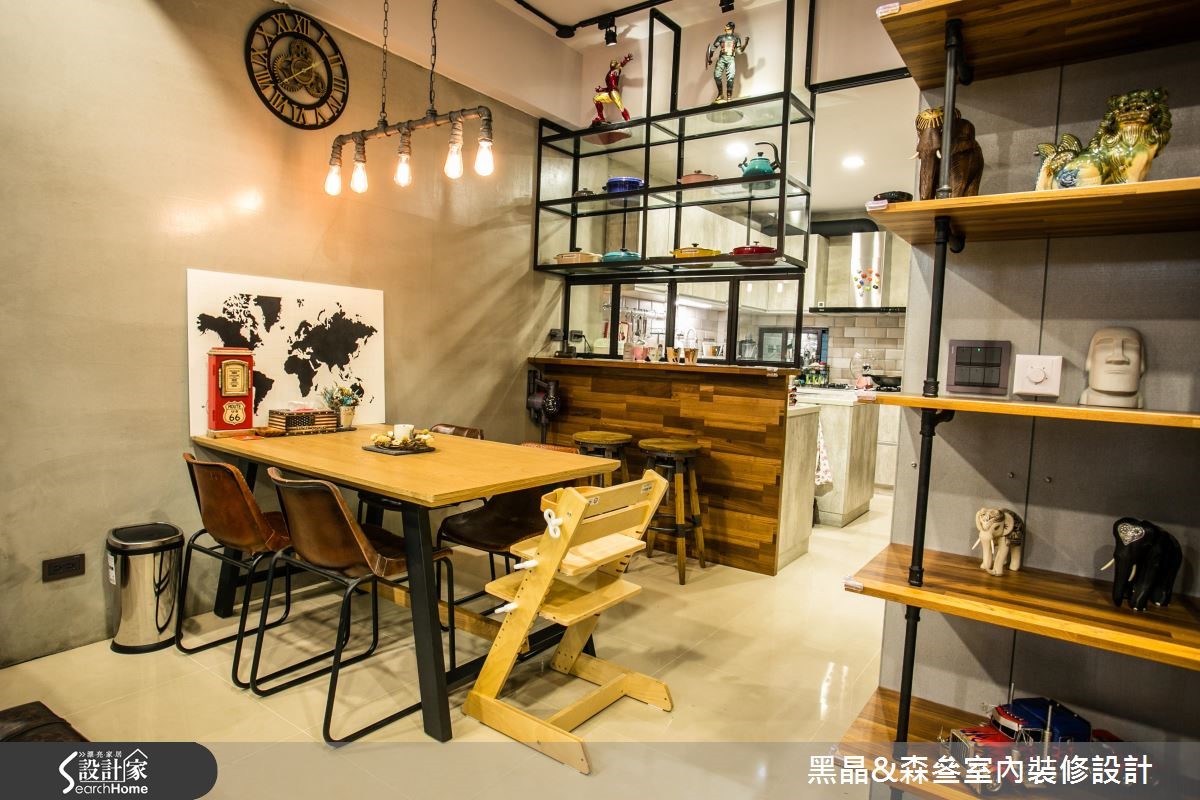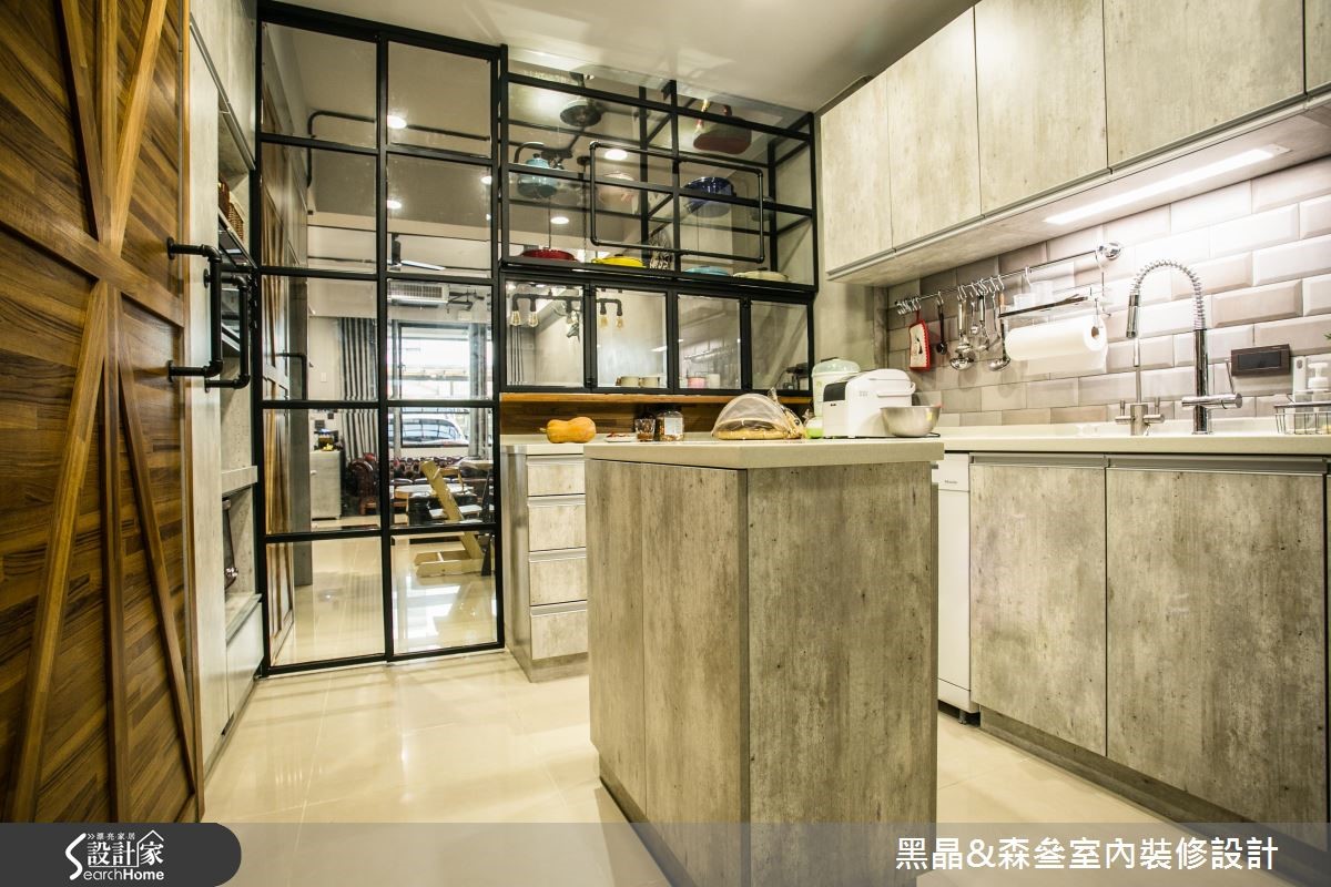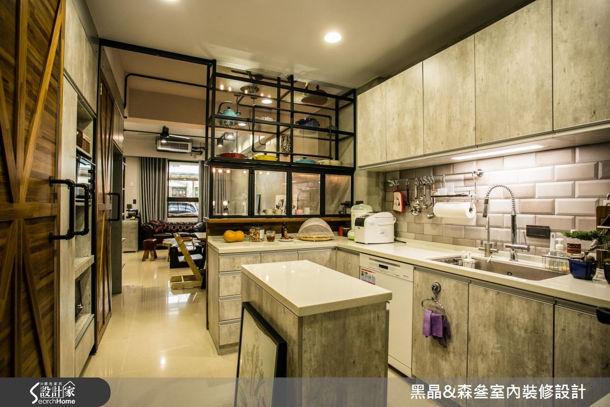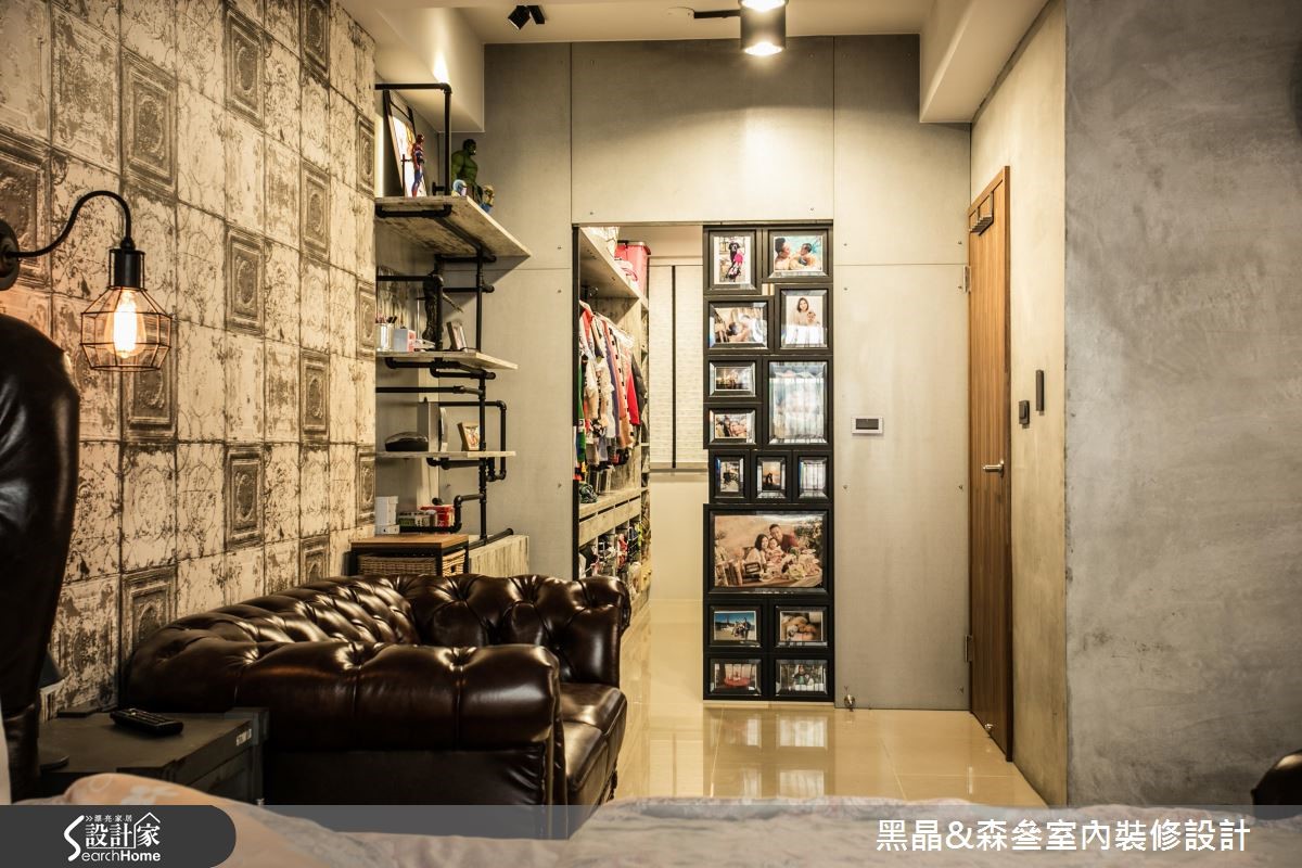工业风有时容易产生尖锐、冷冽的感觉,但设计团队别出心裁,善用带有复古气息的家具与单品,打造充满个性却不失温度的工业风格。【铁件线条,为空间增添层次感】212平方米的居宅,设计师以开放式格局规划,沙发背墙以清水模材质打造沉静现代的氛围,搭配各色木建材与皮革家具,平衡工业风的冷调并营造丰富层次;厨房以吧台与铁件玻璃门划分界线,更应用铁件层板收纳大量锅具,成为色彩丰富的特色装饰。主卧延续公共领域的浓厚工业气息,以壁纸搭配水泥粉光创造冷调,水管置物层架则为壁面增添丰富的线条感,而看似照片墙的拼贴设计,竟是暗藏通往更衣间的通道,兼具创意与童心,为屋主一家人的生活带来会心一笑的幽默感,同时体现工业风格的原味精神。