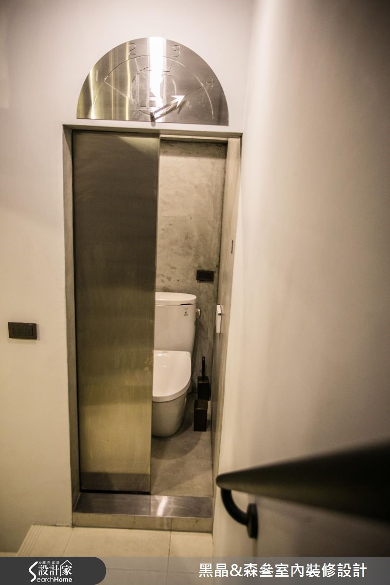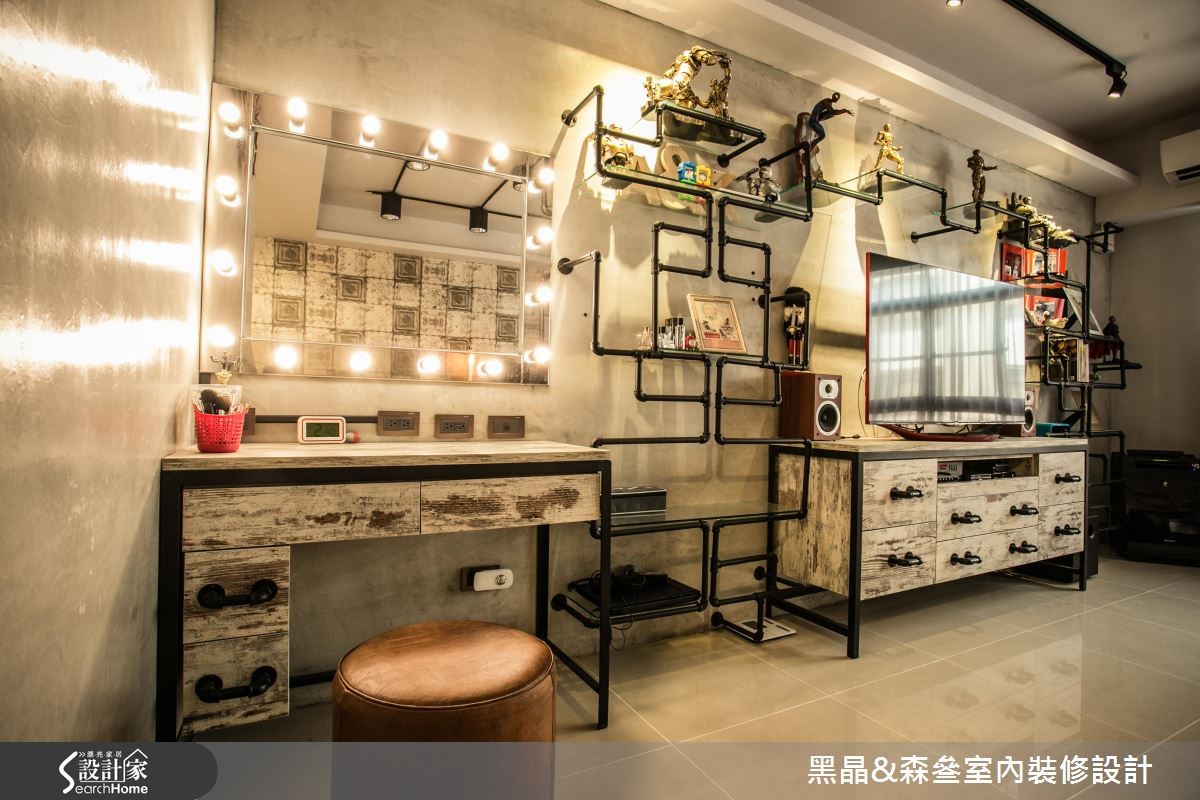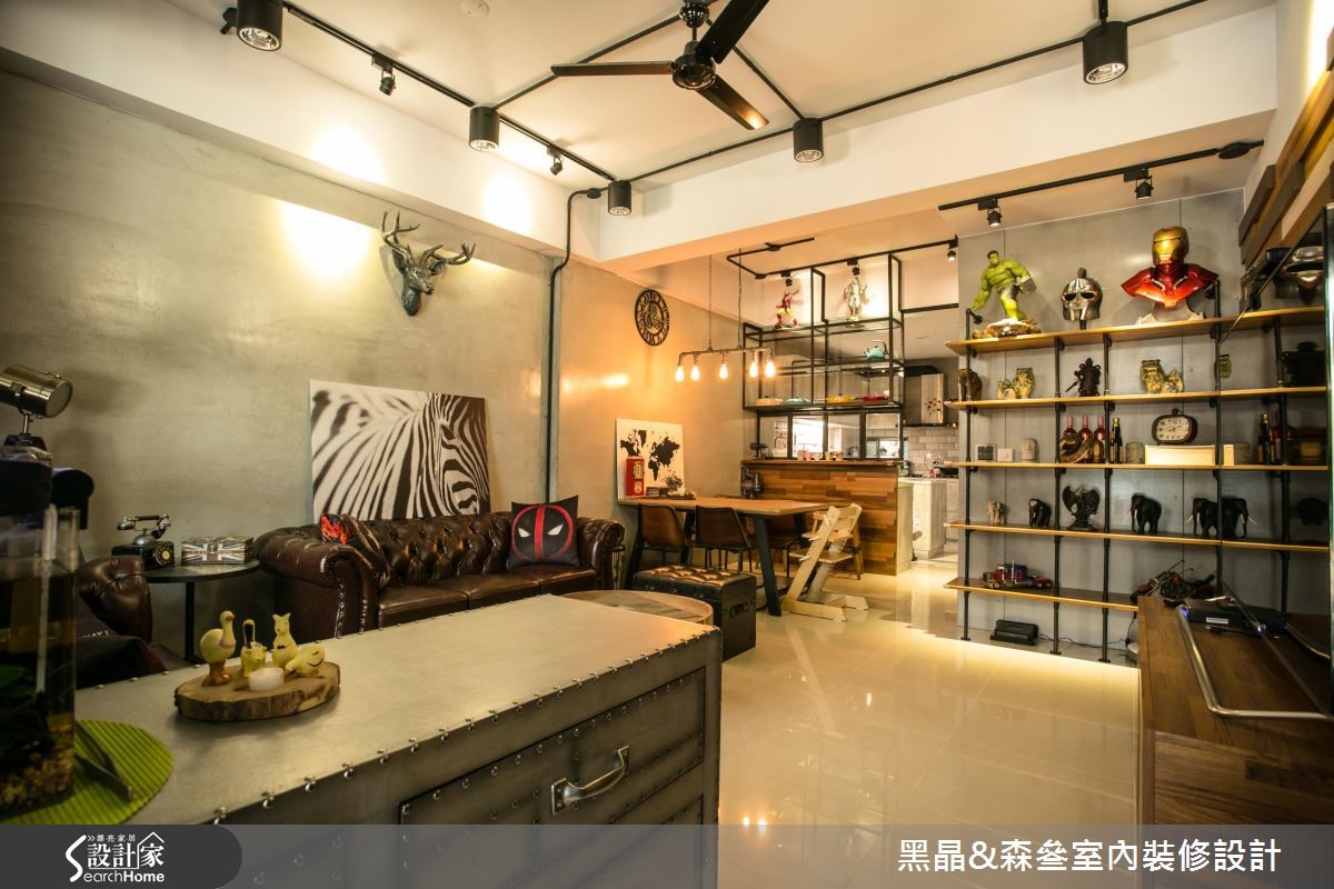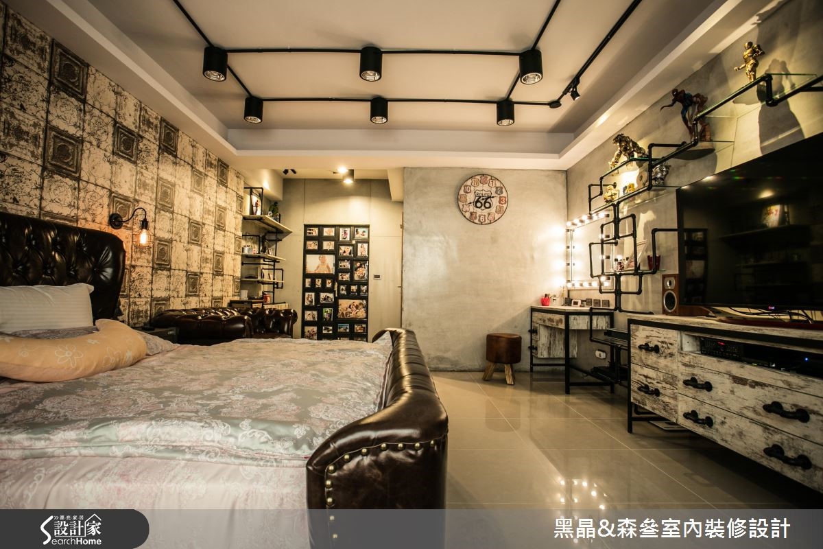 工业风有时容易产生尖锐、冷冽的感觉,但设计团队别出心裁,善用带有复古气息的家具与单品,打造充满个性却不失温度的工业风格。【铁件线条,为空间增添层次感】212平方米的居宅,设计师以开放式格局规划,沙发背墙以清水模材质打造沉静现代的氛围,搭配各色木建材与皮革家具,平衡工业风的冷调并营造丰富层次;厨房以吧台与铁件玻璃门划分界线,更应用铁件层板收纳大量锅具,成为色彩丰富的特色装饰。主卧延续公共领域的浓厚工业气息,以壁纸搭配水泥粉光创造冷调,水管置物层架则为壁面增添丰富的线条感,而看似照片墙的拼贴设计,竟是暗藏通往更衣间的通道,兼具创意与童心,为屋主一家人的生活带来会心一笑的幽默感,同时体现工业风格的原味精神。