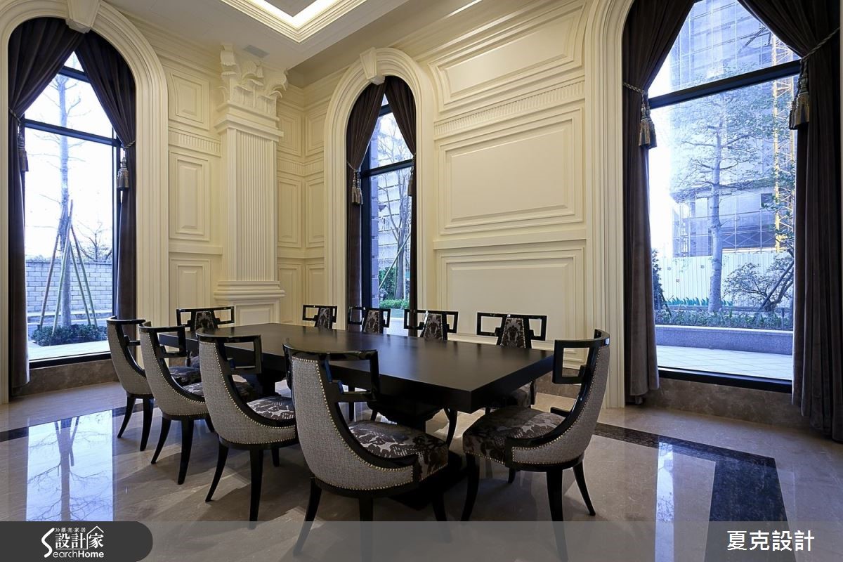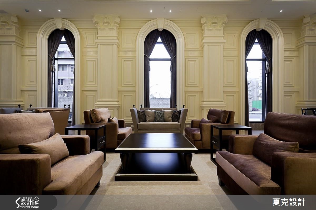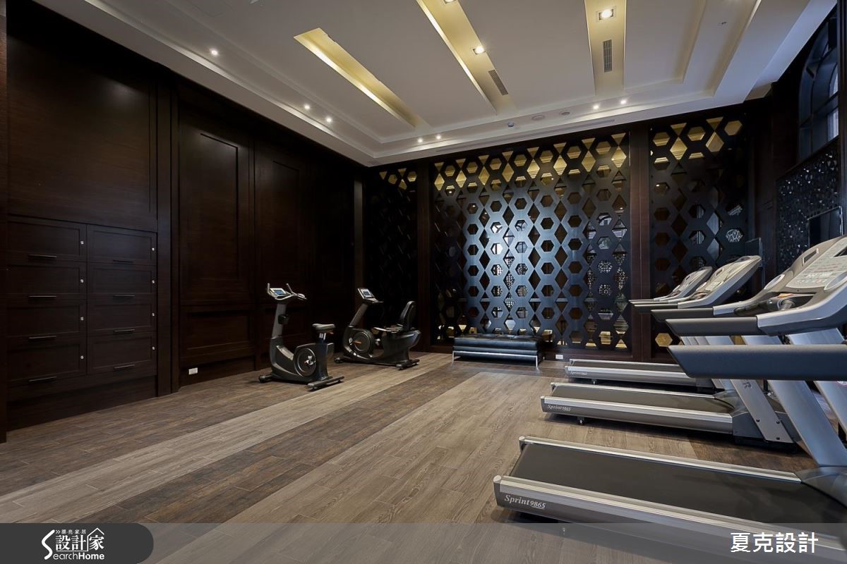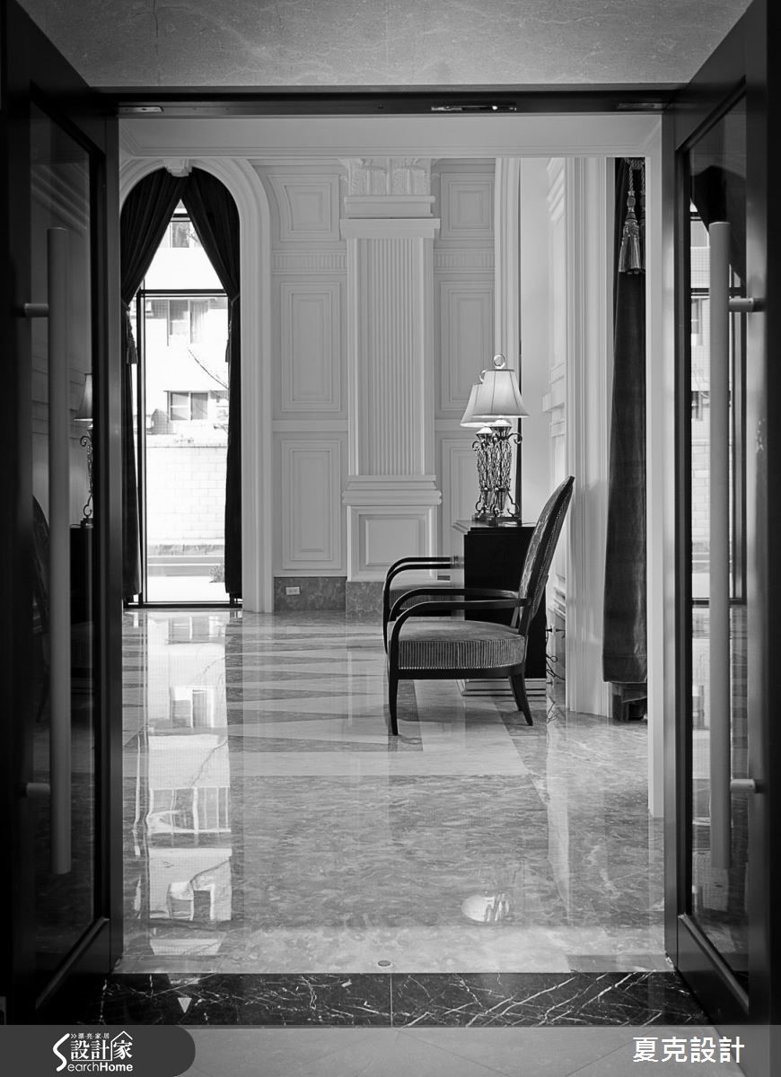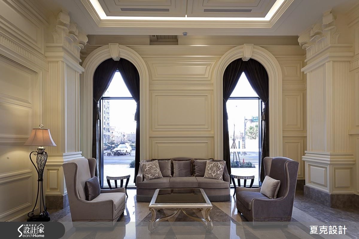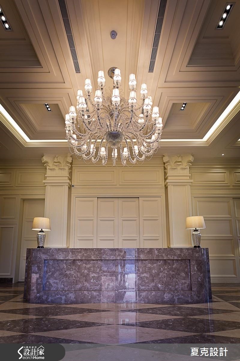 为了满足屋主每天回家都能真切感受到奢华幸福,从挑高五米的迎宾大厅至公设空间,设计师皆细腻地整合新古典与奢华风的设计元素,当进入挑高大厅,随即感受到双层吊灯的璀璨光芒,有如置身五星酒店的大器质感。【善用材质,砌出空间大器感】大厅以天然石材的接待柜台,以及大理石拼花地板展现气派风范;壁面则以做工繁复的线板为主,部分线板更嵌入金箔或银箔,展现精致的古典风格,不仅创造了宽敞的视觉效果,更透过细微的设计元素营造整体美学气势。除了硬装的规画,从迎宾大厅、接待区、联谊厅、健身房、阅读室等,皆搭配古典风十足的家具摆件,连贯的风格营造,共同丰富空间中的多元层次,带出不同的优雅气氛,同时塑造出精致的生活品味。