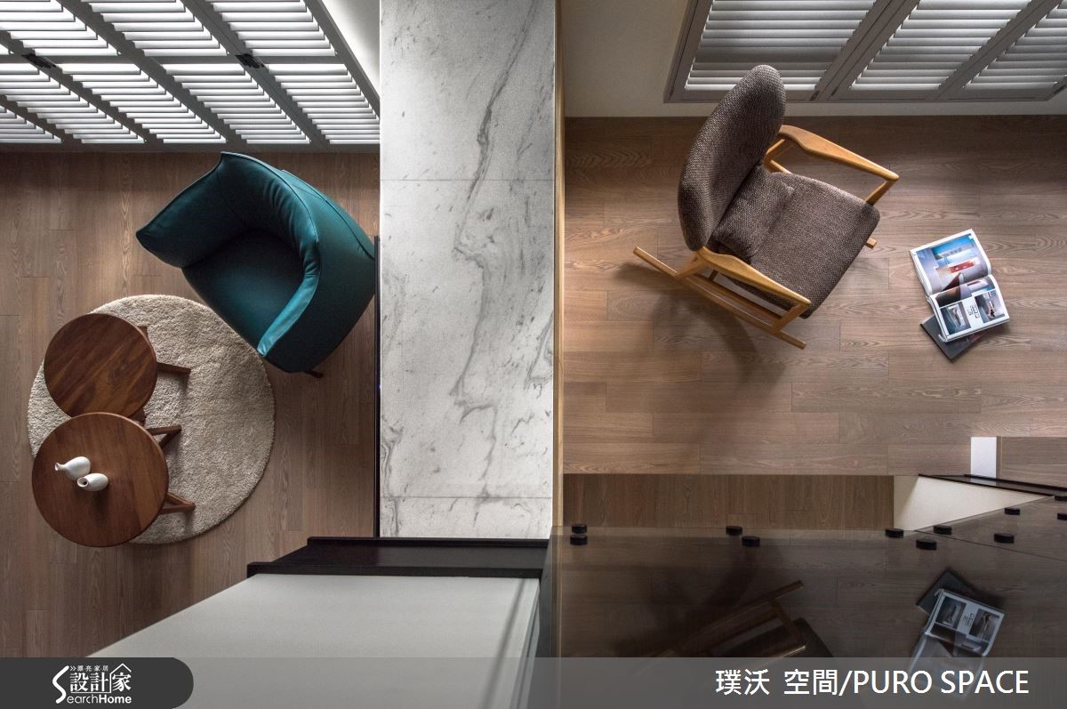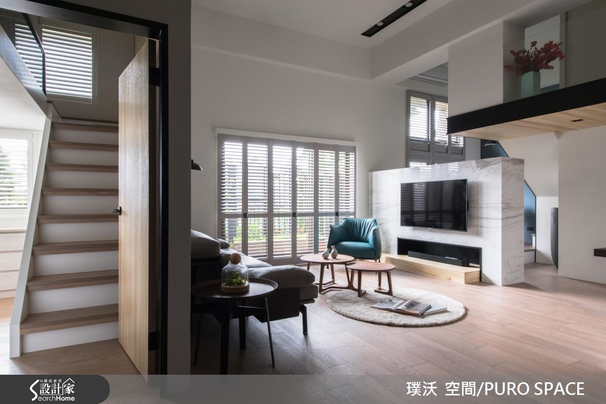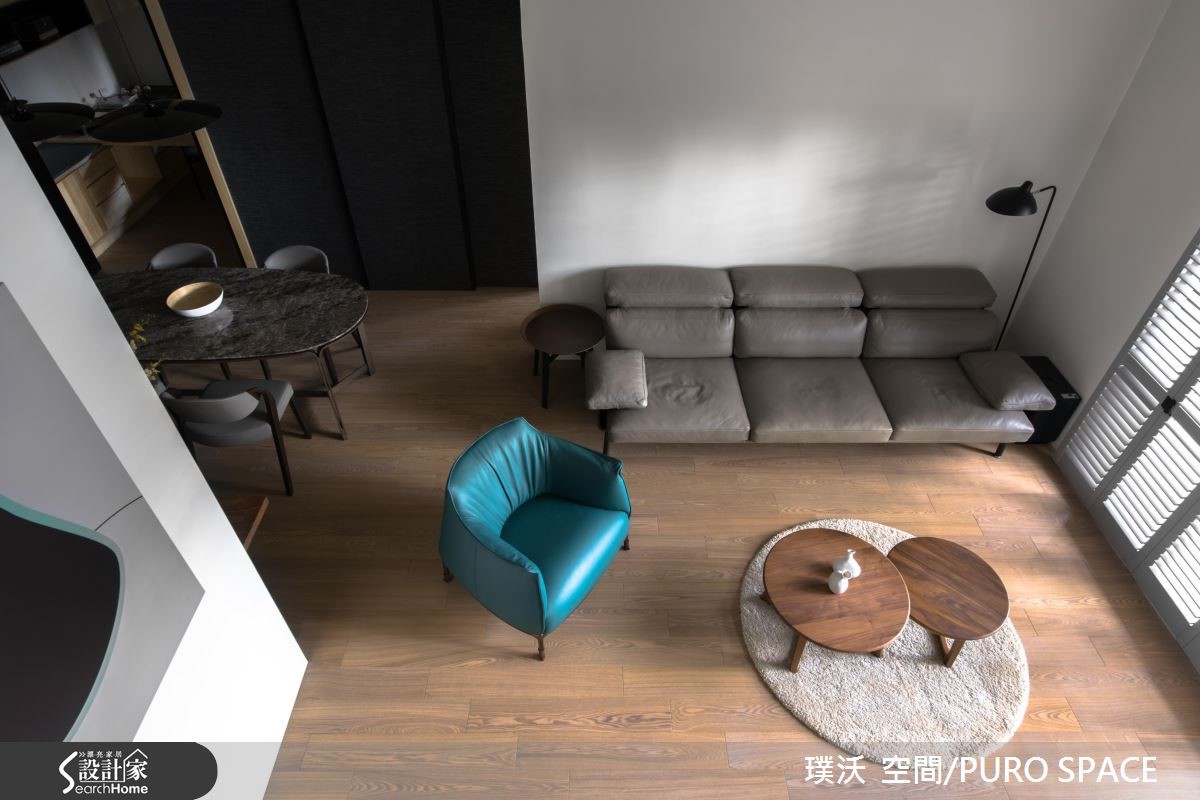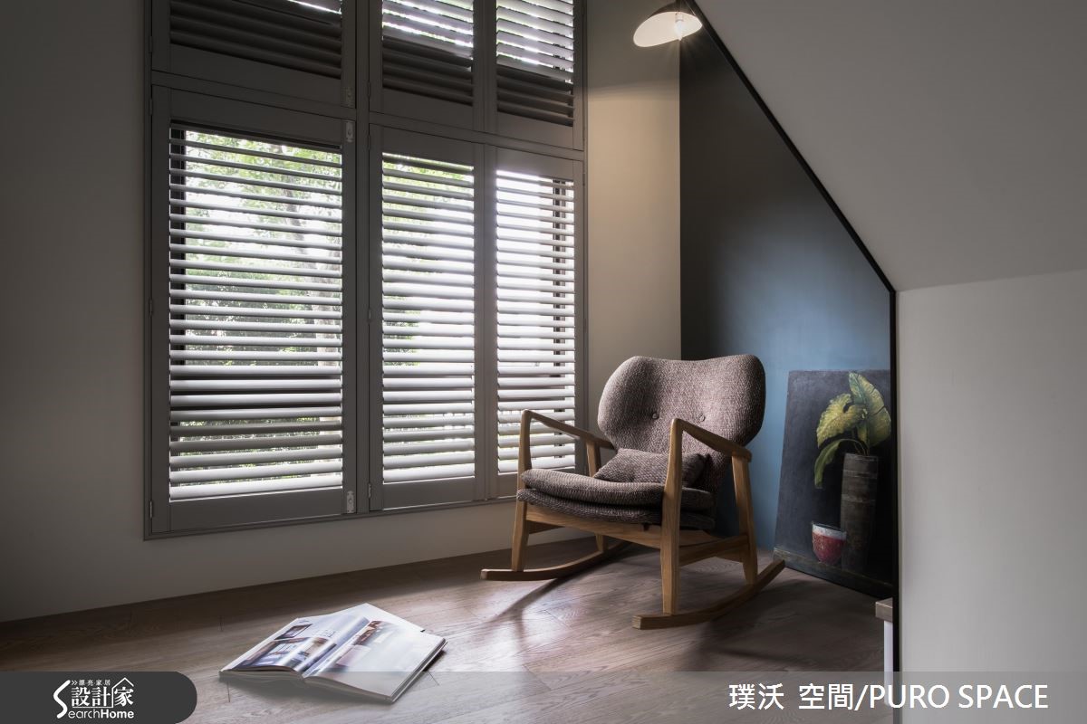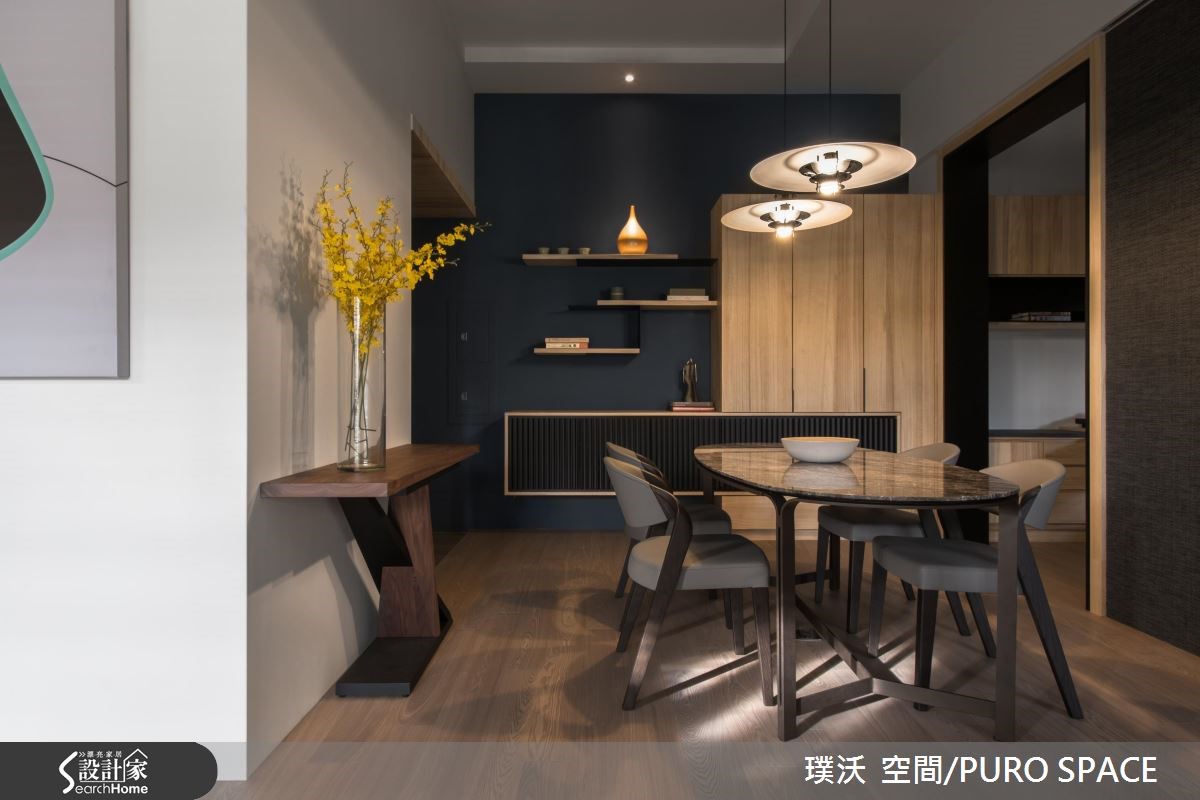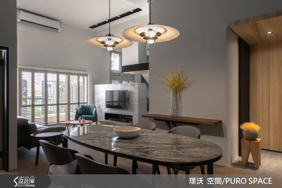132平方米的空间,是屋主作为退休后与家人同乐的休闲场域,因此在整体的规划里,藉由原本挑高的空间格局,利用简约纾压的木纹铺陈室内,百叶窗引入大量的自然光源,创造出静谧、明亮的日光宅。 【半高电视墙设计打破封闭的隔断】暖阳随着百叶窗映照入室,电视墙以半高的姿态坐落在公共区域之中,让自然光能够持续渗入后方梯间与畸零地,照亮空间的每一处;以半面电视墙体的设计方式,不仅打破封闭的隔断,更形塑一股流动的氛围,创造出宽敞气度。【餐厅以深色调营造温暖用餐氛围】餐厅区的壁面以深色调铺陈,营造出沉静、温润的用餐氛围,串连柜体与层板的方式,打造展示与机能兼备的场域;整个公共空间里在角落或领域转换处摆设风格独具的家具或软件装饰,让视觉所到之处皆是景,展现艺术与人文交会的质感雅居。