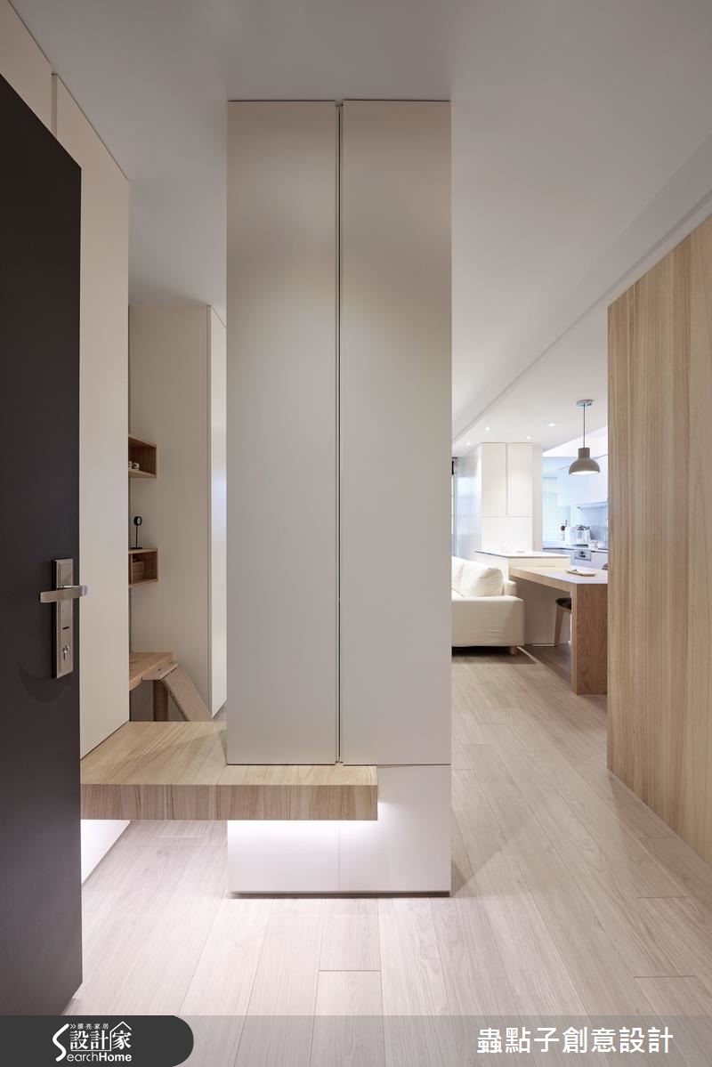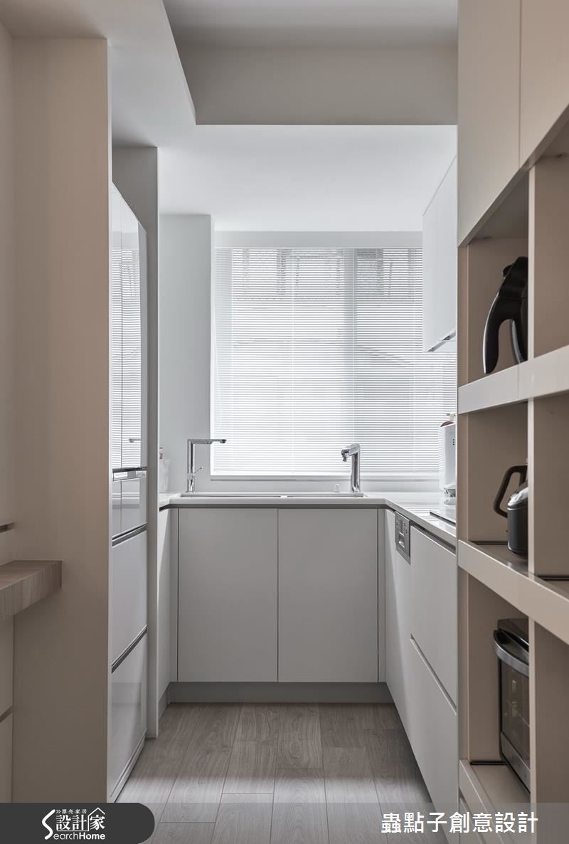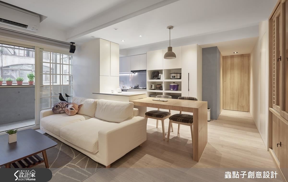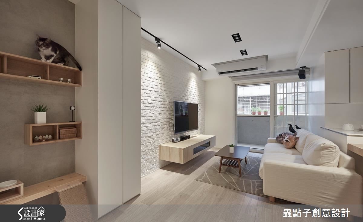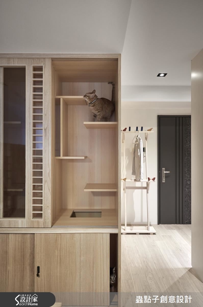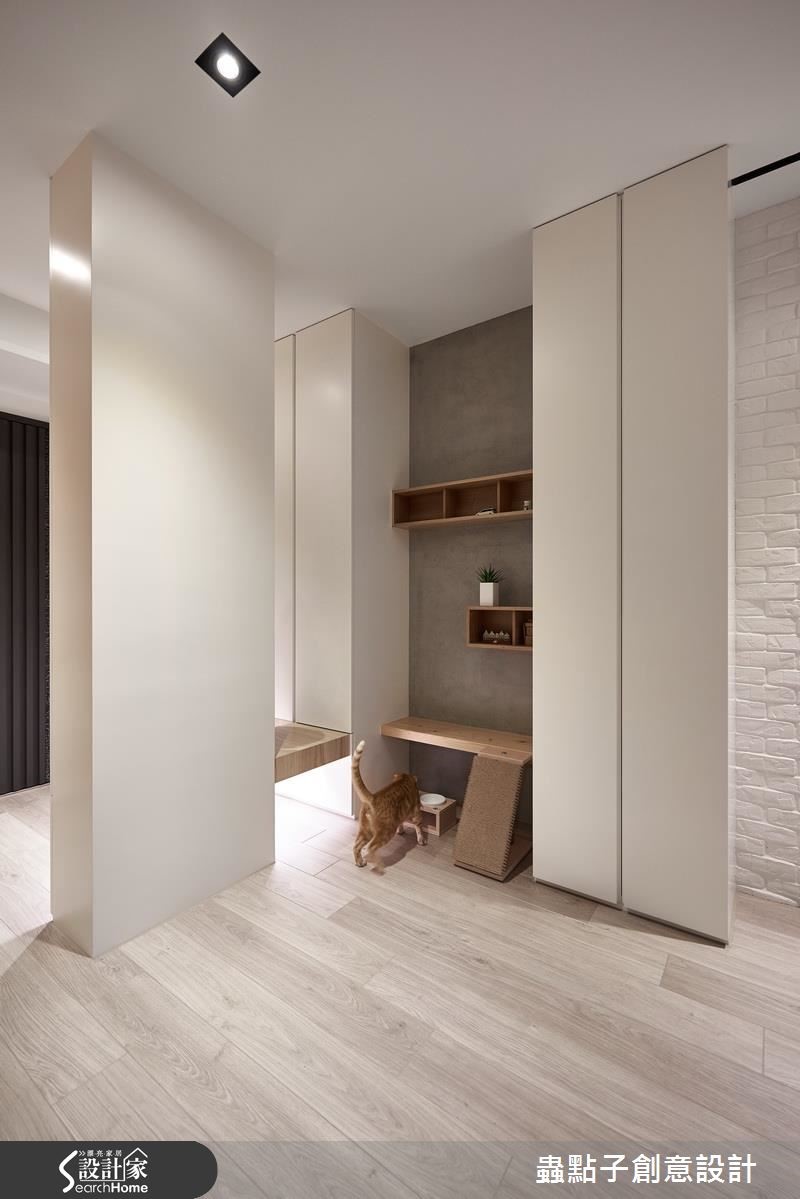 柔美的光晕感染全室,木作的猫房、游戏区替简约感的疗愈空间挹注些许活泼与趣味,实现一处与毛小孩的幸福生活。 【开放式设计,让空间更显宽敞】旋开大门进入室内,玄关处延伸鞋柜,搭接一座腾空木作平台,成为进出门的穿鞋区,也让猫咪能够恣意游走其中;在方正的格局下,客、餐厅相融为一,落地窗外的阳台摆放几株植栽,调和闲适悠然的生活节奏。将厨房调整为开放式,让公共空间更显宽敞辽阔,让猫咪的生活领域与屋主日常的动线相融,交织出互动良好的日常情境;喜爱下厨的屋主,享受以美食款待三五好友,因此于厨房区配置吧台,并藉由窗台设计,导引户外充沛的光源,让有限的空间顿时扩大不少。