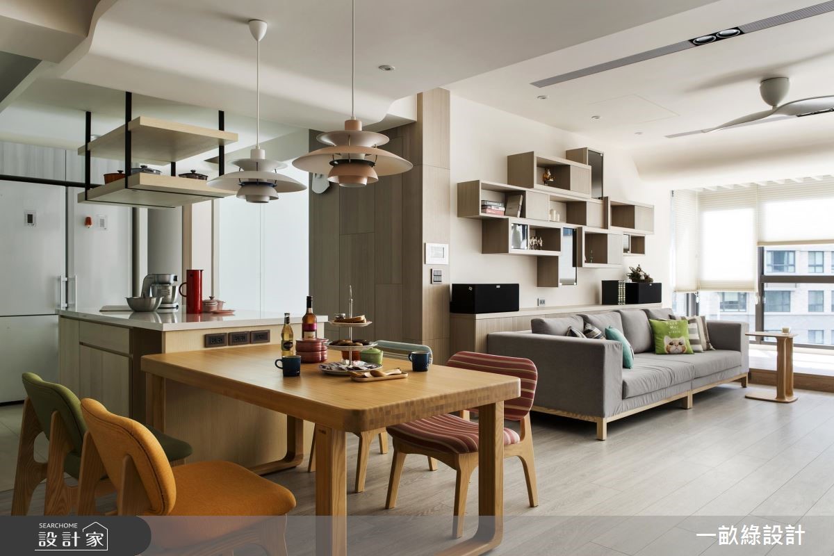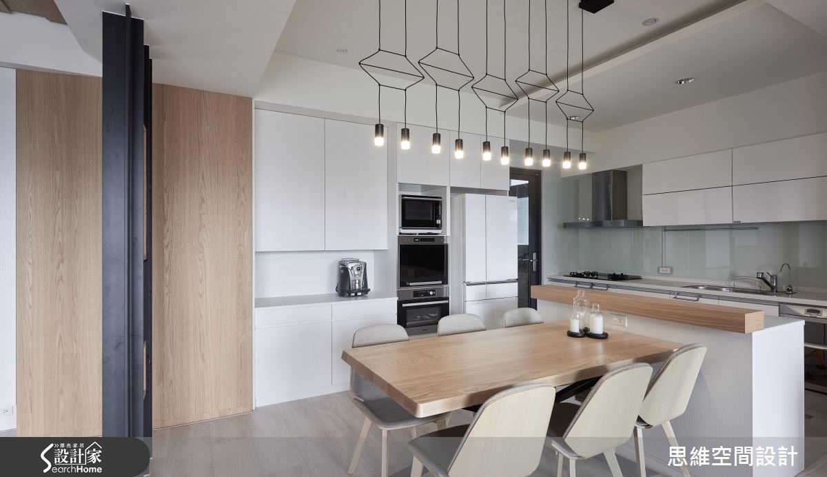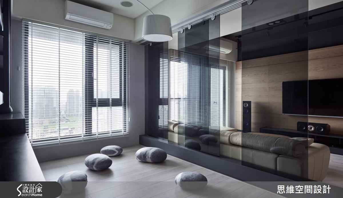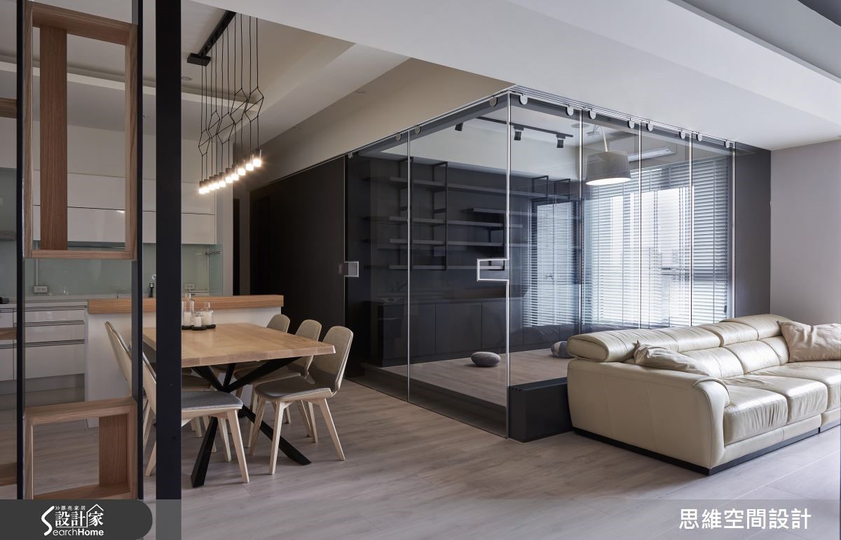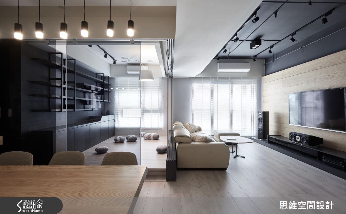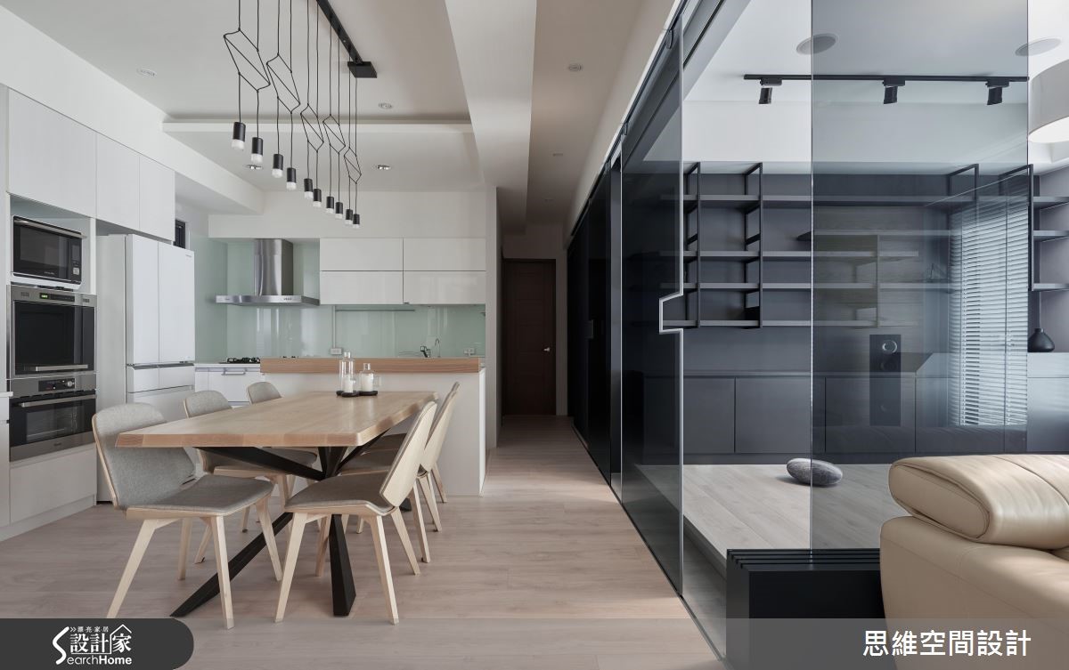 设计团队从客变开始(客户变更;建设公司在施工阶段依照屋主需求,预先提供变更格局、设备等服务),为屋主一家三口规划亲子宜居的生活动线,抹除原先次卧隔断的传统规划,改造为开放式多功能房。不仅放大公领域的感受,更给予居住成员亲子互动流畅的宽敞空间。 【玻璃门片取代隔断,视觉更通透】玄关处以镂空柜体设计,兼具隔屏功能,适时遮掩视线。客厅电视墙以大面积白橡木皮为视觉主轴,天花则搭配明管漆成黑色,别具另类的现代风情。沙发后方的居室改以L型玻璃门片取代实体隔断,垫高的木质地坪提供了游戏间、书房与客房等多维机能。将开放式餐厨置于另一侧动线,并利用中岛吧台划分烹饪与用餐空间,纯白色系搭配木作与细致的铁件造型吊灯,增加用餐氛围。主卧空间延续木作的气息,将卫浴入口隐于大面积木作门片后方,推拉门设计更兼具电视墙功能。