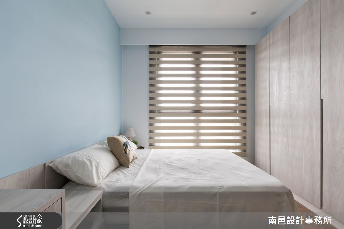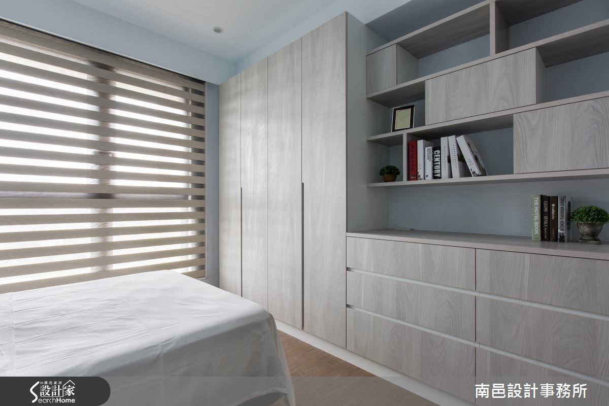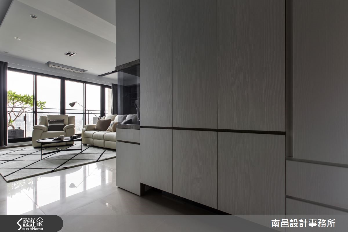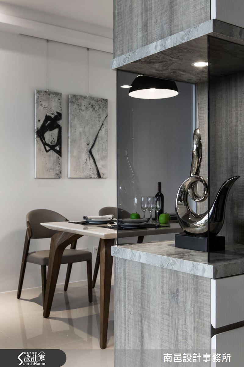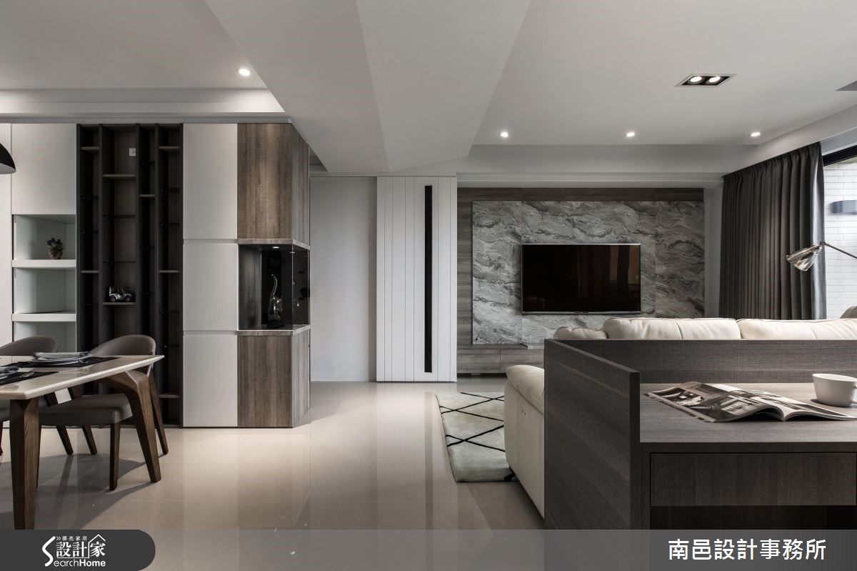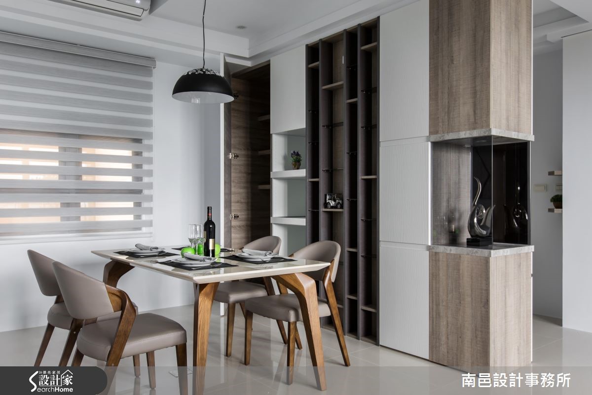 以简单、干净的白色调铺陈室内,在自然光源的洗礼下,映照出宽敞、俐落的空间视感。木纹质感的局部安排,挹注些许暖度,表面细腻纹理的点缀,引出自然写实的生命气息。 【兼具美学的柜体设计】先以一座双面柜区隔玄关与餐厅领域,进入公领域转角处的中央柜体,以灰玻围塑雕塑品为展示陈列,引入动人的美学气息。面向餐厅的柜子,则以开放式层架作为呈现,与后方书柜相互呼应。以机能需求为设计,系统木工化的方式,让柜体兼具实用与设计感。为了修饰走道上的大梁结构,利用倾斜的天花板造型作为设计,考量可能产生的压迫感,设计师选择纯白的漆面来诠释空间,让视觉有开阔放大的效果。再搭以晕黄光源与木纹肌理,不但没有冰冷的感受,反而酝酿温暖的人文质地。