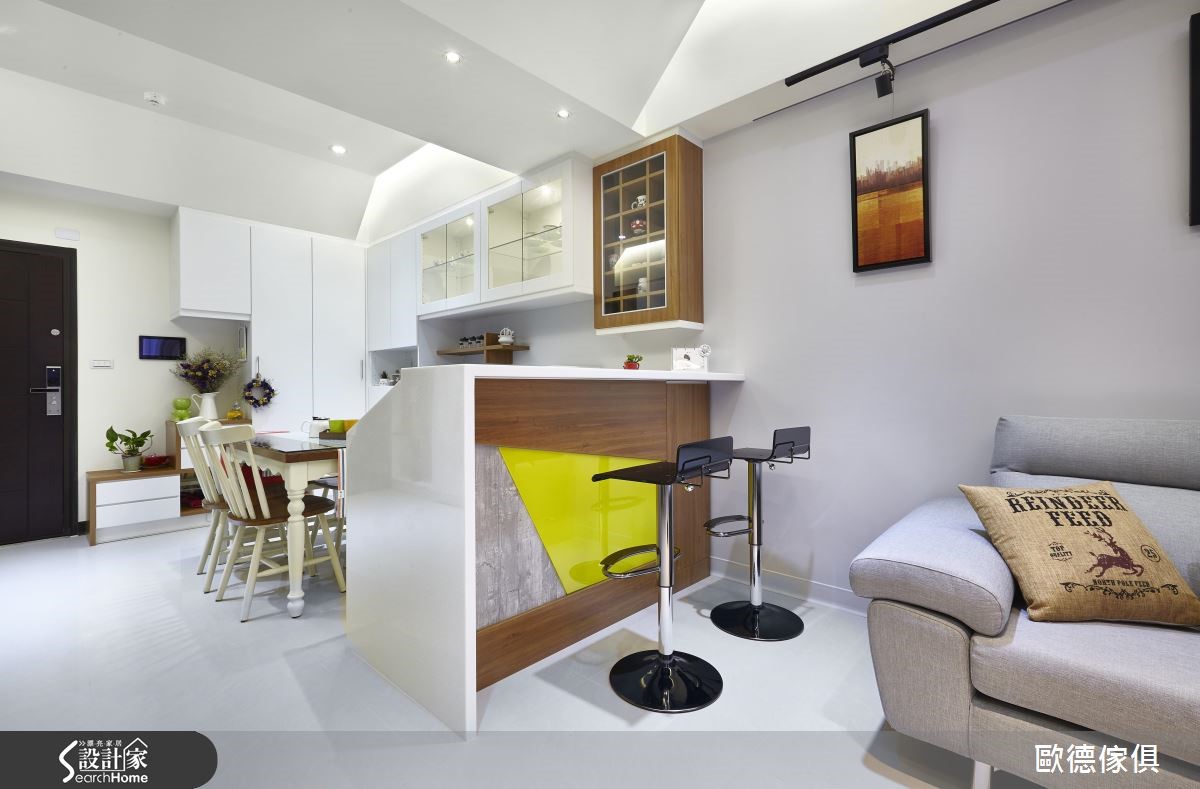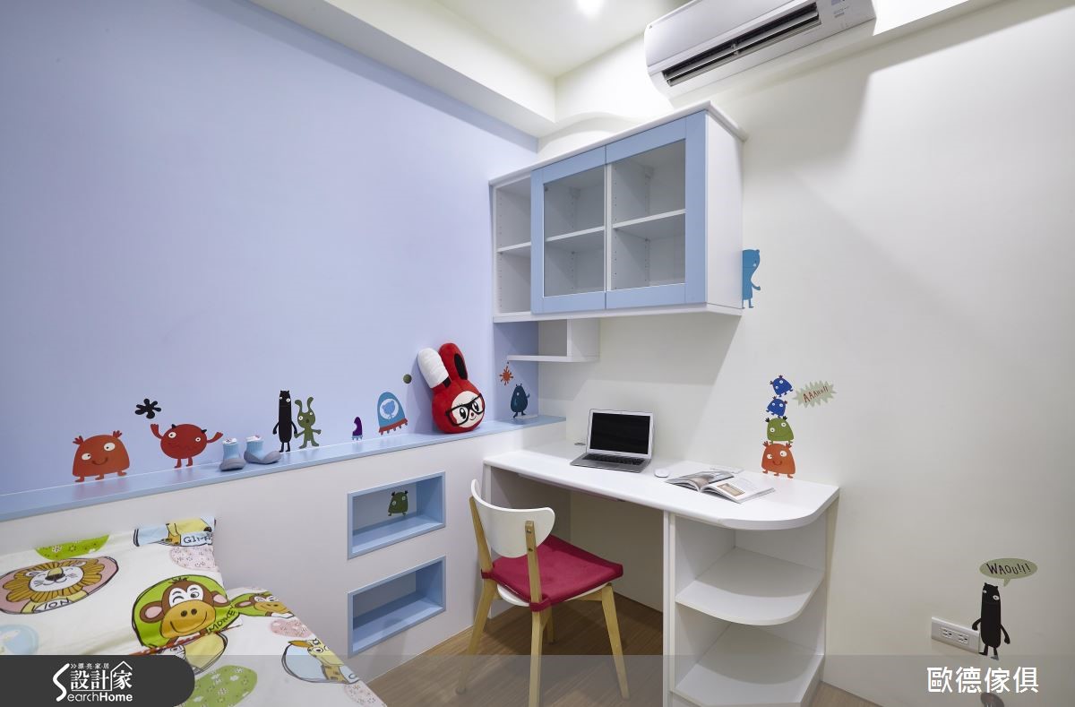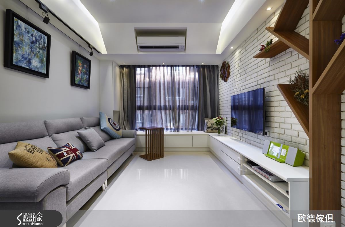 设计师在99平方米空间内结合各式纹理与色调的系统面材与家具,不仅精准控制预算,更打造实用、美观兼具的三口居家!【定制系统柜,满足收纳与展示】为放大公共空间,客厅与餐厨采开放式设计。入门处结合开放层架与封闭柜体的收纳规划,满足收纳与展示的需求,一旁的鲜绿色烤漆玻璃,则巧妙化解玄关凹凸壁面问题、创造清新利落的视觉感,同时兼具留言、涂鸦功能。客厅利用系统层板在文化石墙上打造树状造型,彰显了系统家具的多元变化性,而下方电视柜则呈L型延伸至飘窗,为客厅增添更多休憩空间,并进一步扩充收纳机能。主卧以拉门设计打造床头墙,不仅消弭床头窗的设计,更达成美化目的。