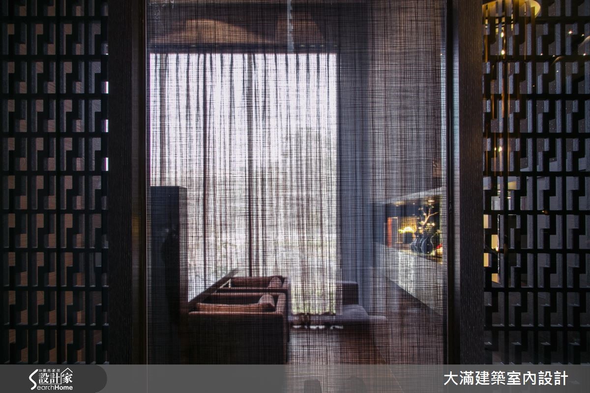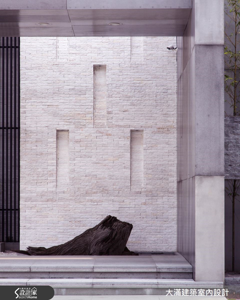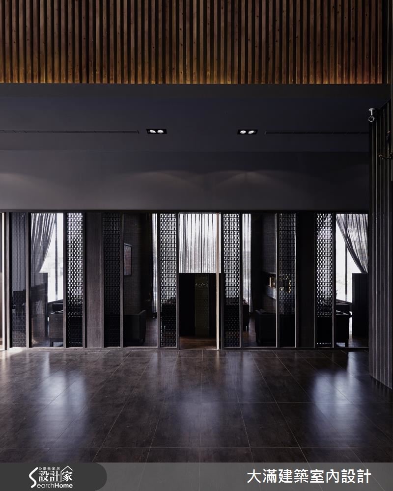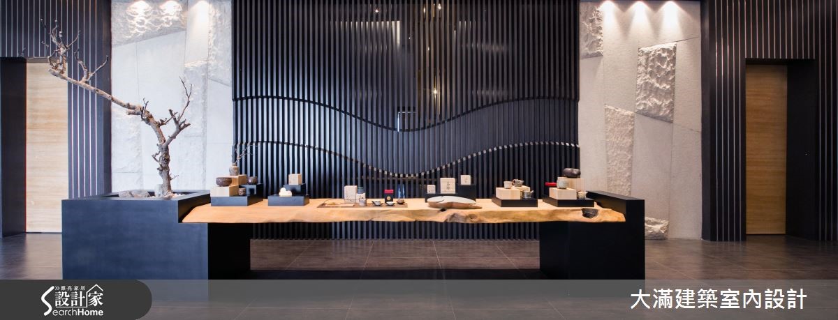 1008平方米的接待中心,设计师以东方美学、自然素材为基础,并导入多元艺术作品,除去商业空间的造作匠气,打造出一处集结文化与艺术的殿堂,带给观览者独特的心灵飨宴。【纳入自然素材,体现禅意美学】建筑外观设计上,于立面融入垂直与水平线性,伴随着光影穿透,照射在凿面的石材肌理,呈现独特的视觉画面,并于左侧规划一池水景,右侧则以绿植装饰,在山水之间营造东方风的内敛温雅。进入室内,中央悬吊一盏台湾桧木主灯,藉由木质与垂坠造型烘托光晕之美,汇聚大器优雅的焦点;内部包厢采以通透格栅、中式窗棂等相互交错,除了区域的隐私性,并模糊过于分明的界线外,更纳入微幽光线,塑造若隐若现的静谧美感。