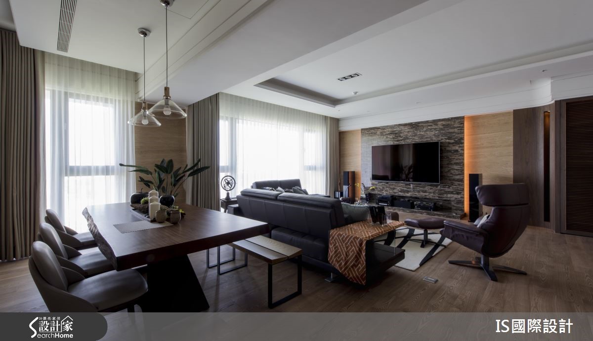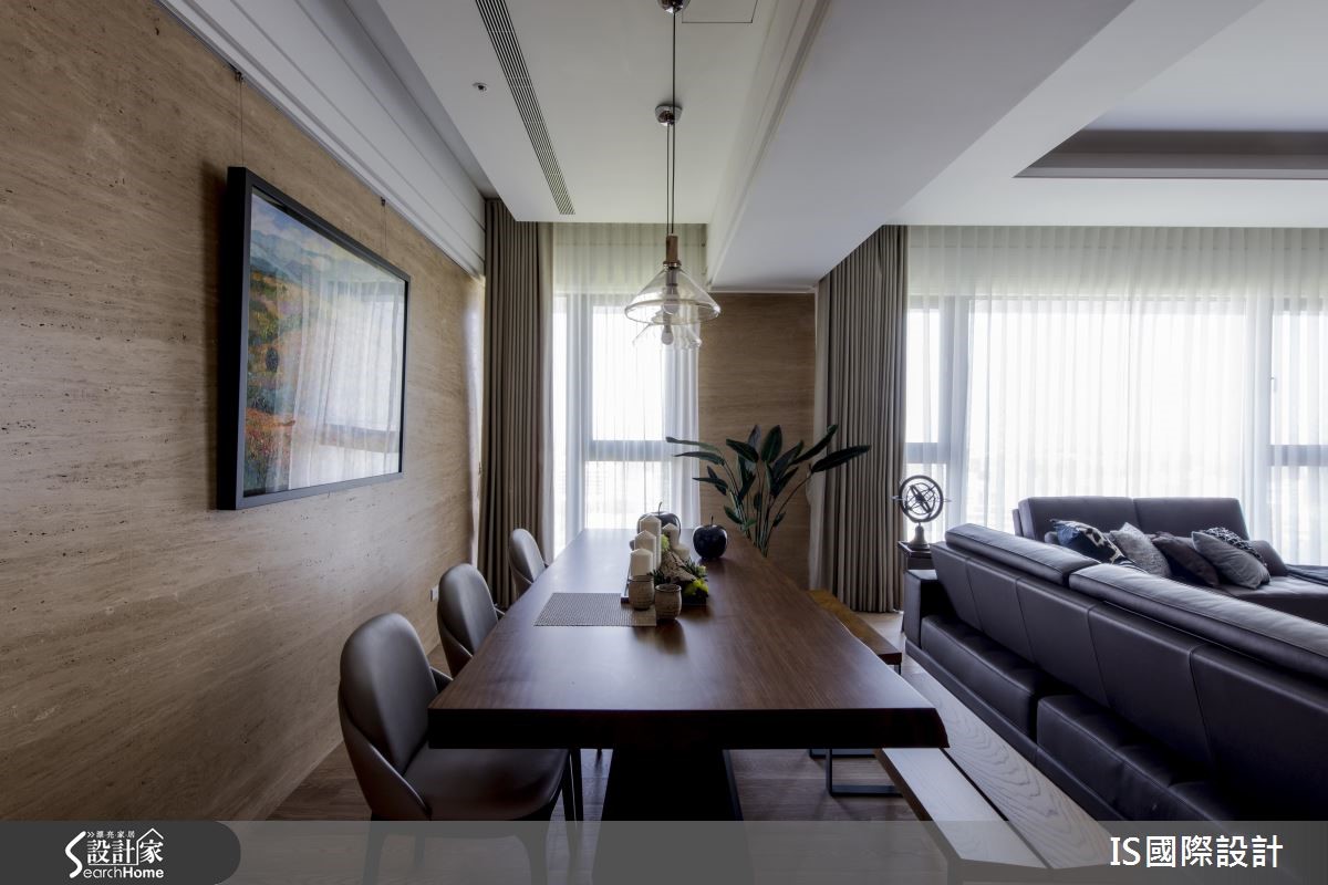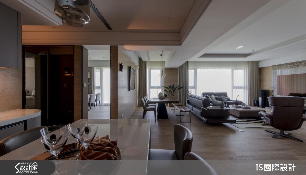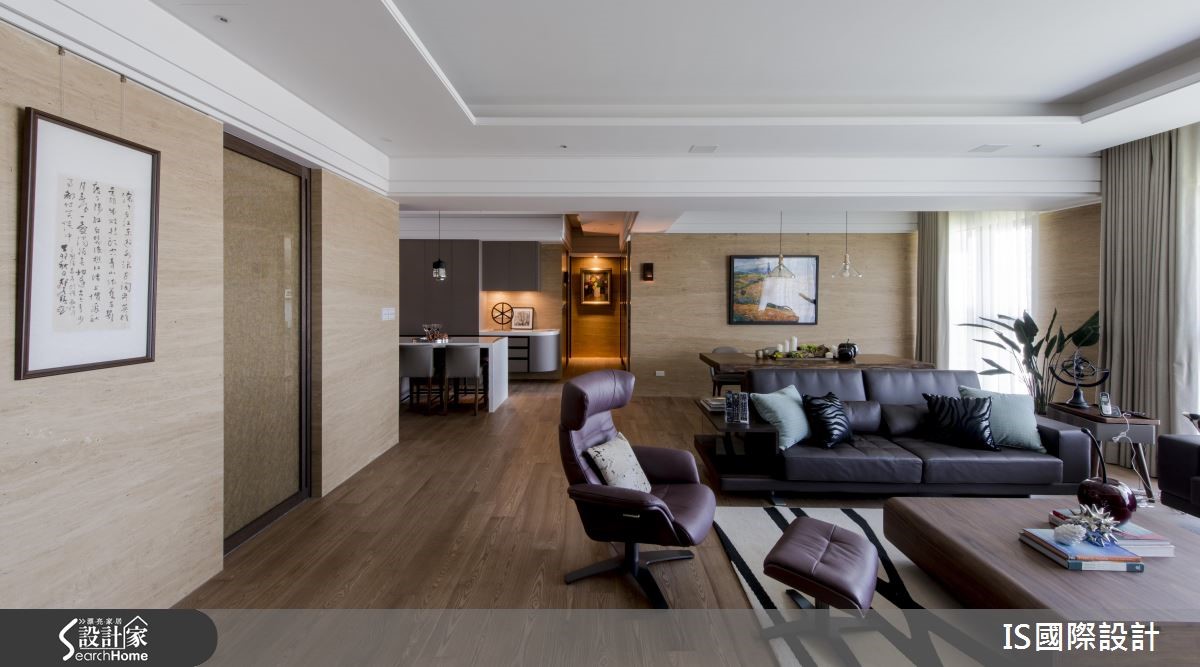 四面大窗的良好采光是此案的优势,休闲干净的质感铺陈一室,营造出净透的明亮质感。宽敞、舒适的公领域里,以简约的设计为核心,随着自然光的洗礼,并调和棕、灰色系的中性调,展现有如酒店般的美学涵养。【高雅石材,展现大器空间】设计师藉由天然材质的纹理铺陈,烘托出空间中的典雅细腻,像是以山水金峰大理石打造电视墙面,而雾面肌理的义大利黄洞石则衬托出自然细节与动人气势。并以方正、渐层的造型描绘天花板,进入公领域后,视觉则得以无限延伸。藉由柜体来型塑空间,不仅整合领域,更让出宽敞的走道。以大理石延伸壁面,门片衔接其中,让收纳柜自然融入墙壁,拉整视觉的平面感受,达到舒适简约的质感。此外,设计师更特别将中岛尺度放大,借此串连空间领域,更呼应休闲度假的宗旨。