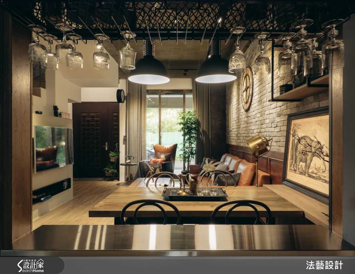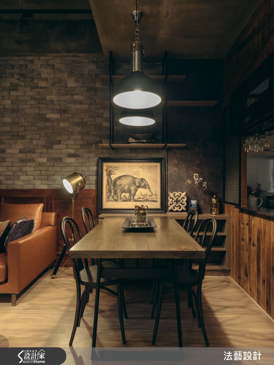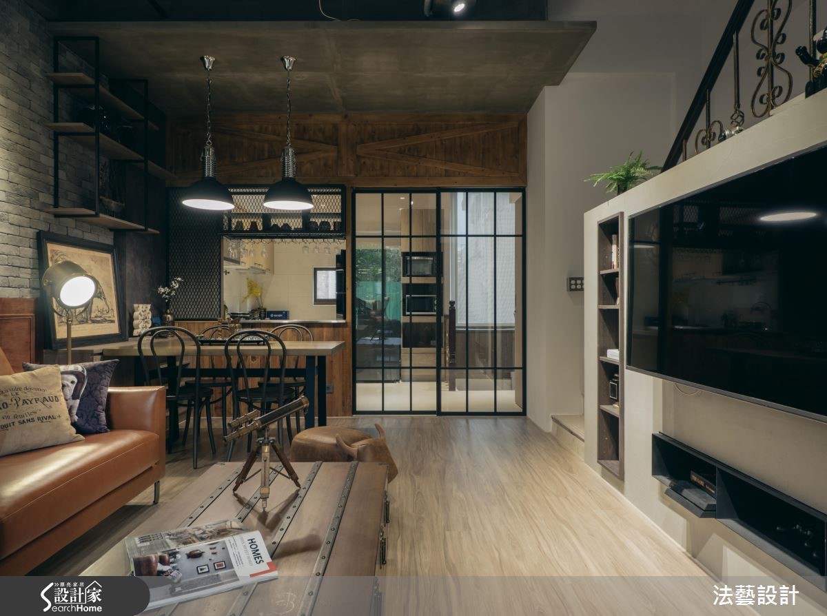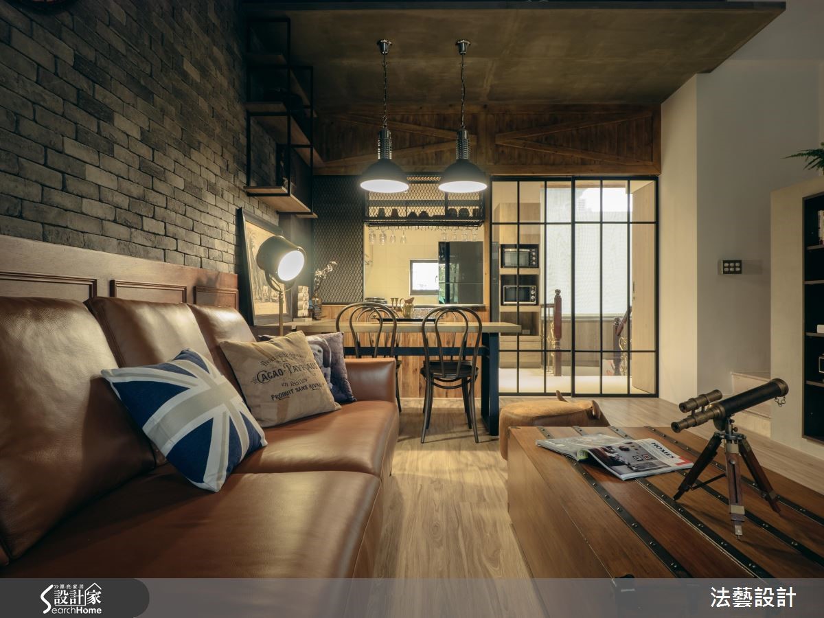 年轻的领导在工作地点附近购置了居宅,透过设计师巧思设计,运用原始水泥色调、文化石及铁艺,为93平方米的空间,带来独特的工业风氛围,满足屋主的期待。【以材质与色调诠释工业风】为了塑造个性化美感,以纹理粗犷文化石搭配染色线板,注入经典复古气息,与带有水泥粉光感的灰阶电视墙相呼应;搭配木质地板,高冷氛围中添暖意。独立厨房以铁件推拉门划分空间,并以不锈钢台面与铁件酒架构置吧台,上方更以谷仓门片完整诠释工业风格。风格营造的细节,设计师巧用单品与家具,以皮制沙发搭配木箱桌几与复古壁钟,带入英式工业质感。用餐空间的餐椅、探照灯与吊灯以铁件塑造粗犷个性,与吧台材质相得益彰。