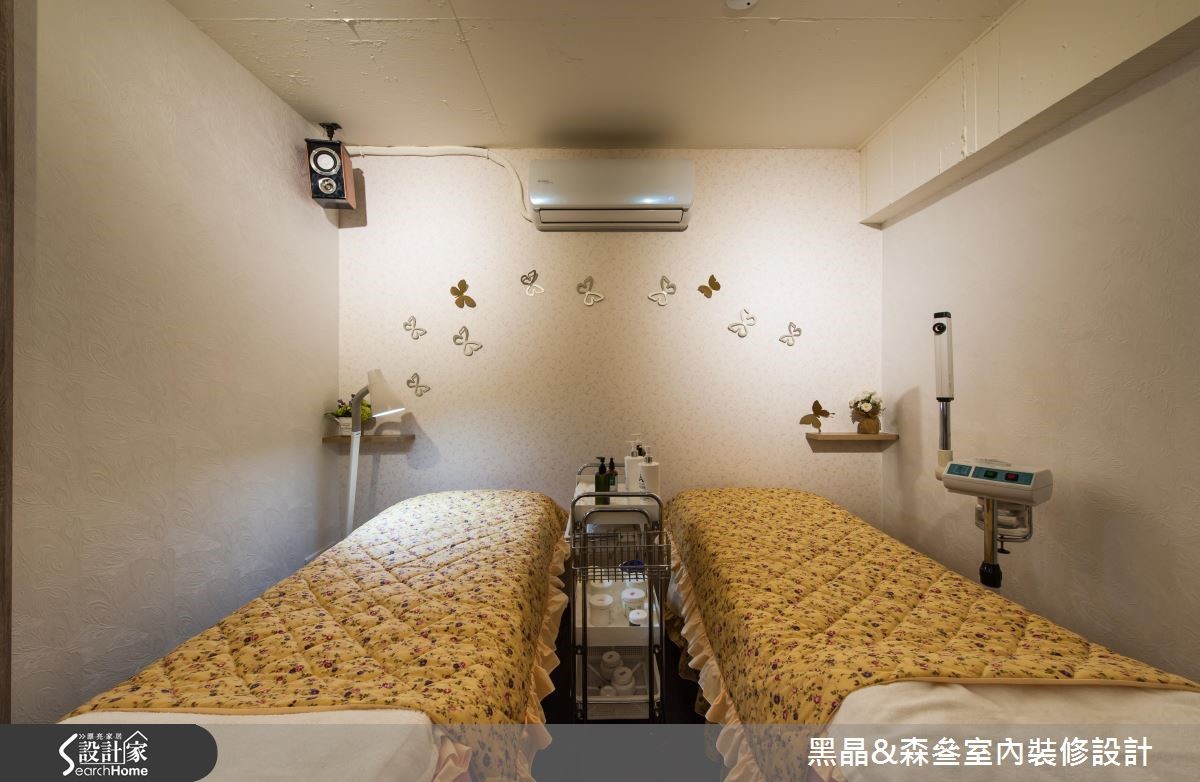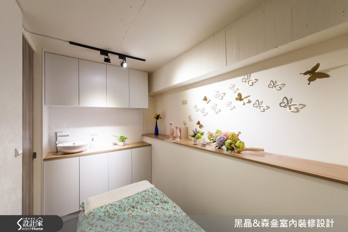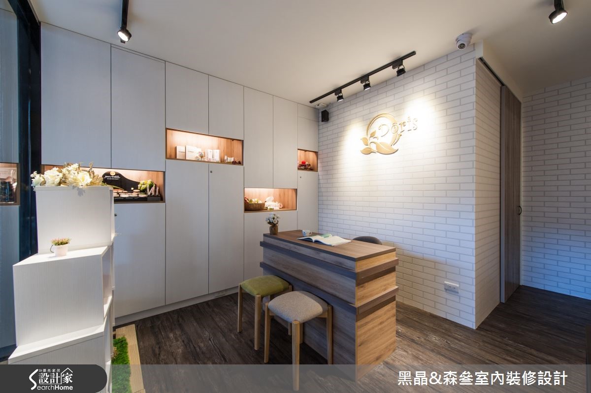 整体空间以温暖、舒适的大地色系作为风格展现,米白色的壁面则提升了视觉明亮度,简约无压的室内感受,自然达到身心灵放松、疗愈的效果。【善用间接光源,营造疗愈氛围】壁面铺上格纹壁纸,加上蝴蝶、菱形线条点缀其中,引出独特的美学质感,搭配轨道灯的温暖光源映照,创造出柔美的空间感受,也呼应美学馆的疗愈主题。柜台旁的壁面则利用系统柜体,以虚实相兼的展示空间,与窗户前方的镂空陈列格相互呼应,搭配精致的摆件点缀,替整体空间增添些许活泼氛围,也满足商业空间的实用机能。