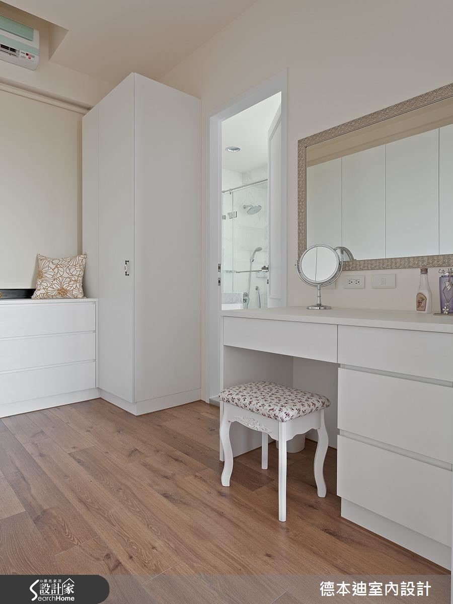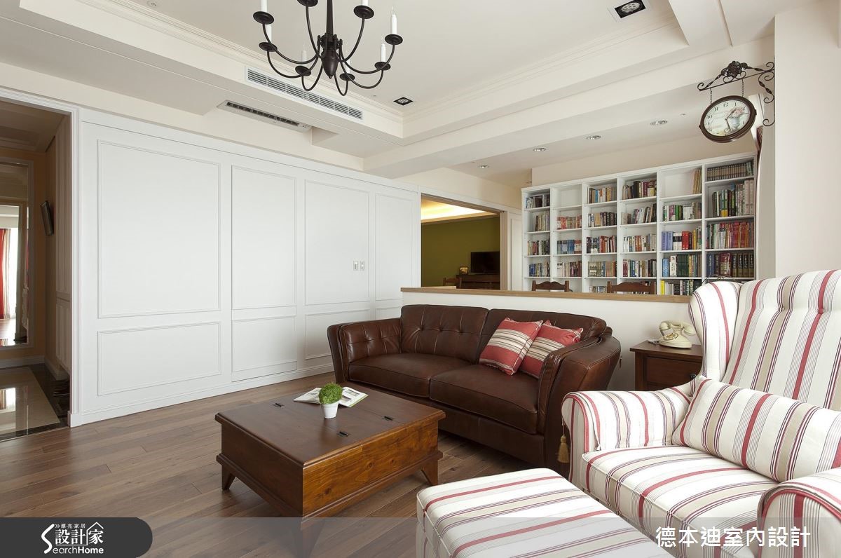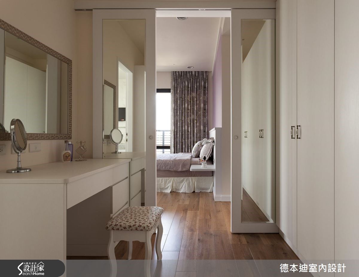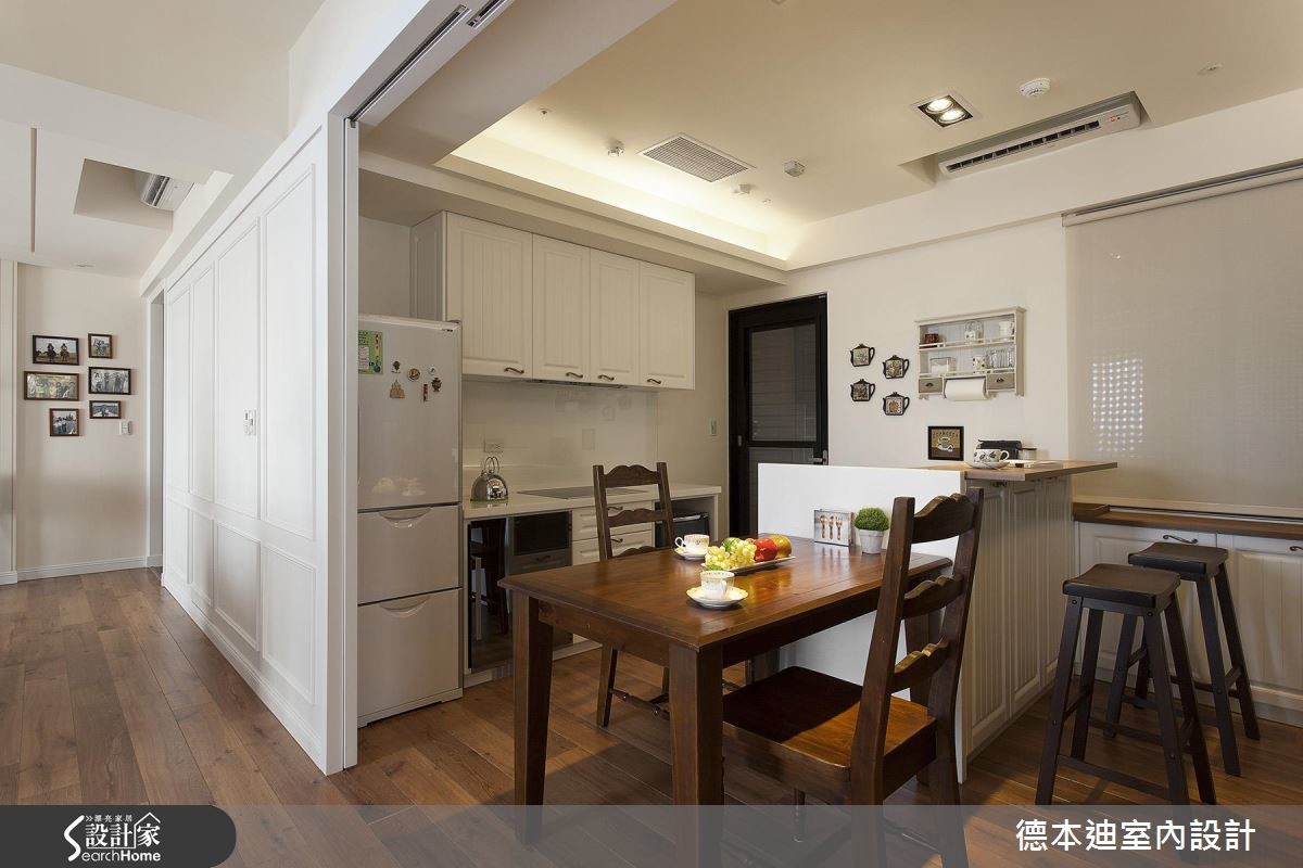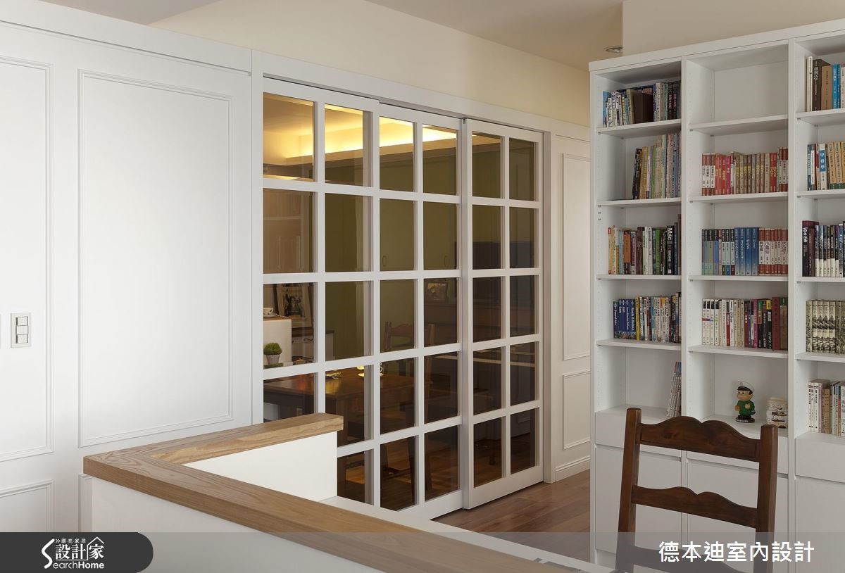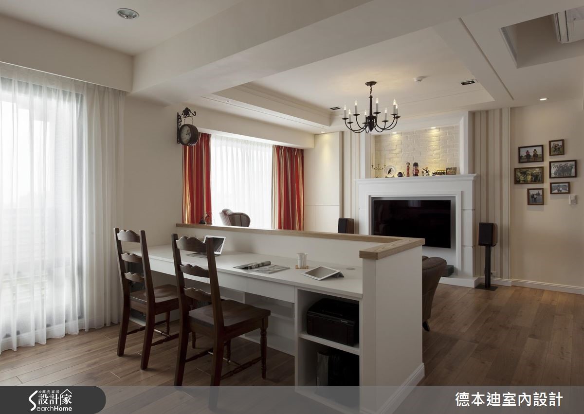 设计师将99平方米的格局重新规划,将既有餐厅变为开放书房,卧室则与厨房打通,成为全新的开放式餐厨;并放大卧室区,容纳更多的生活机能,打造出兼具风格与机能的美式风居家。【拉门设计,让空间使用更弹性】公共领域以清爽的白色为主调,搭配温暖的木质地板与家具,塑造温馨的空间氛围,电视墙则融入壁炉元素,以立体细致的线条展现工艺精神;而书房、客厅间仅透过矮墙界定,不仅使空间保有穿透度,也让视野得以延伸。一旁半开放式的餐厨区,藉由玻璃格子门片的弹性推拉,在阻绝油烟的同时,亦达到共享光线作用;而浪漫的浅紫色系主卧,透过与另一房的整并,拓展出额外的更衣空间,且做出镜面拉门,满足女主人的日常所需。