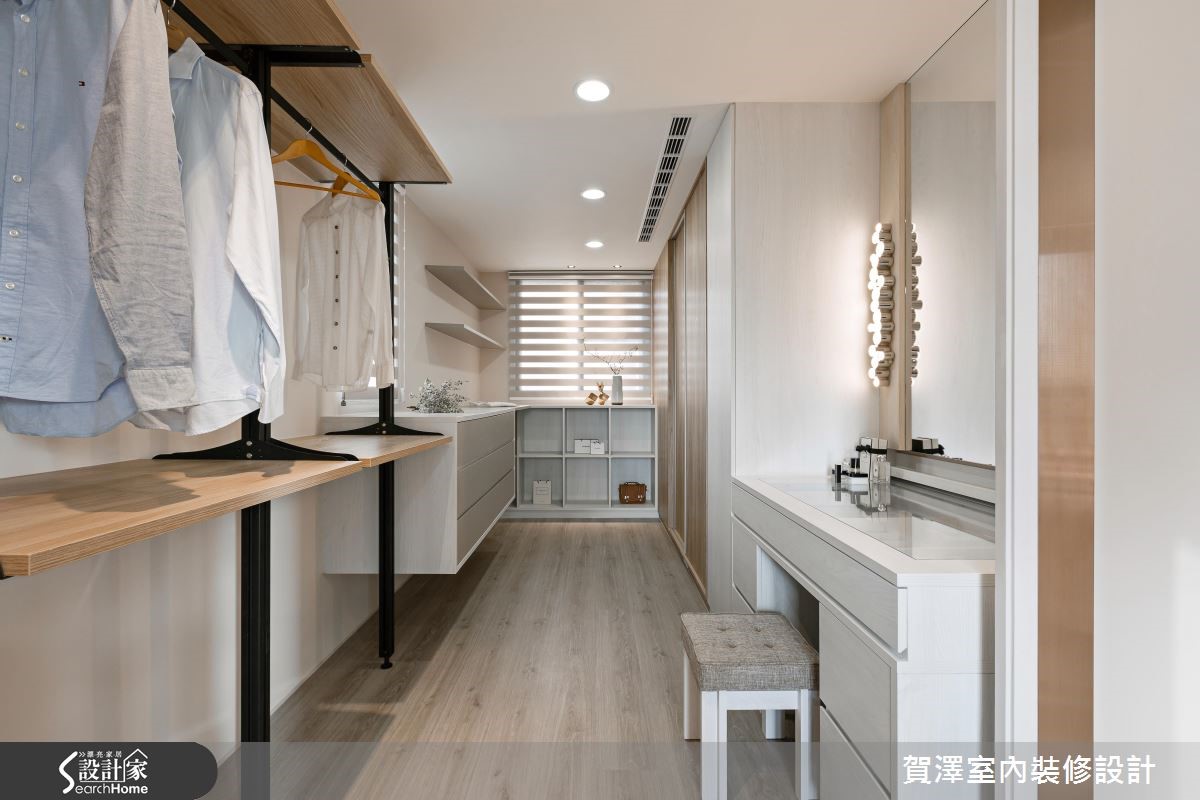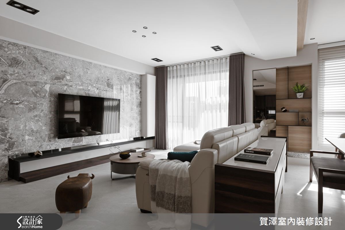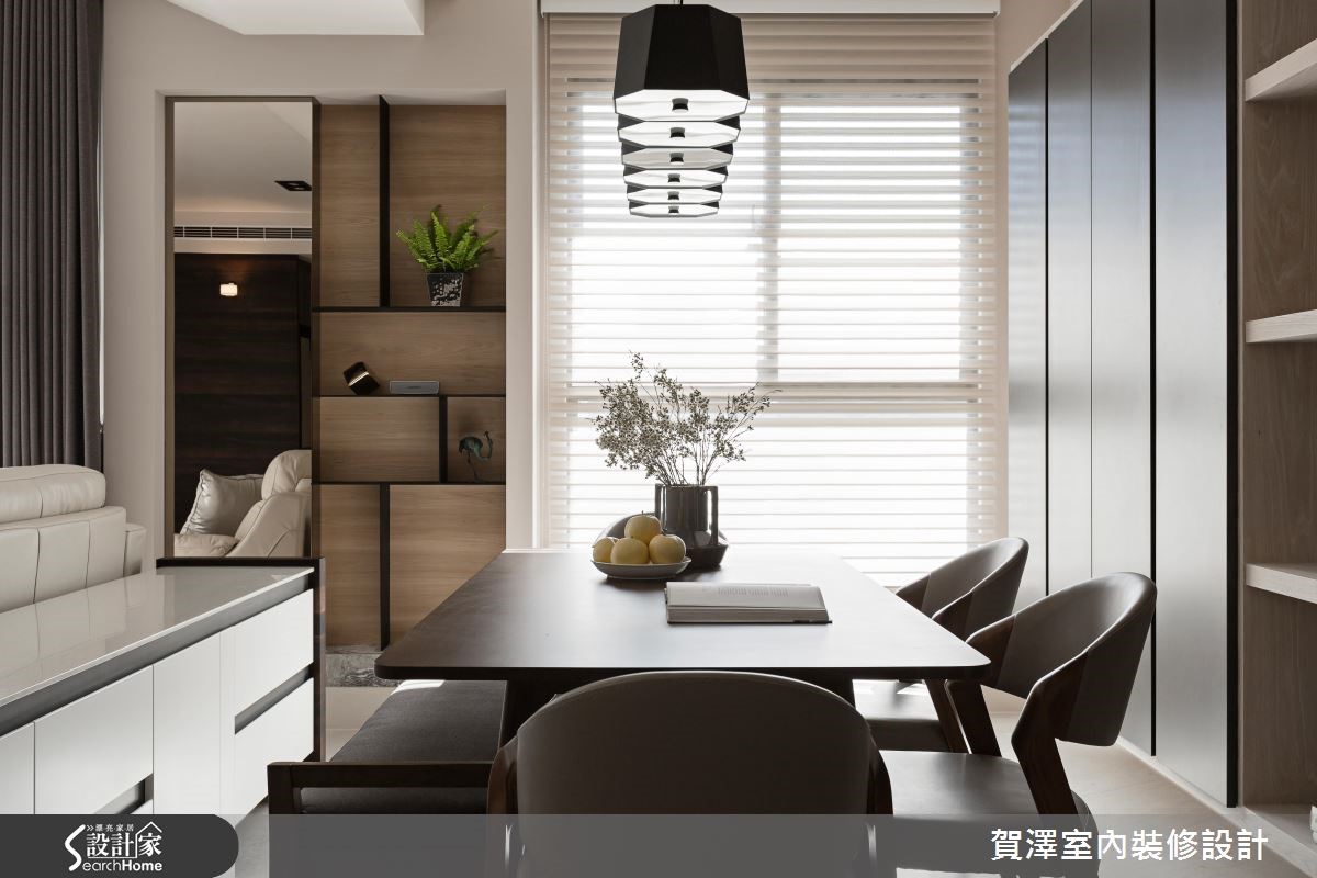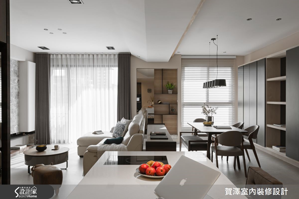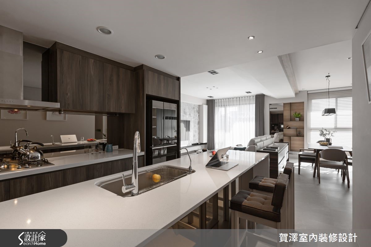 与另一半步入结婚礼堂,一起规划未来新家的样貌,是件再浪漫不过的事情了!此单层住宅里,为年轻男、女屋主婚后的居所,设计师运用温和大地色系、细腻的大理石与木纹肌理,取代强烈色调和造型设计,呈现出耐看、简洁的新婚居家样貌。【轻透、素雅的质感空间】以沉稳的黑、灰、白及木质色系为基调,结合客厅、餐厨及複合式餐桌区的多元机能性,公共区域运用开放式设计,更显大方宽敞,同时也规划充裕的收纳。镜面、石材挹注丰富的材质变化,再搭配活泼、经典的家具摆设,打造美感与舒适度并存的质感空间。属于两人的新婚宅,以简约、耐看的大地色调,搭配清新明亮的日光,呈现出单纯而隽永的幸福质感。主卧室和更衣室则选用未来女主人喜爱的粉藕色,床头以圆滑的弧线造型,巧妙柔化稜角线条,调製出柔和浪漫的卧室氛围。