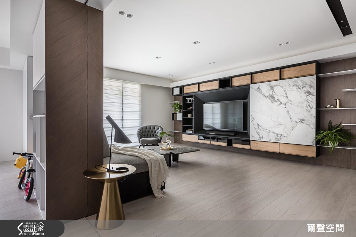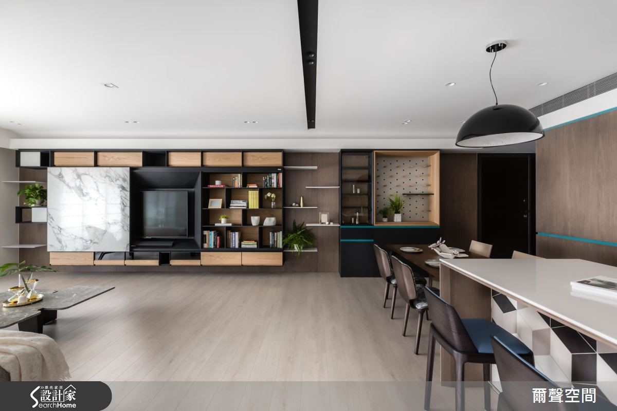 依据屋主对于"互动"的大量需求,设计师以活动式推拉门创造无隔阂空间,当孩子们渐渐长大的同时,屋主可依固定或活动推拉门满足家庭成员的需求,避免再次大费周章的更动格局,进而让全家拥有一个可以陪同他们一起成长的房子。【推拉门设计,游乐阅读空间倍增】设计团队将重点放在隔断设计与收纳规划。针对收纳补强,将储藏室隐藏于入门处,成为衣帽间与孩童及宠物推车的安置处。电视墙以大面积大理石纹瓷砖推拉门结合开放式柜体,为喜爱简约的屋主夫妻增添沉稳氛围。推拉门设计为本案设计重点,规划于厨房与多功能游戏房,为了收纳隐藏打开的门片,设计师将其分别安置于走道墙面,厨房电器柜侧面以及沙发背墙和书柜的夹心空间。镶嵌于沙发背墙的立体透明猫柜可在无人在家时,免除猫咪破坏家具和电线的疑虑。重视亲子互动的屋主夫妻,可随时打开游乐室L型推拉门,让游乐区与阅读室倍增,全室搭配超耐磨地板,可放心奔跑。针对喜爱烹饪的女主人,设计师以推拉门设计顾及孩子的安全问题,同时又可保有采光;搭配有趣的中岛立面设计,大幅度提高与家人的互动性。