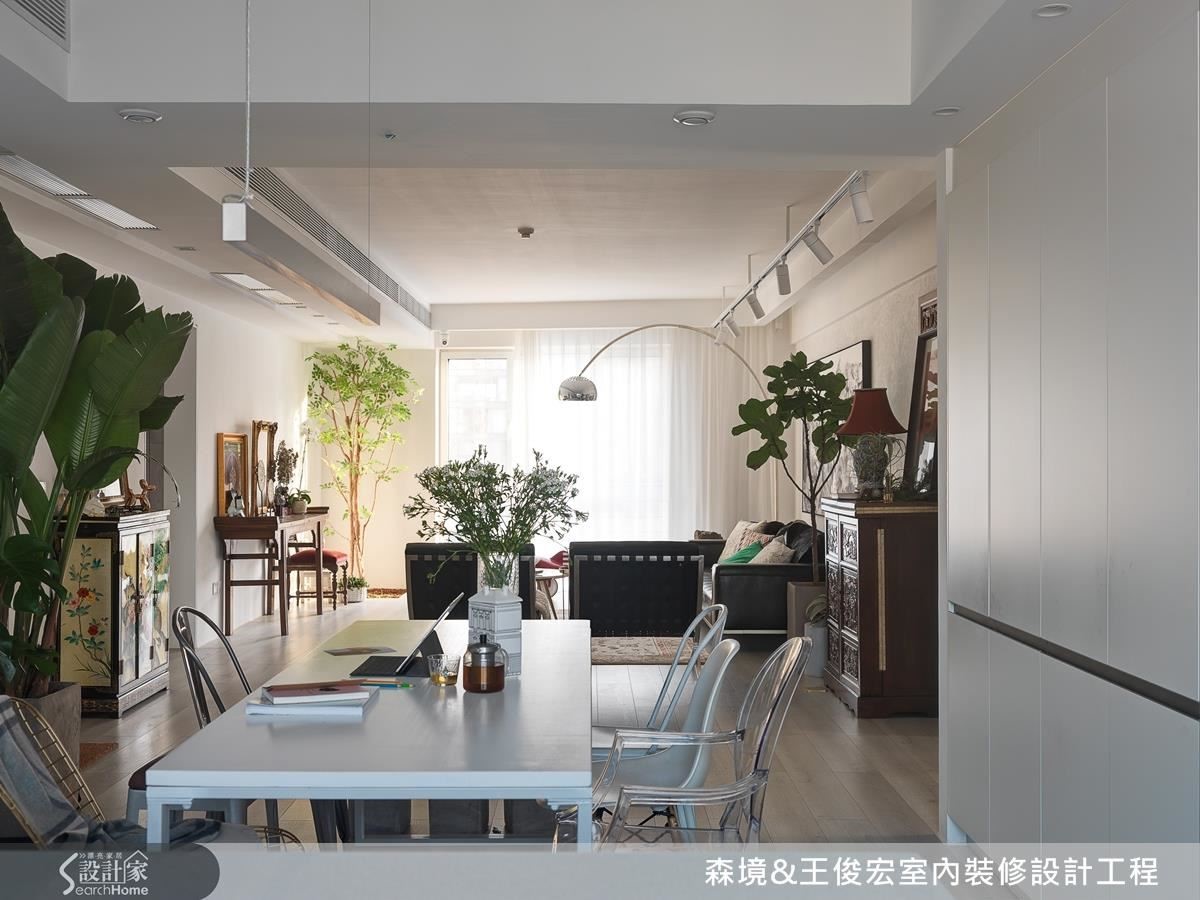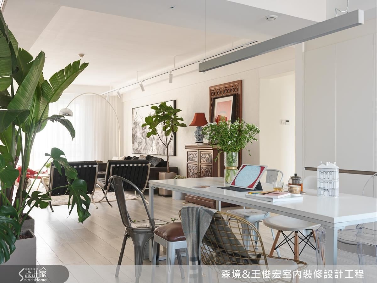 为了让家具、艺术品更突出,空间以净白色系打底,巧妙运用硅藻土墙面、白色收纳柜和厨具等不同材质,形成简约却有层次的白。衬托各色的古董桌椅、斗柜或艺品画作,为空间增添丰富视觉。