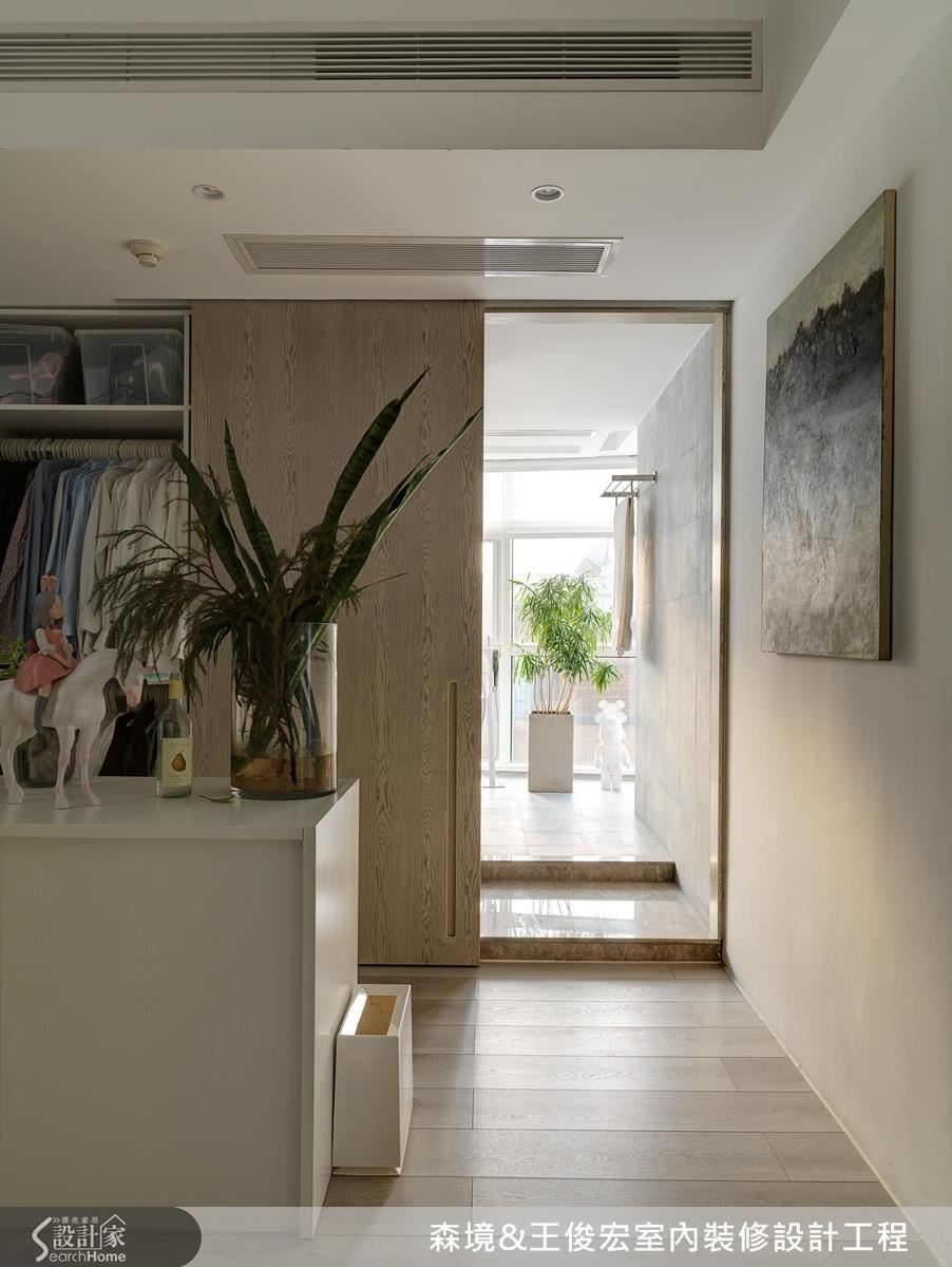 考量到小孩年纪还小,于是将原有3间居室重新规划,将主卧、更衣室与儿童房并排,并统一留出过道、增设移门,让动线相互串联,方便屋主就近照顾小孩。有客来访时,也能关上拉门保有隐私。