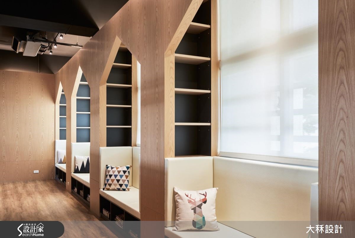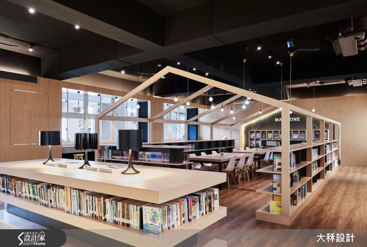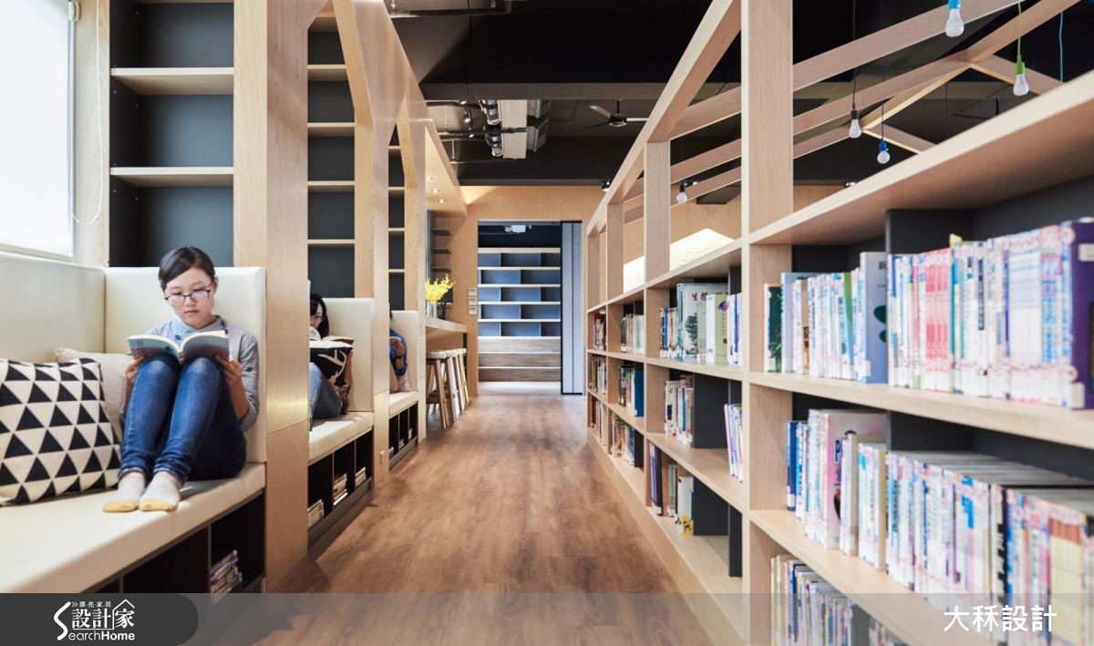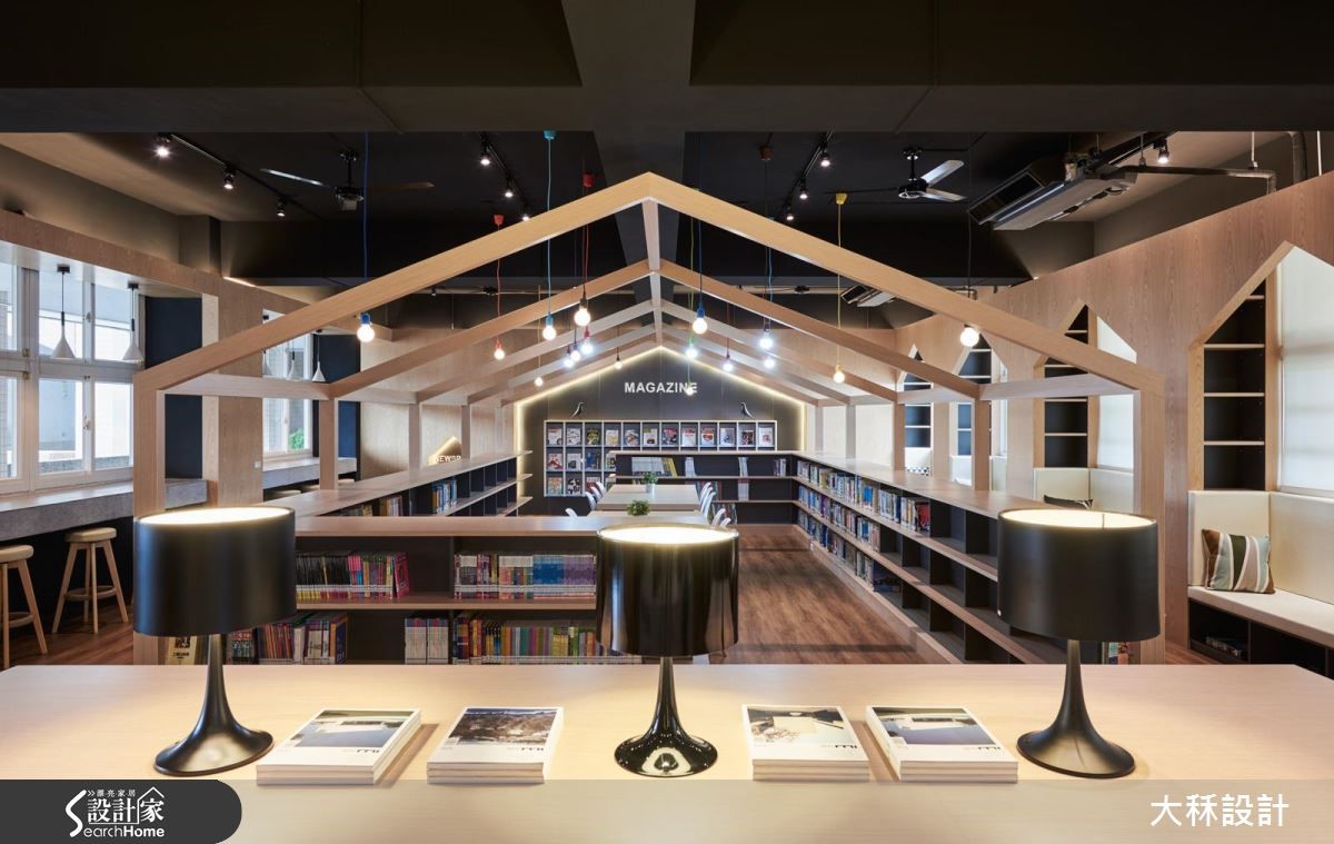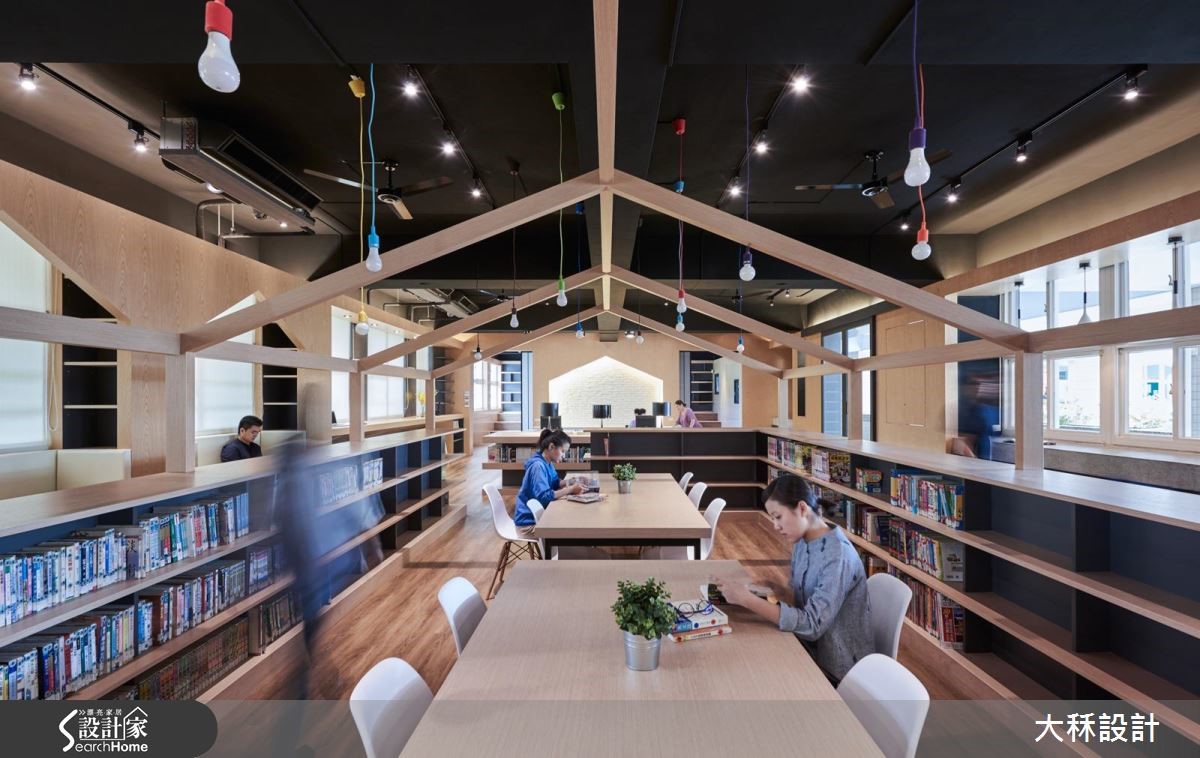 翻转你对学校图书馆的刻板印象!原本陈旧、阴暗的198平方米空间,在设计师的巧思改造下,以"屋中屋"的概念,在室内打造出尖顶斜边的屋架造型,并沿着采光良好的两侧窗边,设置文艺感十足的吧台座位和飘窗区,让图书馆成为全校师生的人气秘密基地!【温暖木质,营造咖啡厅温馨氛围】设计师以大量木质调取代传统的铁件书架,运用轻巧的屋架结构打造"阅读小屋",并藉由镂空架构的设计,让整个空间得以延伸,带来开放的视觉穿透效果;而缤纷的垂挂彩色灯泡,也形塑出舒适、活泼的阅读氛围。除了长桌阅读区的规划,两侧墙边也设置飘窗区、吧台式座位以及上网区,迎着窗边的明亮日光,便能享受书中世界;另外,图书馆内也规划了兼具教学和提供师生阅览使用的阶梯教室,让阅读的美好,随时在每个角落上演!