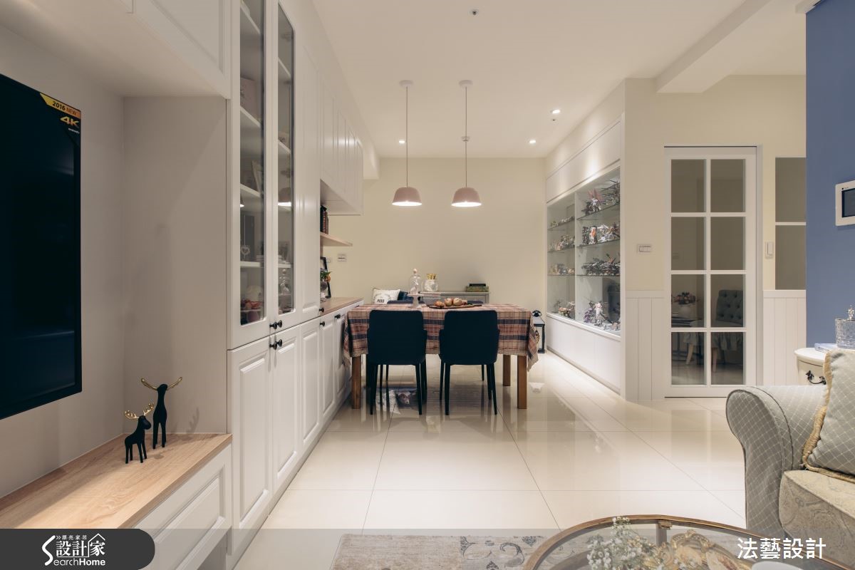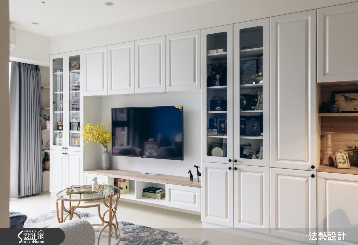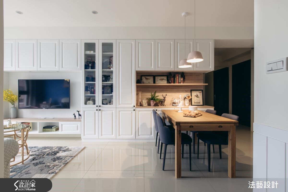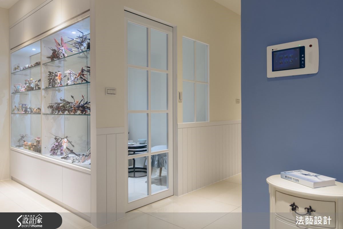 新婚的屋主夫妻在工作地点附近购置新居,因为两人喜爱简单大方的风格,设计师运用线板和对称的古典元素,注入美式风格。同时搭配典雅色系,衬托高贵气息。 【巧用柜体做隔断,让出更多空间】自玄关开始到电视墙,以简约的线板造型的系统柜取代木作,成功降低装修成本,同时兼具收纳与美观机能,更贴墙设置了不阻碍动线的穿鞋椅。由于屋主拥有大量的模型收藏,书房隔断刻意采用玻璃柜体,成为别具意义的设计,更能降低建材成本、避免空间浪费问题。客厅背墙采用紫罗兰色壁面,搭配精致金边桌几、古典家具,营造浪漫风格。书房则以窗格推拉门与壁板进一步营造美式风气息,特别为女主人打造的主卧,在床头下方设置柜体扩增收纳,特别挑选的粉蓝床架与化妆桌,更散发柔美气息。