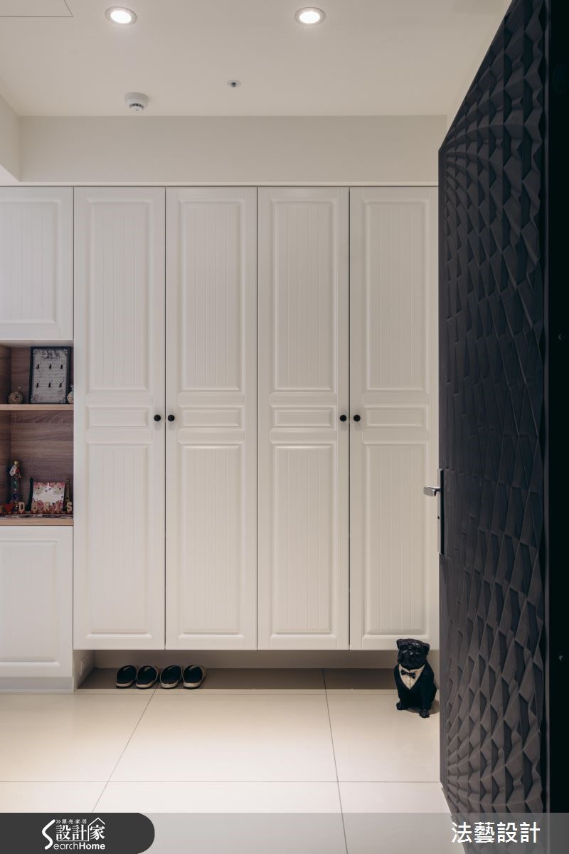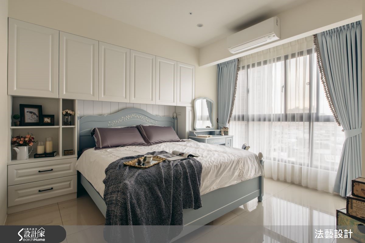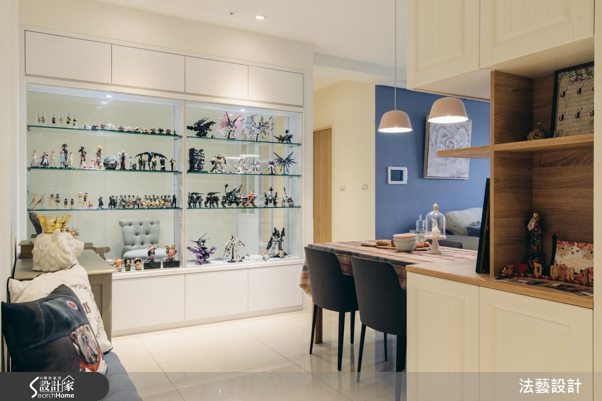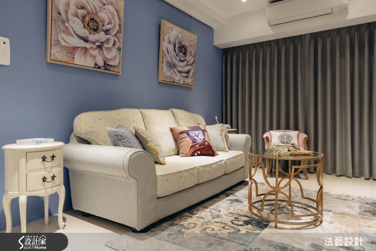 新婚的屋主夫妻在工作地点附近购置新居,因为两人喜爱简单大方的风格,设计师运用线板和对称的古典元素,注入美式风格。同时搭配典雅色系,衬托高贵气息。 【巧用柜体做隔断,让出更多空间】自玄关开始到电视墙,以简约的线板造型的系统柜取代木作,成功降低装修成本,同时兼具收纳与美观机能,更贴墙设置了不阻碍动线的穿鞋椅。由于屋主拥有大量的模型收藏,书房隔断刻意采用玻璃柜体,成为别具意义的设计,更能降低建材成本、避免空间浪费问题。客厅背墙采用紫罗兰色壁面,搭配精致金边桌几、古典家具,营造浪漫风格。书房则以窗格推拉门与壁板进一步营造美式风气息,特别为女主人打造的主卧,在床头下方设置柜体扩增收纳,特别挑选的粉蓝床架与化妆桌,更散发柔美气息。