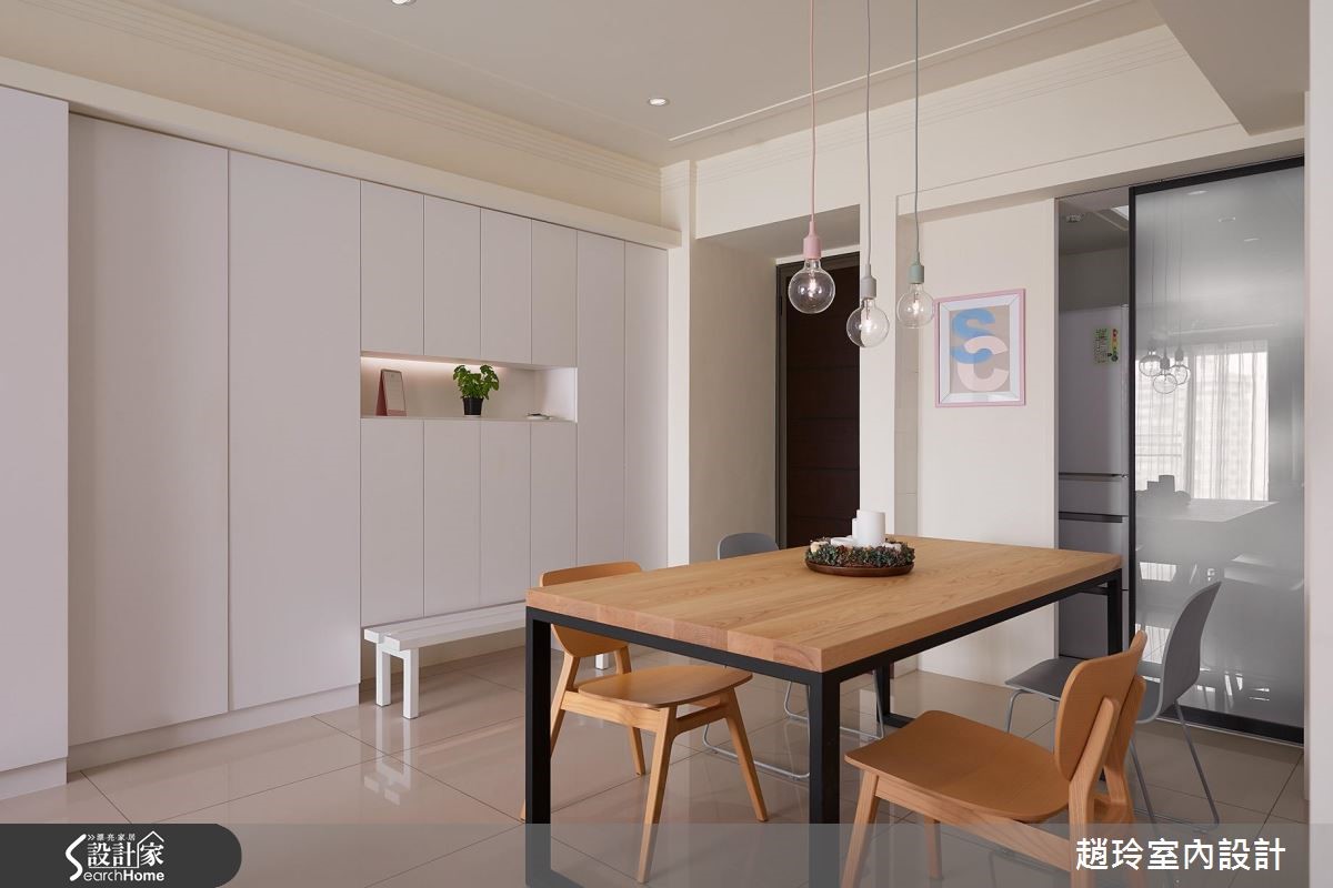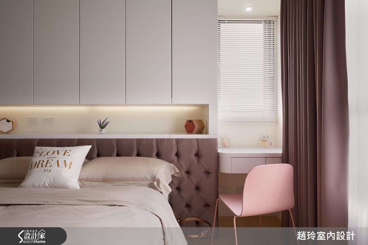 116平方米居宅,整体以现代风为基底,采浅色作为全室背景,并运用家具软件等妆点色彩、提升活泼气息,且藉由清玻建构隔断、引导光源均匀分布,带出舒适的起居氛围。【采光与浅色柜体打造唯美居家】客厅藉由大面开窗引入采光,搭配浅色背景,搭佐灰色、粉色等家具,营造舒适清爽的视觉主调,沙发墙选用清玻、铁件建构隔断,形成穿透不受阻的琴房视野,让黑色钢琴成为视觉风景,而弹性推拉门可随意开关更人性化。餐厅规划整排白色柜体,中段给予小小的展示平台,底部更暗藏穿鞋椅收纳空间,兼具实用需求与风格美型;主卧床头衔接柜体以化解压梁问题,并妥善运用角落畸零空间、规划实用的梳妆台面,同时点缀紫红色窗帘及同色系床头绷布,使卧房更显温煦舒适!