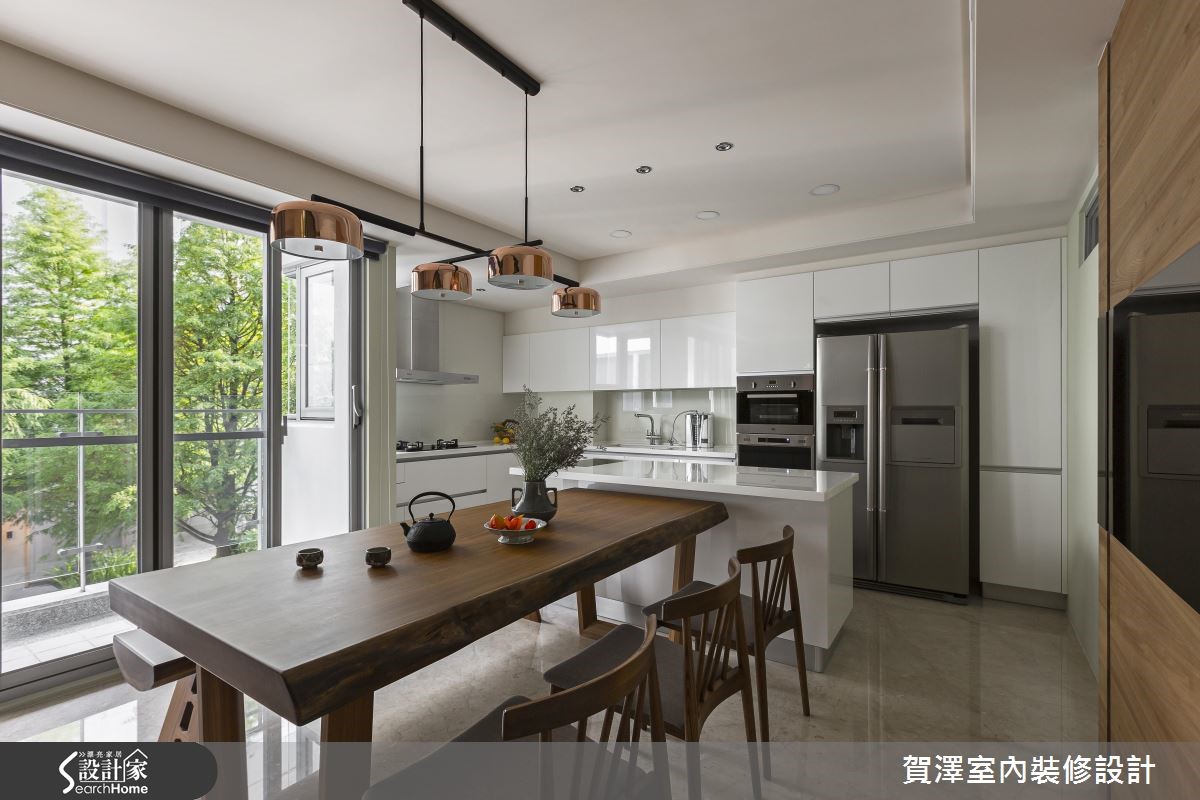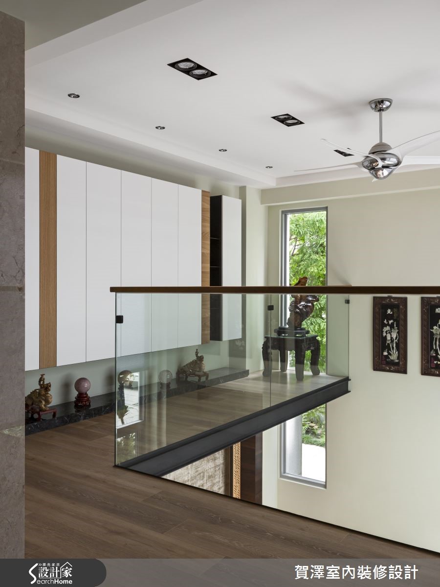 隐身在树海绿意之间的6层楼别墅,是献给奶奶、父母和儿子媳妇的三代居所,对美感十分要求的屋主,期望拥有宽敞透亮的空间氛围,并需将屋主所蒐藏的古珍艺品和中式家具,融入新家的装修设计中,一起和小编来看看,设计师要如何完美达成屋主的期待吧!【以东方艺术,舞大器之姿】结合简约现代的设计概念,营造出清爽、舒适的住宅质感,一楼客厅以大面落地窗收揽整片街景和绿意,并安装电动捲帘,随时可依需求调整光源强弱,而雕花精緻的中式桌椅,作为空间中的主视觉,凝鍊为细腻醇厚的古樸氛围。沿着阶梯走上二楼,来到餐厨空间,同样具有优渥的採光和绿意景緻,利用开放式的设计,随处皆能感受到舒适的自然温度。起居室和卧室以木质调和藕灰色作为温和基调,再加上简约大方的收纳橱柜、更衣室等设计,挹注实用机能性。二楼处除了餐厨空间的设计,设计师也为有许多艺品珍藏的屋主,特别打造L型空中艺廊,藉由透明的玻璃屏隔扶手,使一二楼空间更加开阔敞亮,迎着大面的绿树街景,将自然生活与艺术美学巧妙连结。