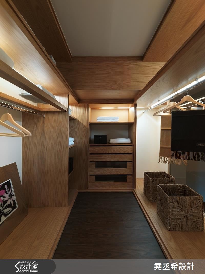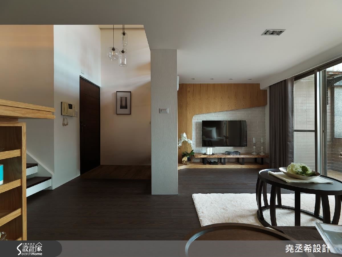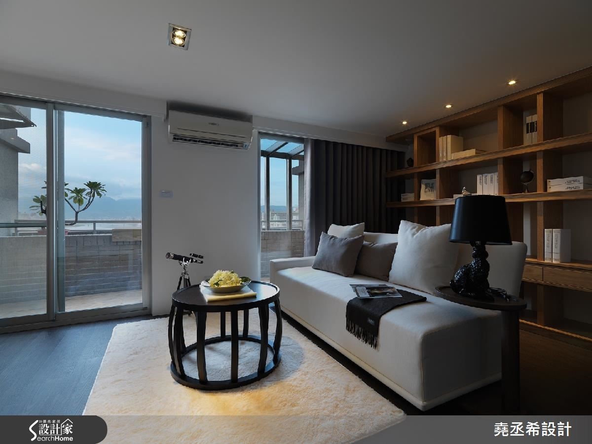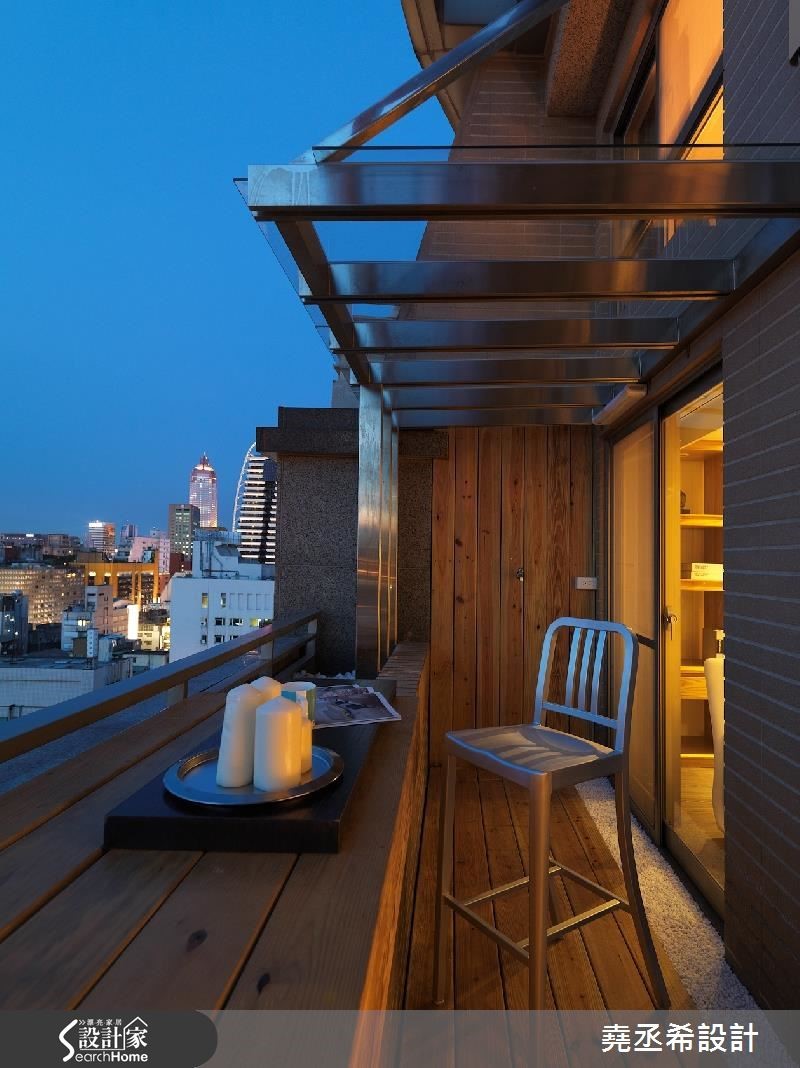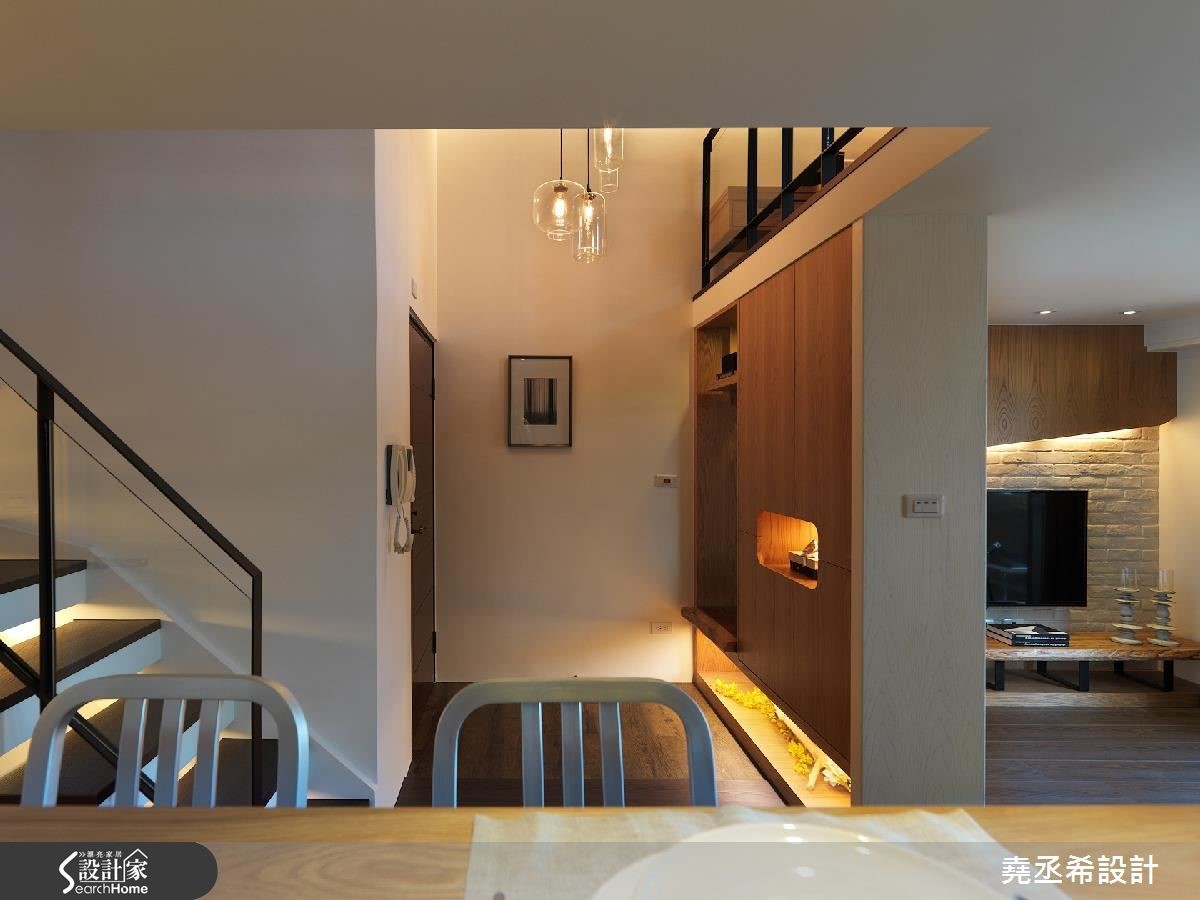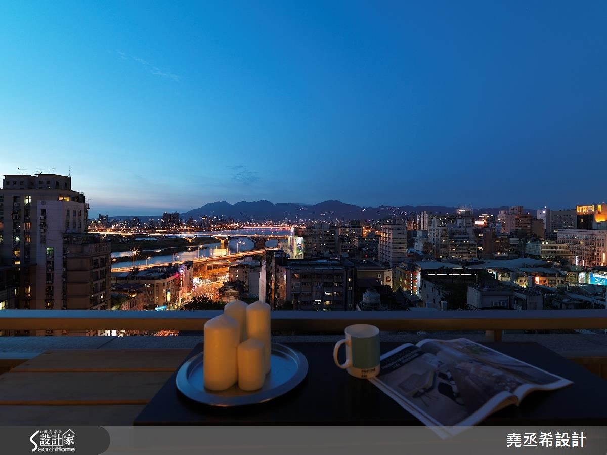 属于单身屋主的50平方米跃层空间,运用4米2的屋高优势,打造出丰富生活机能。不仅拥有自己的小客厅、餐厨吧台、更衣室,还有一处景观优美的阳台,经过改造后,变身为适合夜晚小酌的户外吧台,让单身生活也能舒适又精彩。【不做隔断,营造简洁动线】以屋主喜爱的北欧风格定义,选用大量的钢刷橡木材质,让空间盈溢着明亮自然的舒适感。一楼处规划为公共区,涵括客厅、餐厨和展示书墙,运用沙发取代隔断,也方便移动,增加空间的弹性。厨房的操作台面则连结一座高吧台,自然区分出玄关和走道动线。沿着阶梯向上,楼上作为屋主与宠物的私领域空间,将下方浴厕位置延伸向上,打造出独立更衣室,并保留主卧室的舒适开放感。设计师也运用阶梯下方的畸零区块,设置展示收纳与间接灯光,夜晚上下楼时也能作为辅助光源。此外,善用楼层高度优势,从阳台处可以远眺整片漂亮的河堤风景,利用南方松木包覆老旧瓷砖,并将原有的阳台外墙和梁体转化为桌面平台。适合迎着星夜晚风,享受与自己的浪漫小酌。