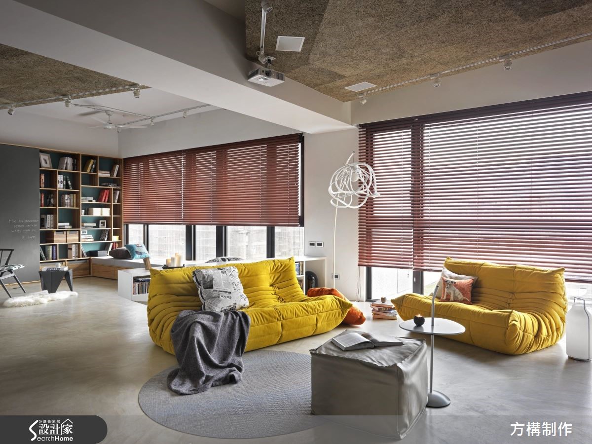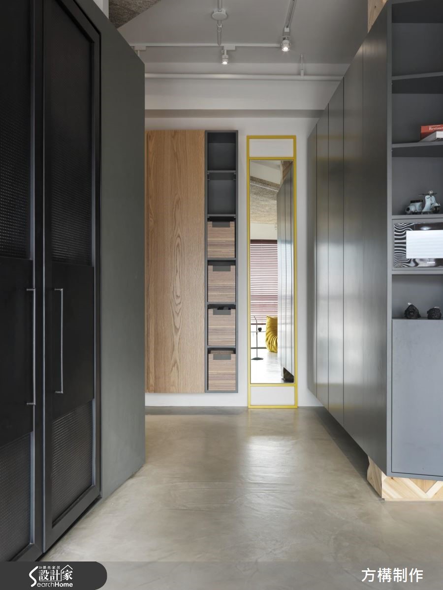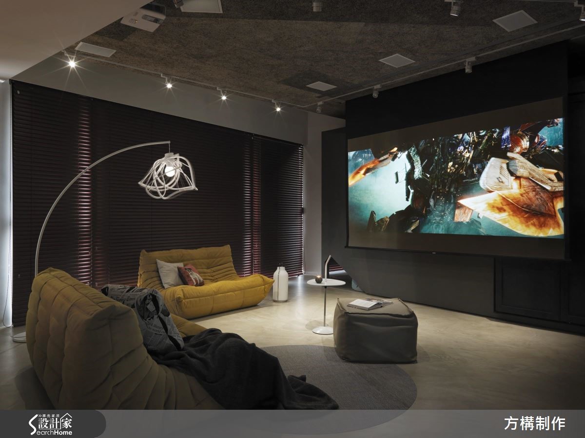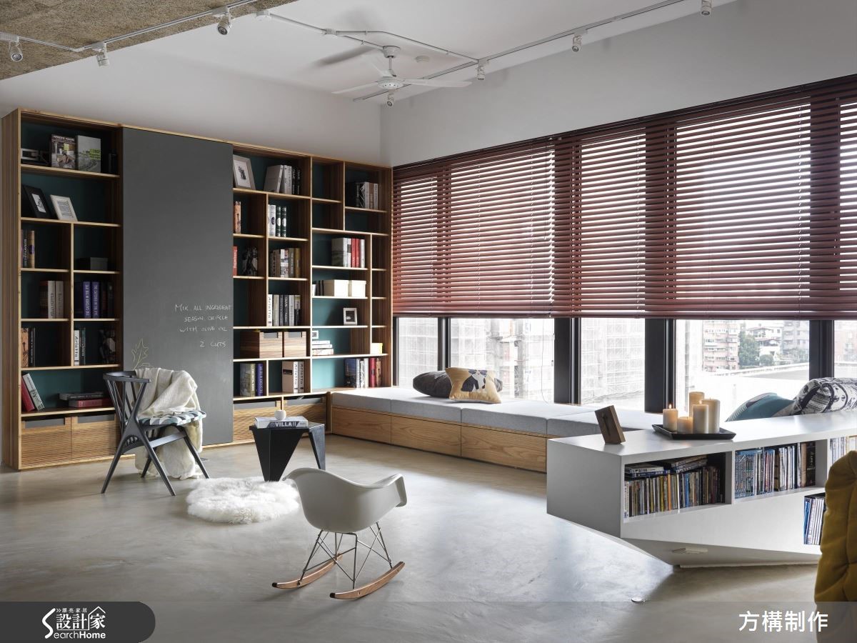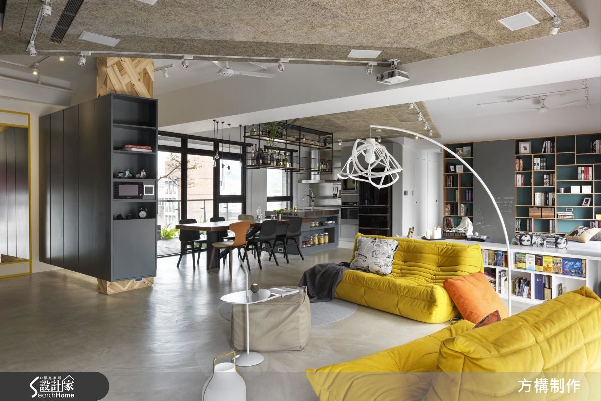 设计团队以"几何"为主题,利用各式材质与色彩进行拼贴与设计,为157平方米的空间营造线条俐落且饶富视觉趣味的新颖居住环境。【善用异材质,塑造空间层次】公共领域以全开放设计打造,并依据机能将客厅、书房与开放餐厨一分为二;客厅区为贴合屋主喜好,以高移动性的家具搭配家庭剧院,打造高端的视听享受;而沙发后方则以斜面矮柜划出书房,在采光良好的落地窗旁设置飘窗,营造舒适且多功能的阅读空间开放式餐厨以结合中岛吧台的餐桌为中心,上方铁件吊柜、灯饰与金属台面相互呼应,更加体现出工业风格;而灰阶的系统厨具与几何造型拼贴的木质墙面,则为空间增添丰富的视觉层次。