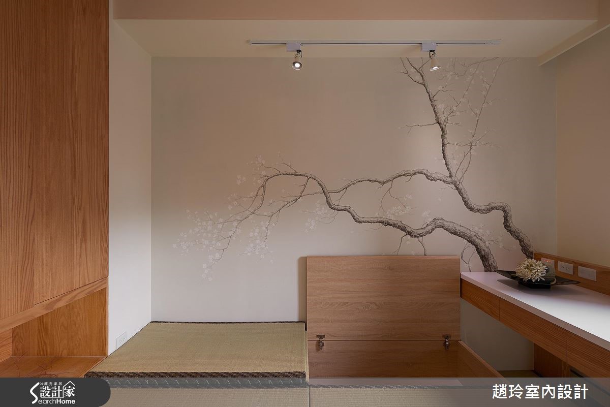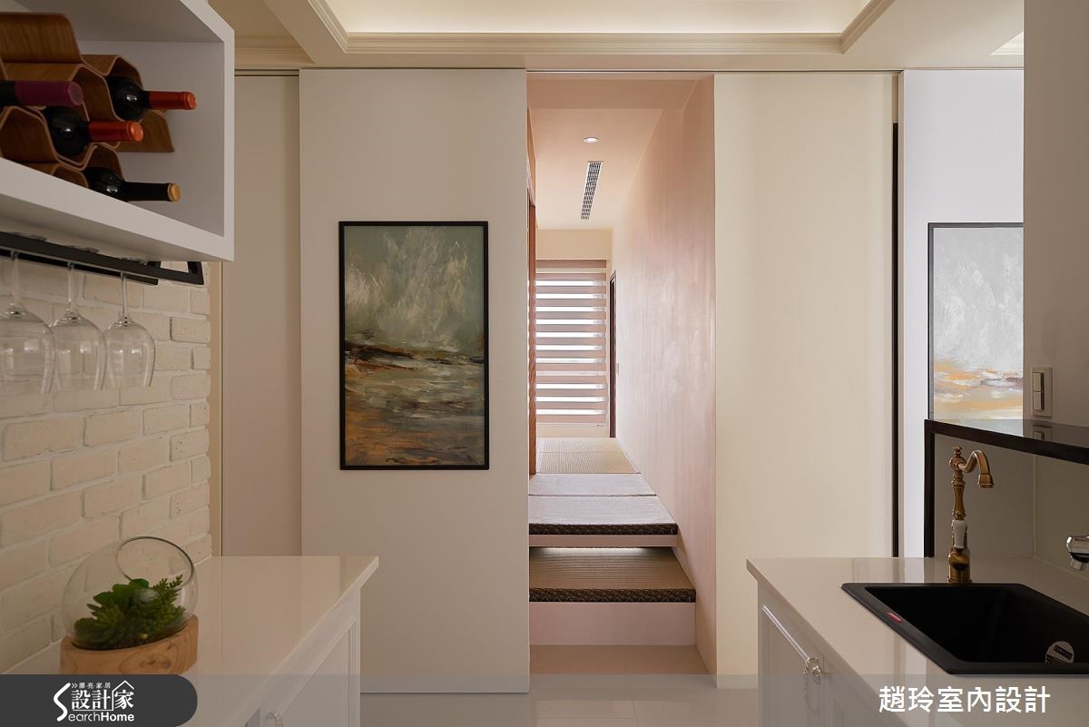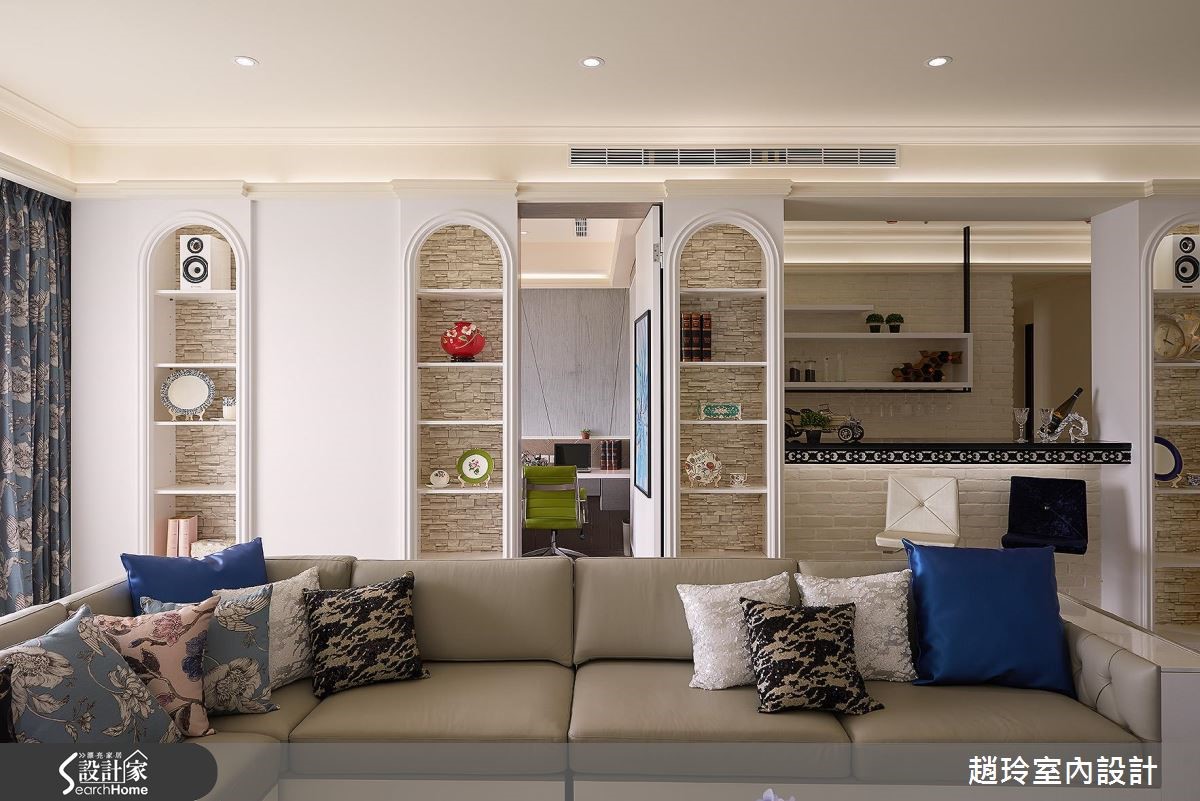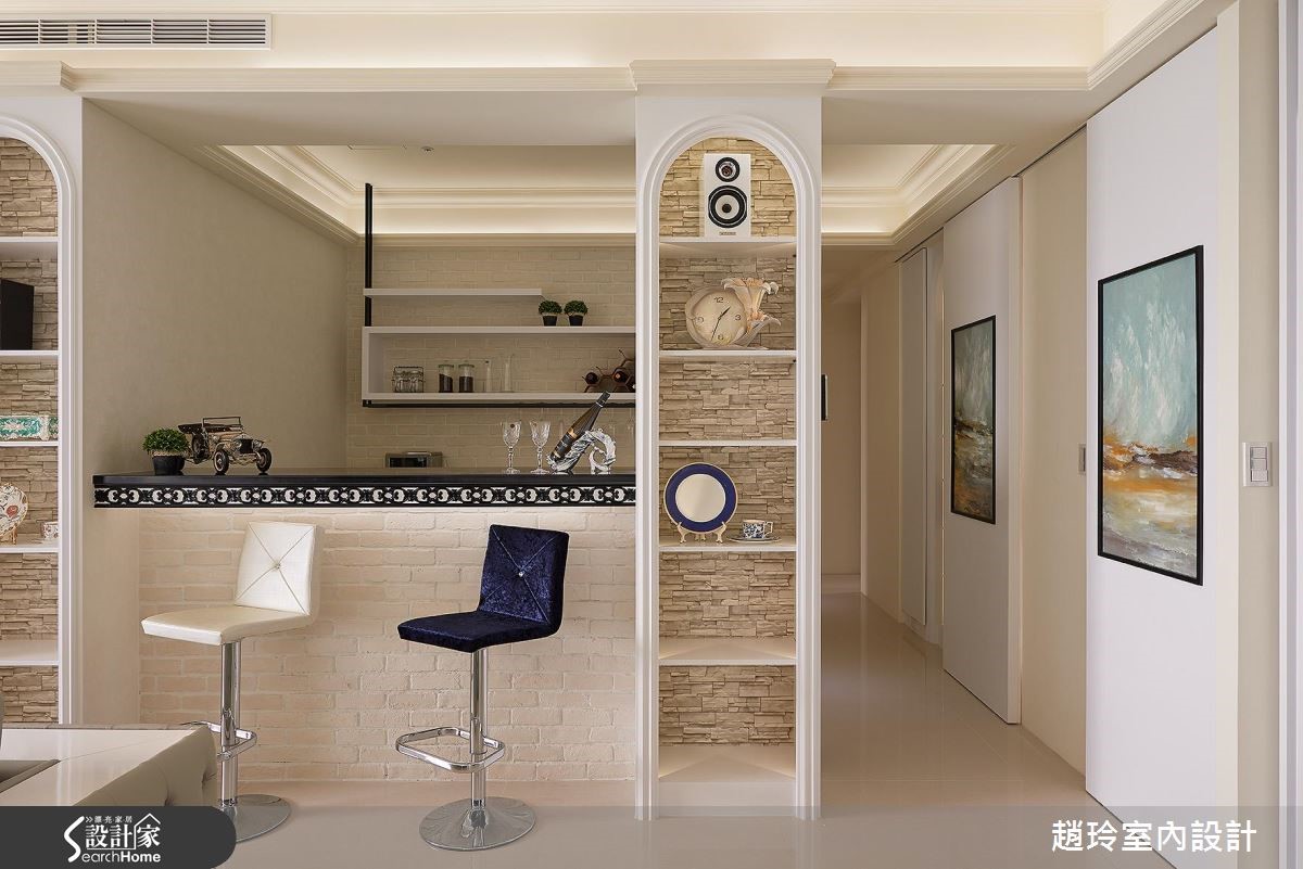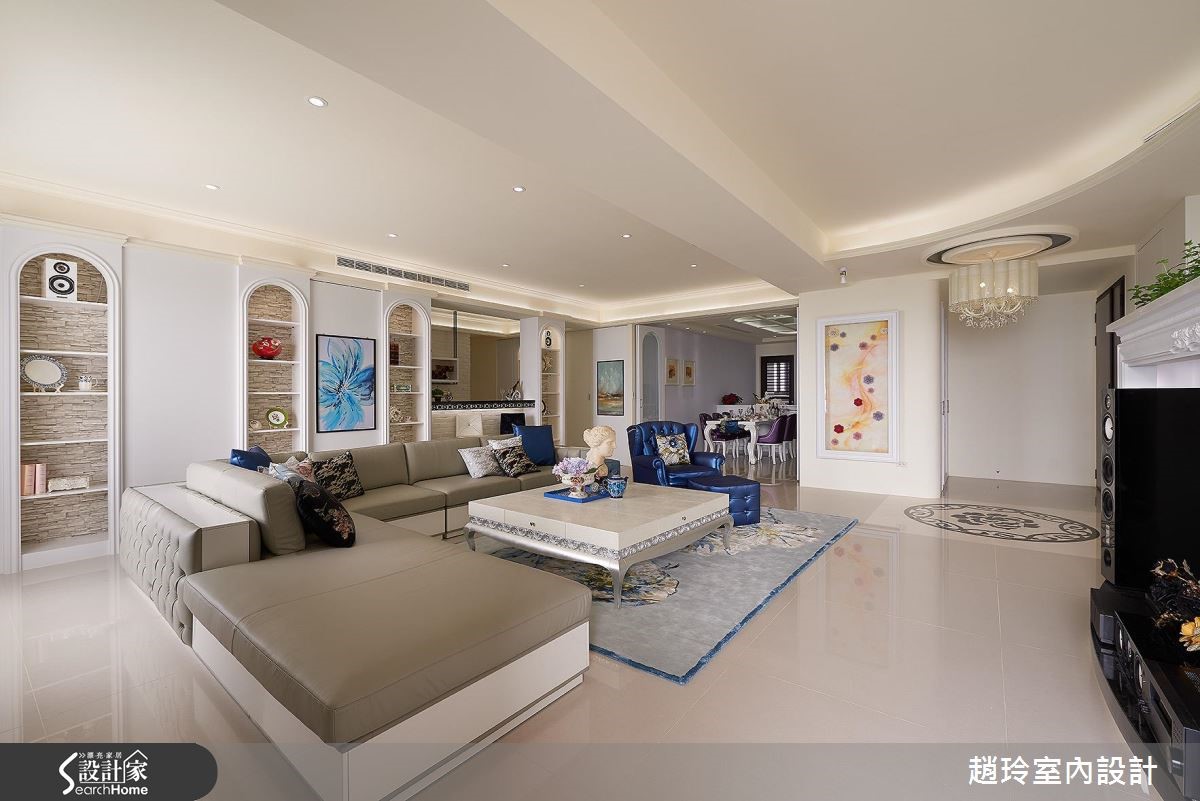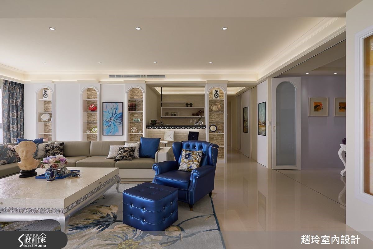 389平方米大宅,设计师重新整顿空间墙面,藉由场域的延伸或后退,满足各居室的收纳需求,并跳脱传统新古典的设定,以带有东方色彩的牡丹作为公共空间图腾,象征花开富贵、大富大贵的吉祥之意。【跳脱新古典,呈现俐落简约空间】设计师于玄关地坪设计图腾拼花,与圆顶水晶灯相呼应;并借天花线条的圆弧脉络创造视觉导引,无形中弱化大梁存在,整体空间采纯粹的白、悠远的蓝搭配,以拱型元素取代繁复的线板雕塑,佐略带现代感的软件,突破既有的新古典印象。开放式吧台以宝蓝色吧台椅跳出亮点,运用铁件打造餐吊柜、赋予收纳与展示意义,在文化石的铺述陪衬下,描绘悠闲放松的场景;主卧则承袭新古典风格,取驼色呼应床头装饰画作,并透过窗帘、壁灯、雕花细节等崭露风雅的生活品味。