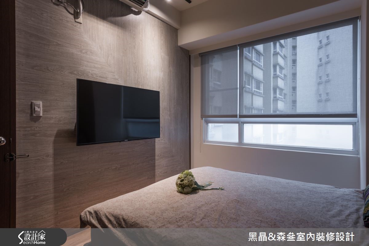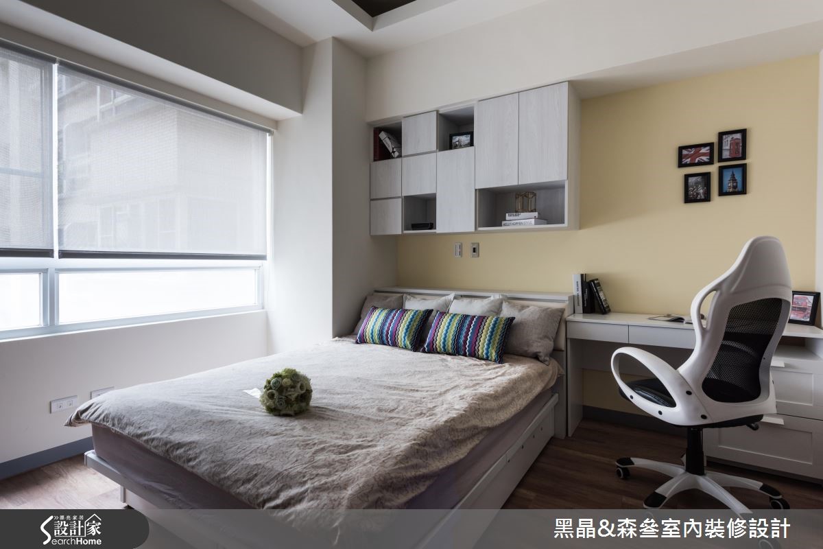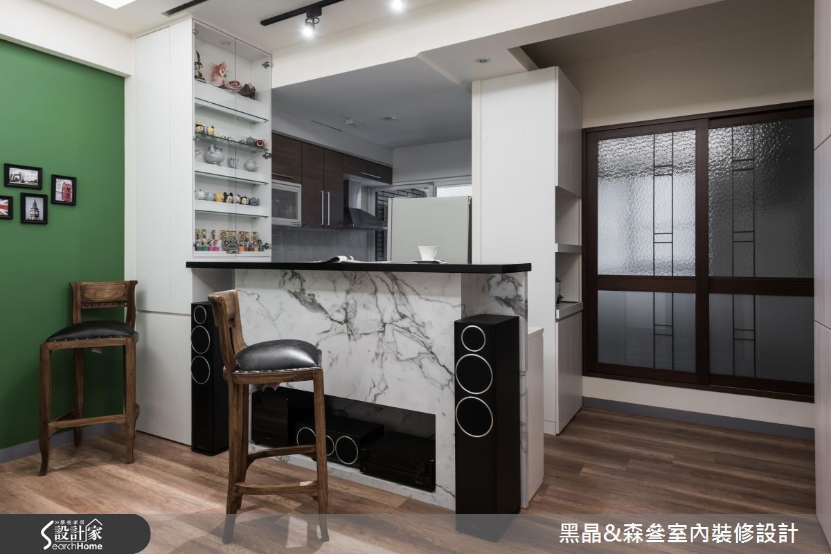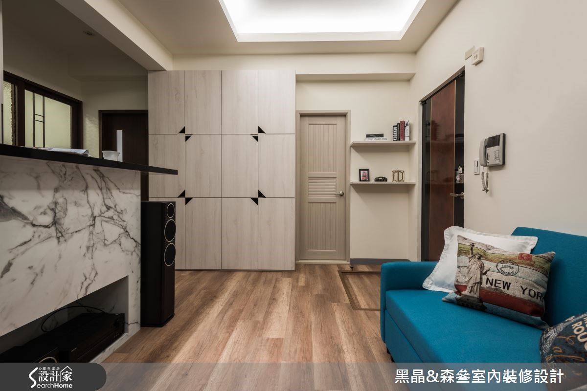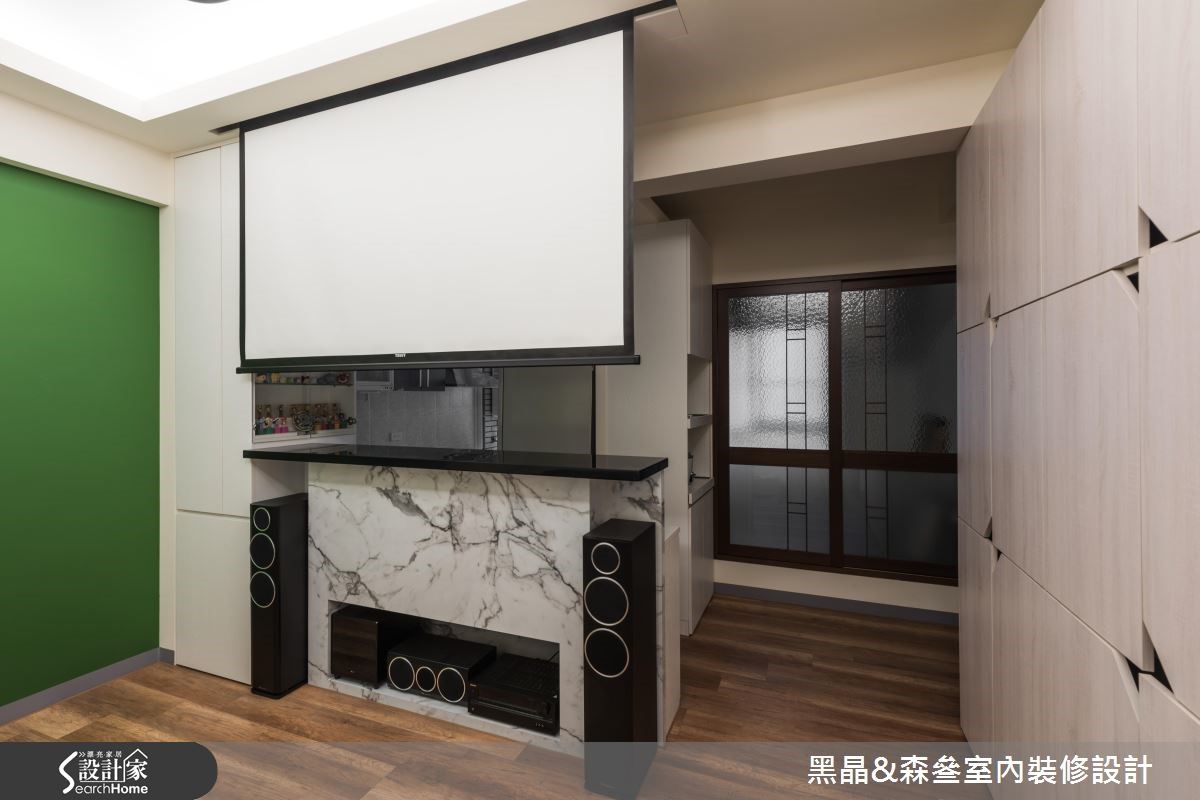 座落于郊区的50平方米二手房,是一对新婚夫妻即将入住的家;然而居宅除了收纳机能不佳,旧有的空间色彩也不尽人意。因此,设计师在不更动格局的前提,以简约现代的风格为主,为新婚夫妻打造出温馨居家。【主墙跳色,妆点空间更显特色】公共领域以抢眼的蓝色沙发与森林绿墙面,形成整体空间的视觉焦点;此外,为完成屋主的家庭剧院梦想,设计师在天花板崁入升降式的投影屏幕,让小空间也能有大屏幕的高级享受,而放置音响的柜体同时也兼具吧台与餐桌机能。走入卧室,简约的木质电视墙与鹅黄色墙面,提升了卧房的温润感;而以灰白色系为主的书桌与床头收纳柜,则带给卧室一股清新气息,随着柔和日光晒入,既宁静又幸福的居家景色油然而生。