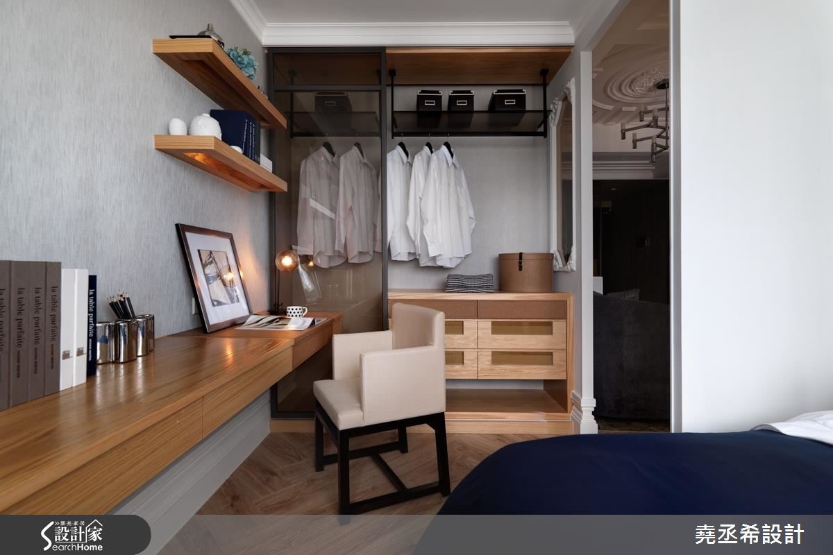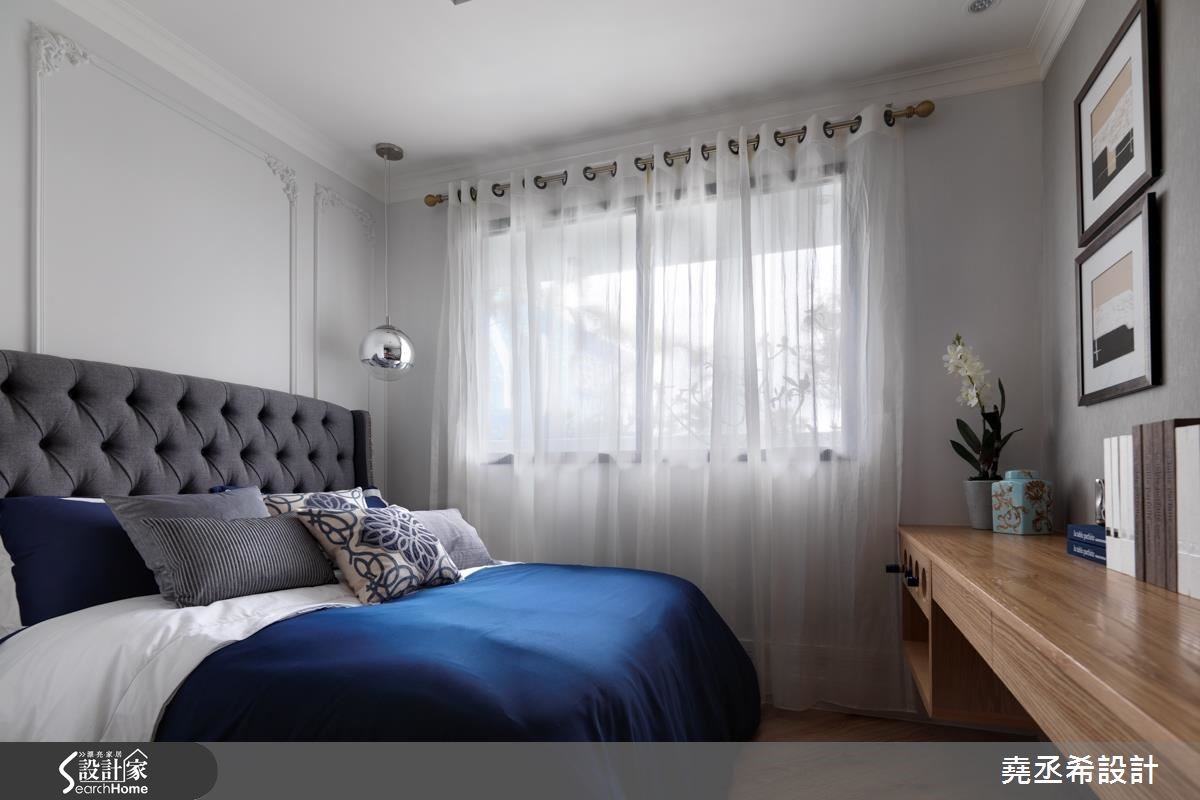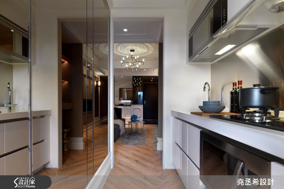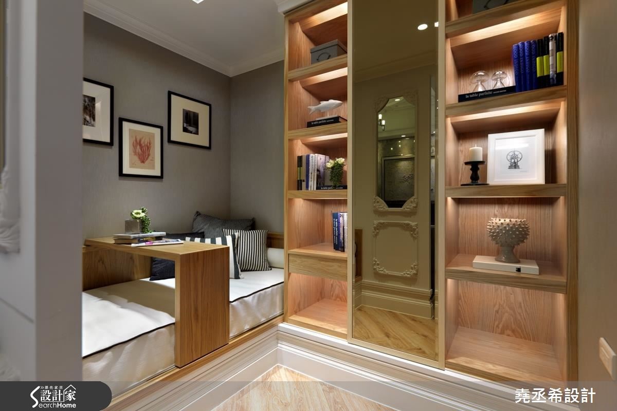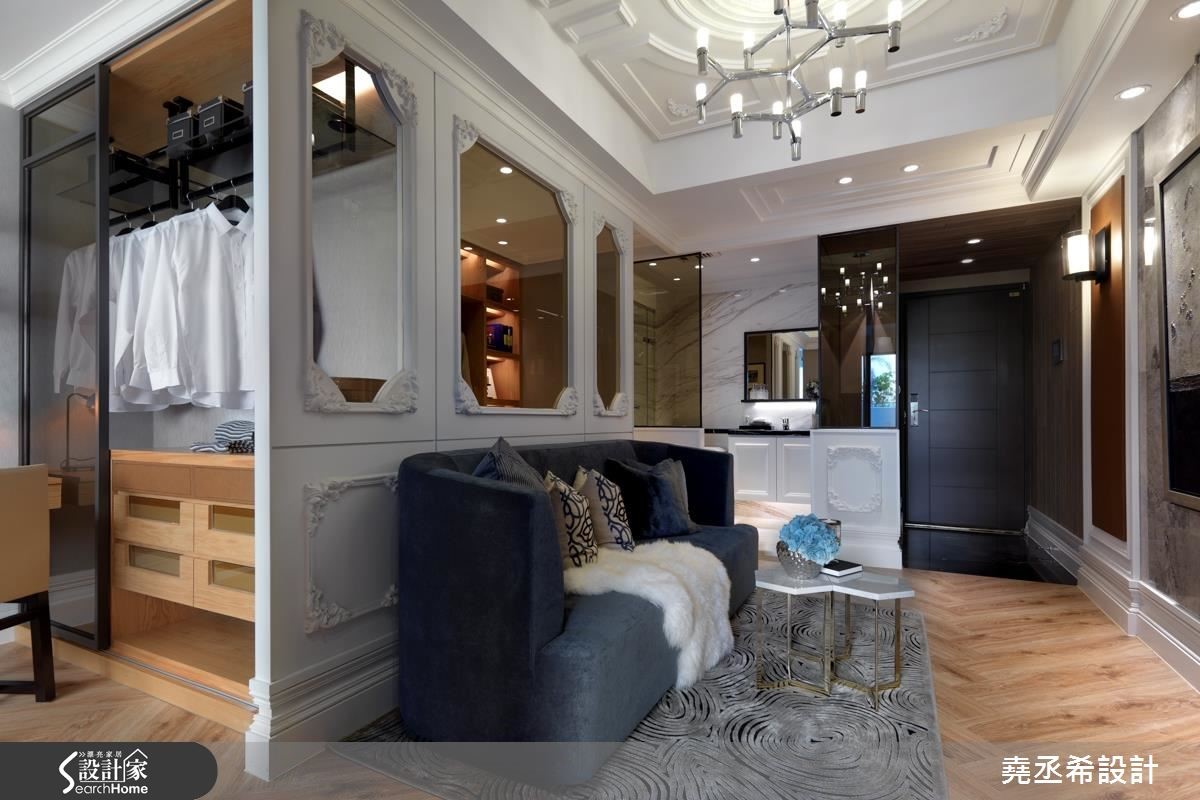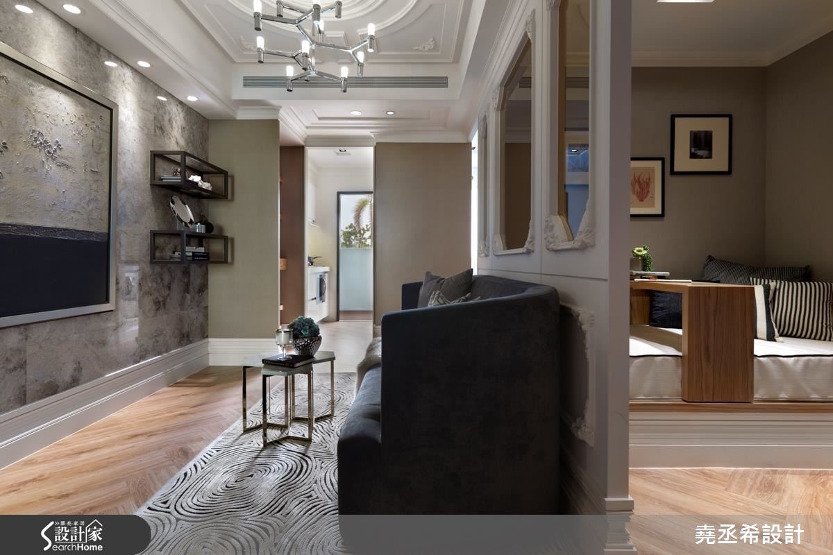 二手房的37平方米小户型,是一对新婚夫妻的新居。设计师利用局部穿透隔断的设计手法,降低拥挤压迫感,不仅能分出客厅、卧室和餐厨,也多了一间书房。同时挹注细致的法式风格,营造美好生活情境。【雕花线板,打造古典立面】居宅整体运用逐层推进的概念,打造流畅的行进方式。大门以玄关作为缓冲区,采用木质连结地坪及墙面,让自然气息表露无遗。室内以客厅作为核心,营布四通八达的动线,让空间之间彼此通透相连,串接成放大不封闭的观感。同时,将纯净白色作为基底,特选灰色大理石作为主墙背景,加以画饰取代电视墙作为主角,打造淡雅高贵的风景。并在沙发墙融入三道清透隔间,透过线板与对称造型勾勒古典情境,让人衍生走入欧美电影场景的错觉。书房规划卧铺,可弹性变更为卧房使用,配上一座结合书柜与衣柜的两用柜,满足小户型的大型物件收纳。厨房则规划毛丝面金属板,好清洁也兼记事功能;而茶色拼镜则延伸视野。卧室运用线板墙和铆钉床头板,体现巴洛克装饰精神,且纳入更衣室和书房,扩充机能。