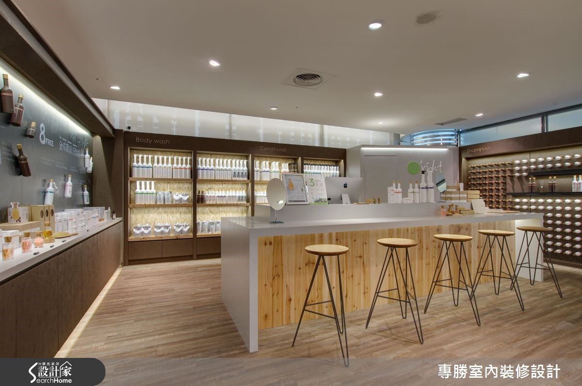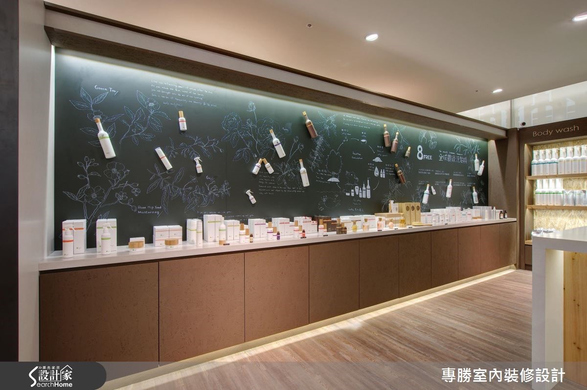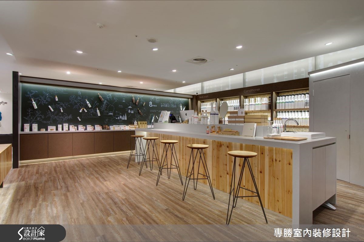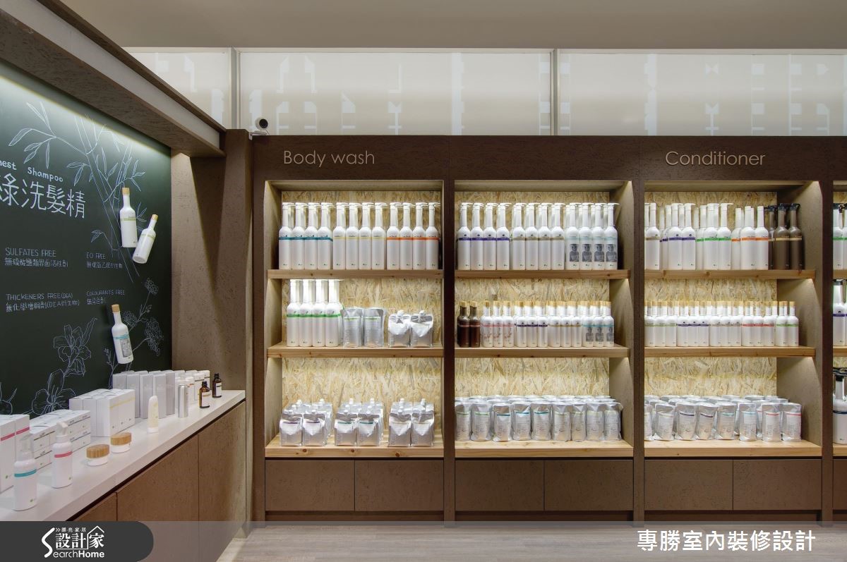 以环保自然为设计核心的知名发妆品牌,此次利用63平方米的商业空间来诠释品牌诉求,让大地色系替空间装饰基底,挑选原始材质妆点空间,展现美好纯净的生命力。 【变化展示墙体设计,活化人文气息】以旗下的咖啡因产品特质为灵感,藉由涂上咖啡色漆的甘蔗板创造出展示隔板,搭配水泥板及松木板的材质,让展场内充满温润惬意氛围。中央吧台则作为客人的咨询处,带着自然纹理的木质,强化清新悠闲的气息,顿时感到舒心疗愈之效。以商品情境的摆设,作为视觉主导,右侧利用瓶罐堆叠出立体视觉,中央则以两排展示层架,强调出主打商品;左侧以黑板漆作为产品介绍的主墙,以粉笔描绘植物与商品特色,结合实际产品的装饰,创造出生动活泼的氛围。