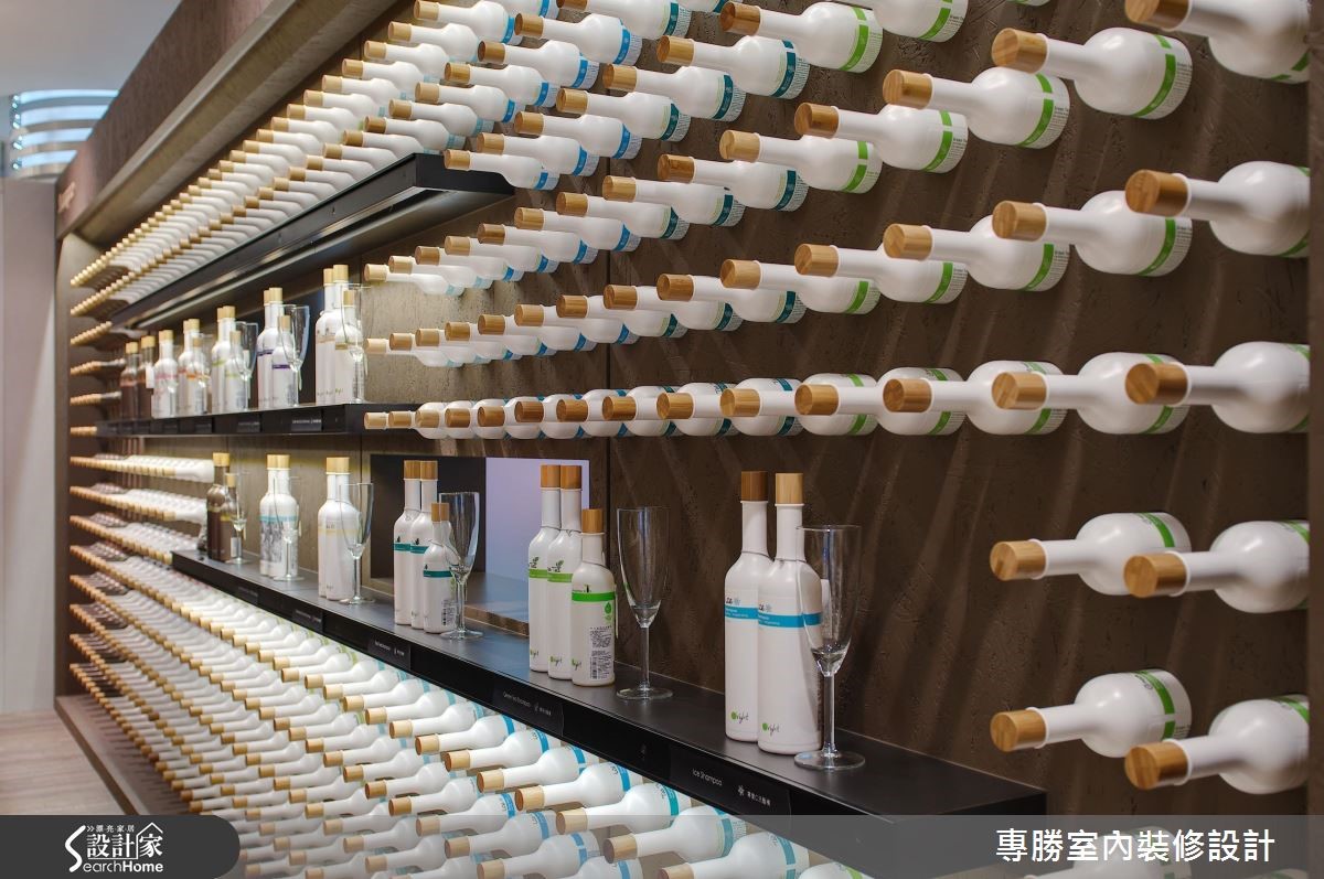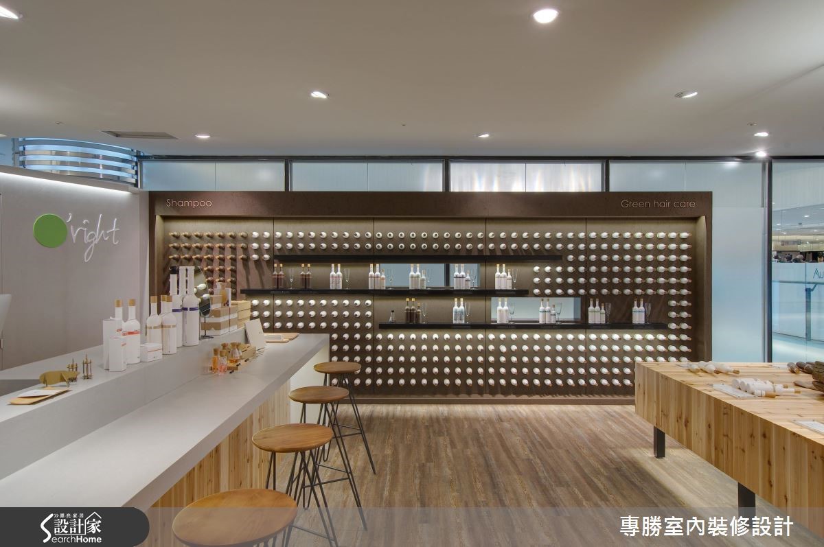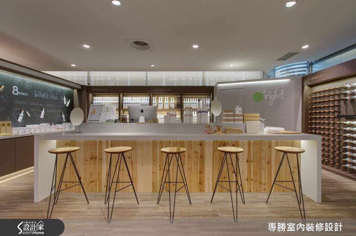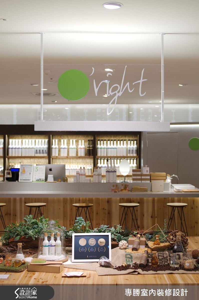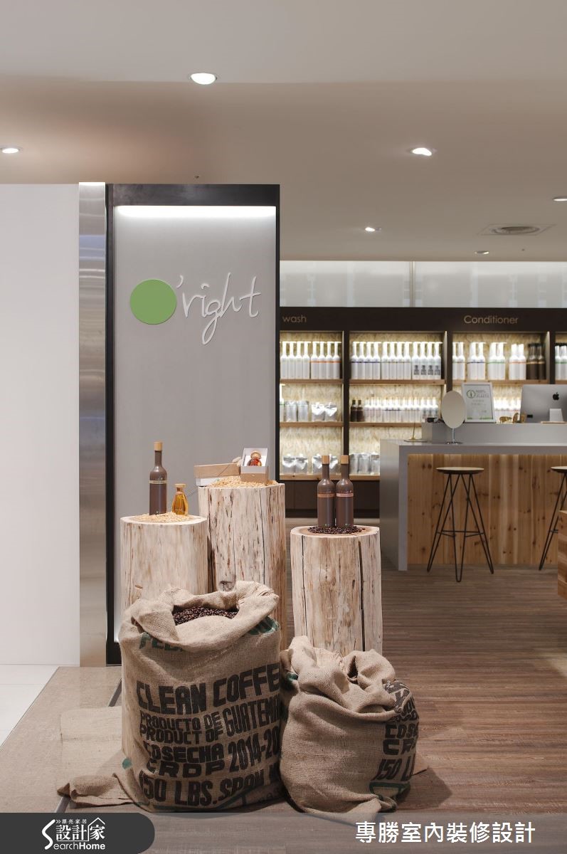 以环保自然为设计核心的知名发妆品牌,此次利用63平方米的商业空间来诠释品牌诉求,让大地色系替空间装饰基底,挑选原始材质妆点空间,展现美好纯净的生命力。 【变化展示墙体设计,活化人文气息】以旗下的咖啡因产品特质为灵感,藉由涂上咖啡色漆的甘蔗板创造出展示隔板,搭配水泥板及松木板的材质,让展场内充满温润惬意氛围。中央吧台则作为客人的咨询处,带着自然纹理的木质,强化清新悠闲的气息,顿时感到舒心疗愈之效。以商品情境的摆设,作为视觉主导,右侧利用瓶罐堆叠出立体视觉,中央则以两排展示层架,强调出主打商品;左侧以黑板漆作为产品介绍的主墙,以粉笔描绘植物与商品特色,结合实际产品的装饰,创造出生动活泼的氛围。