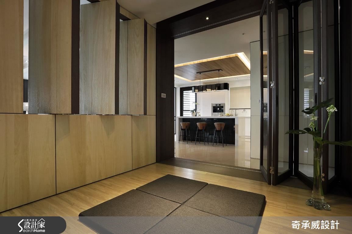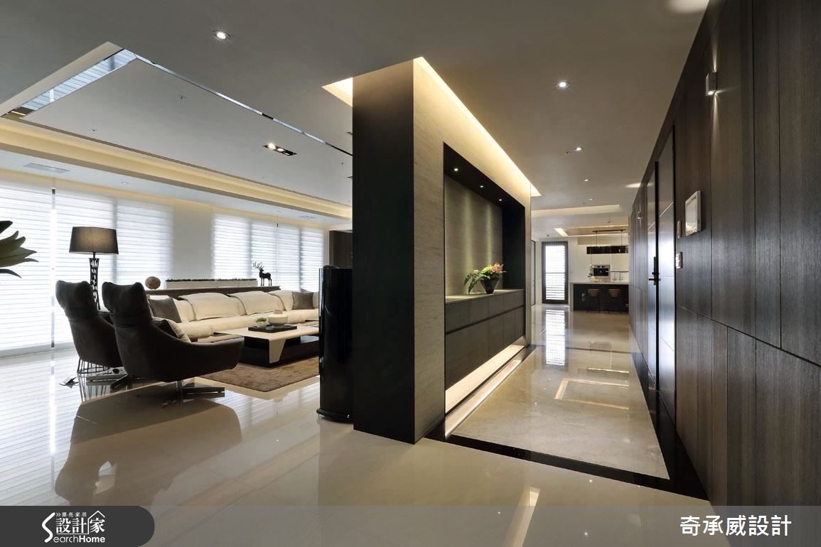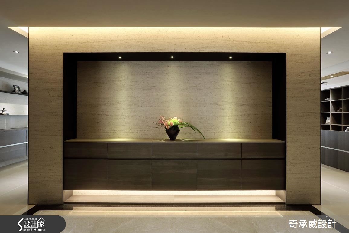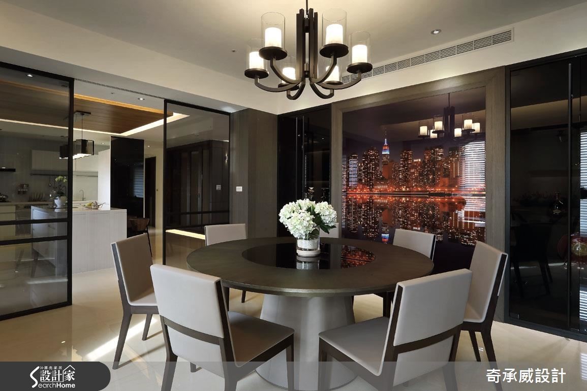 以米、大地色系铺陈空间,替宽敞宅邸增添一份暖炙人心的温度,再搭配深色调与锻铁质材的活用,勾勒出豪宅的非凡气势。【优雅内敛,打造人文质韵感】一道以石材与锻铁打造的实体墙伫立在客厅与大门之间,围塑出玄关领域,巧妙化解开门见阳台的窘境,而底部挂上一幅艳彩画作,简约、内敛的空间风格,在注入艺术美感后,赋予优雅的人文质韵。【宽敞室内气度,引入户外美景】流沙大理石的肌理转化为电视墙造型,嵌入天花板渐层手法,顿时彰显非凡气派,加上户外光源映照,展现舒心宽敞的气度。餐厅领以典雅风格描绘,藉由窗户设计引入城市美景,并利用铁件、玻璃打造推拉门,界定出厨房区。