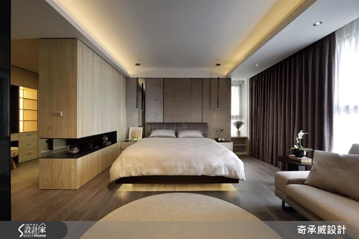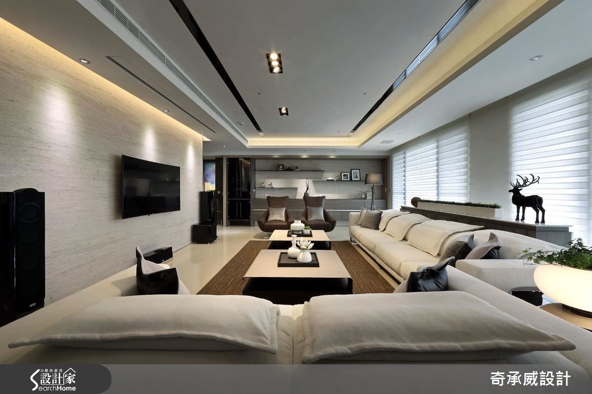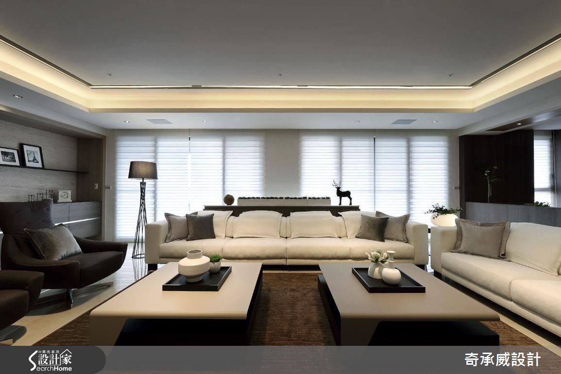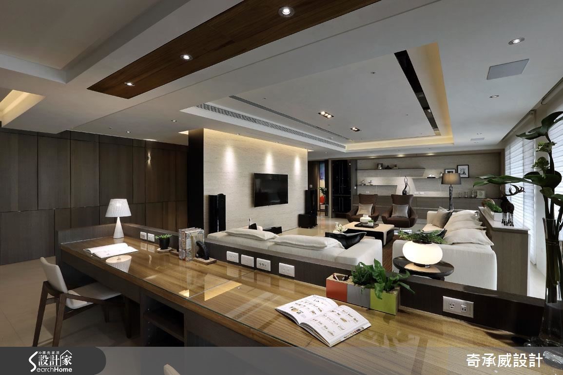 以米、大地色系铺陈空间,替宽敞宅邸增添一份暖炙人心的温度,再搭配深色调与锻铁质材的活用,勾勒出豪宅的非凡气势。【优雅内敛,打造人文质韵感】一道以石材与锻铁打造的实体墙伫立在客厅与大门之间,围塑出玄关领域,巧妙化解开门见阳台的窘境,而底部挂上一幅艳彩画作,简约、内敛的空间风格,在注入艺术美感后,赋予优雅的人文质韵。【宽敞室内气度,引入户外美景】流沙大理石的肌理转化为电视墙造型,嵌入天花板渐层手法,顿时彰显非凡气派,加上户外光源映照,展现舒心宽敞的气度。餐厅领以典雅风格描绘,藉由窗户设计引入城市美景,并利用铁件、玻璃打造推拉门,界定出厨房区。