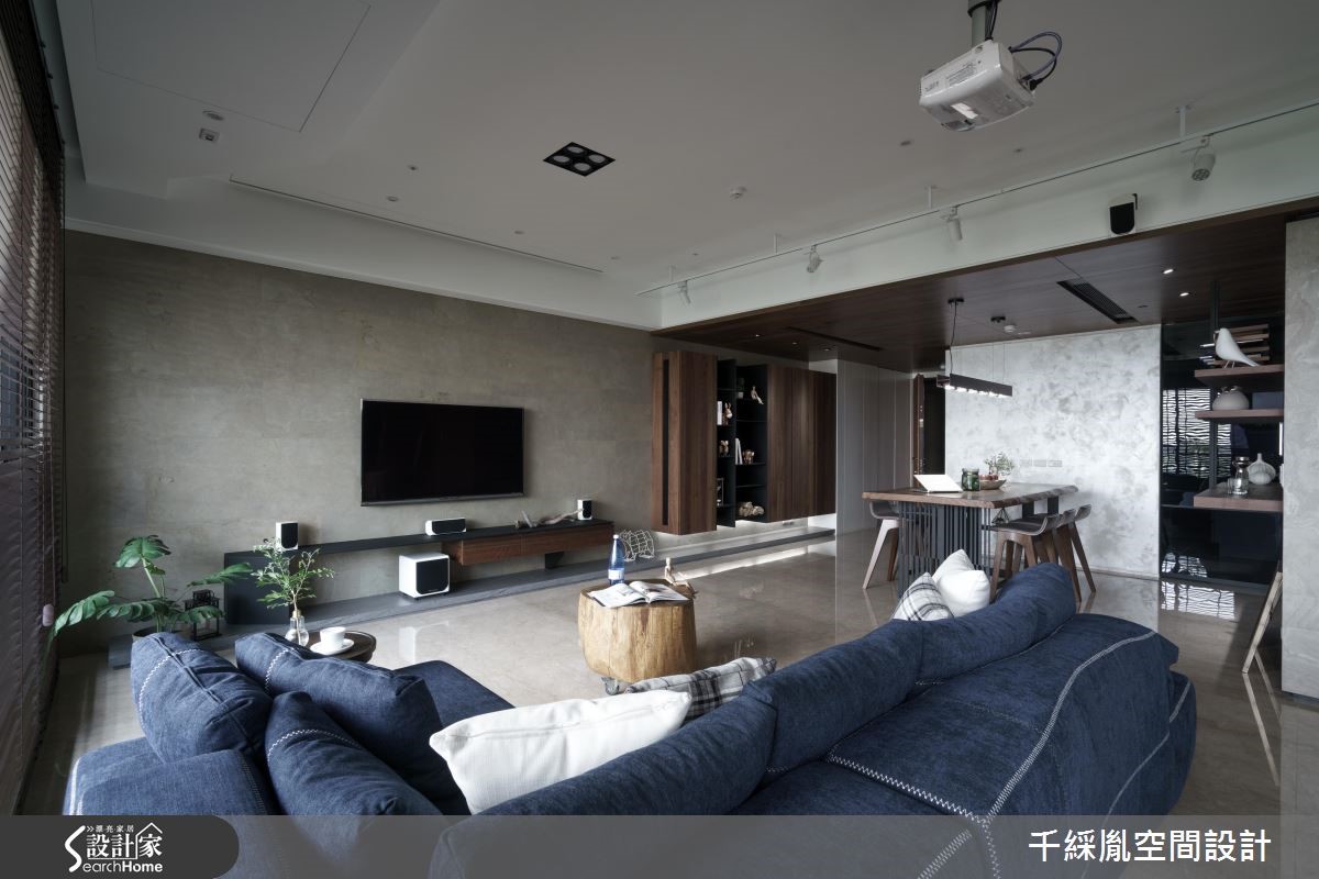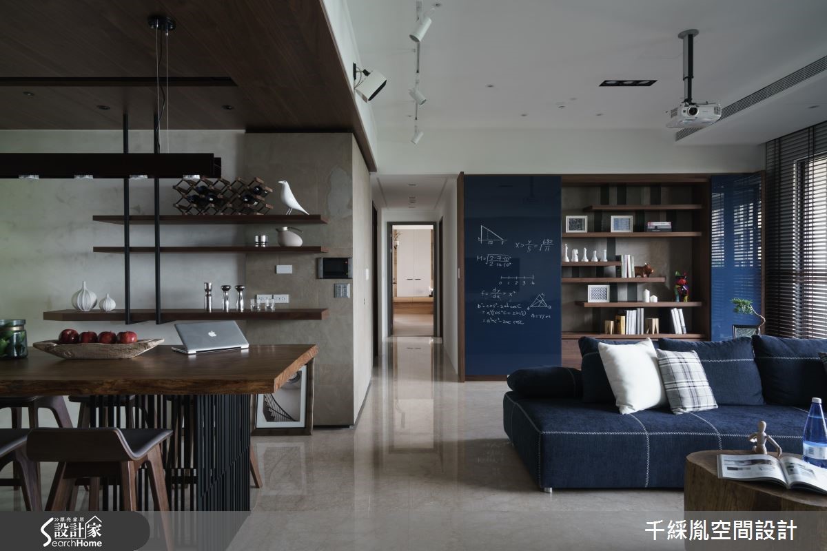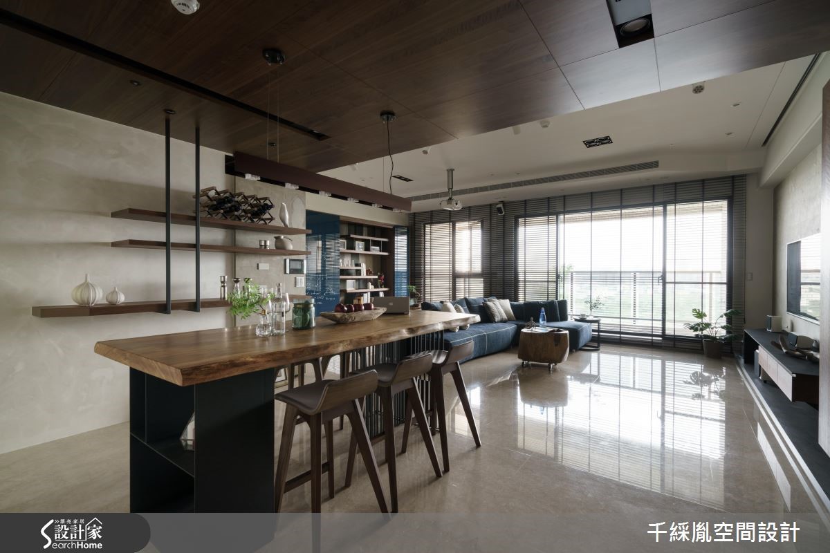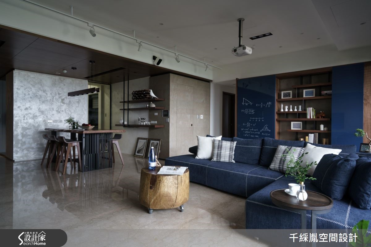 设计师为142平方米的现代空间注入休闲简约气息,除了机能与格局规划外,更在细节处增添个性风采,给予屋主夫妻机能多元、宽敞舒适的居宅规划。【跳色家具,为空间注入视觉焦点】设计师抹除制式化的玄关规划,以大片延伸的长型收纳柜营造廊道效果;开放式的公共领域,则利用天花板的木纹降板设计巧妙区隔场域,不仅让空间感更开阔,也提高居住者的互动性,并以宝蓝色调的沙发与后方休憩区的烤玻相互呼应,成为低彩度空间中的亮点。宽敞的主卧空间,设计师以拉门区隔独立更衣间,并特别设置沿窗吧台,以及兼具展示与收纳的柜体,搭配造型吊灯和蓝色高脚凳,营造宛如咖啡厅般的悠闲气息,让夫妻俩即使在同个空间也能拥有私人时光。
