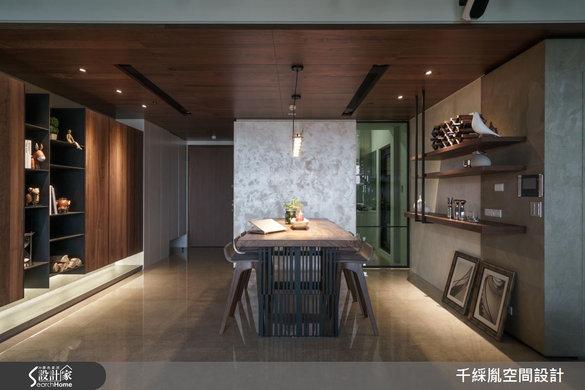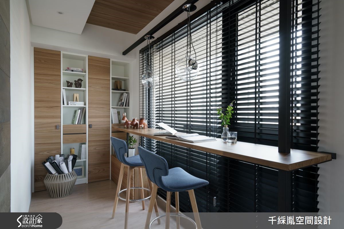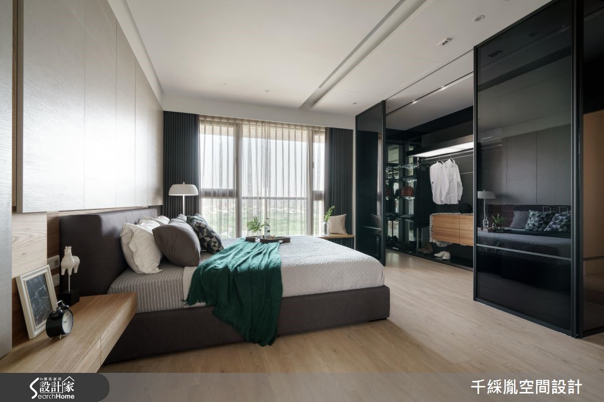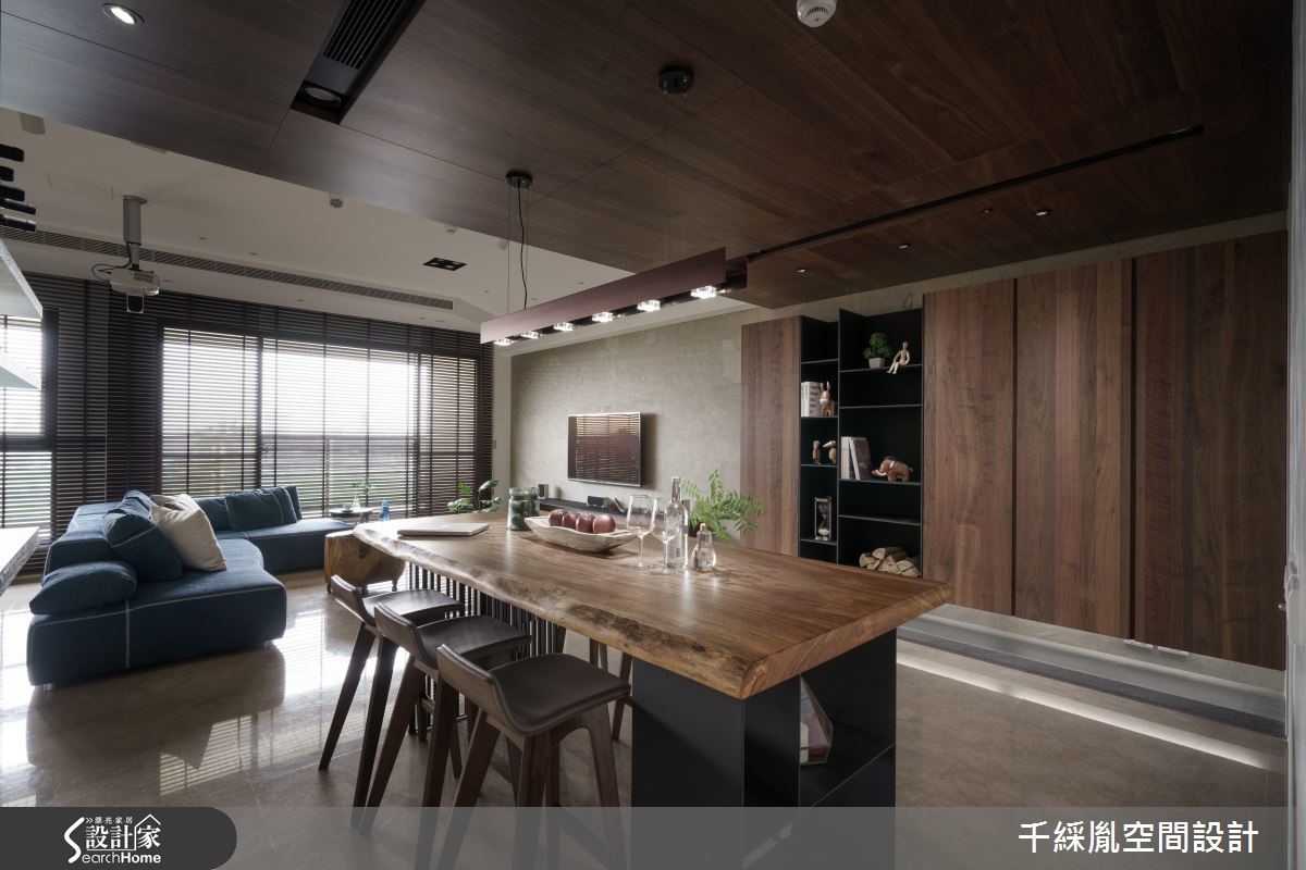 设计师为142平方米的现代空间注入休闲简约气息,除了机能与格局规划外,更在细节处增添个性风采,给予屋主夫妻机能多元、宽敞舒适的居宅规划。【跳色家具,为空间注入视觉焦点】设计师抹除制式化的玄关规划,以大片延伸的长型收纳柜营造廊道效果;开放式的公共领域,则利用天花板的木纹降板设计巧妙区隔场域,不仅让空间感更开阔,也提高居住者的互动性,并以宝蓝色调的沙发与后方休憩区的烤玻相互呼应,成为低彩度空间中的亮点。宽敞的主卧空间,设计师以拉门区隔独立更衣间,并特别设置沿窗吧台,以及兼具展示与收纳的柜体,搭配造型吊灯和蓝色高脚凳,营造宛如咖啡厅般的悠闲气息,让夫妻俩即使在同个空间也能拥有私人时光。