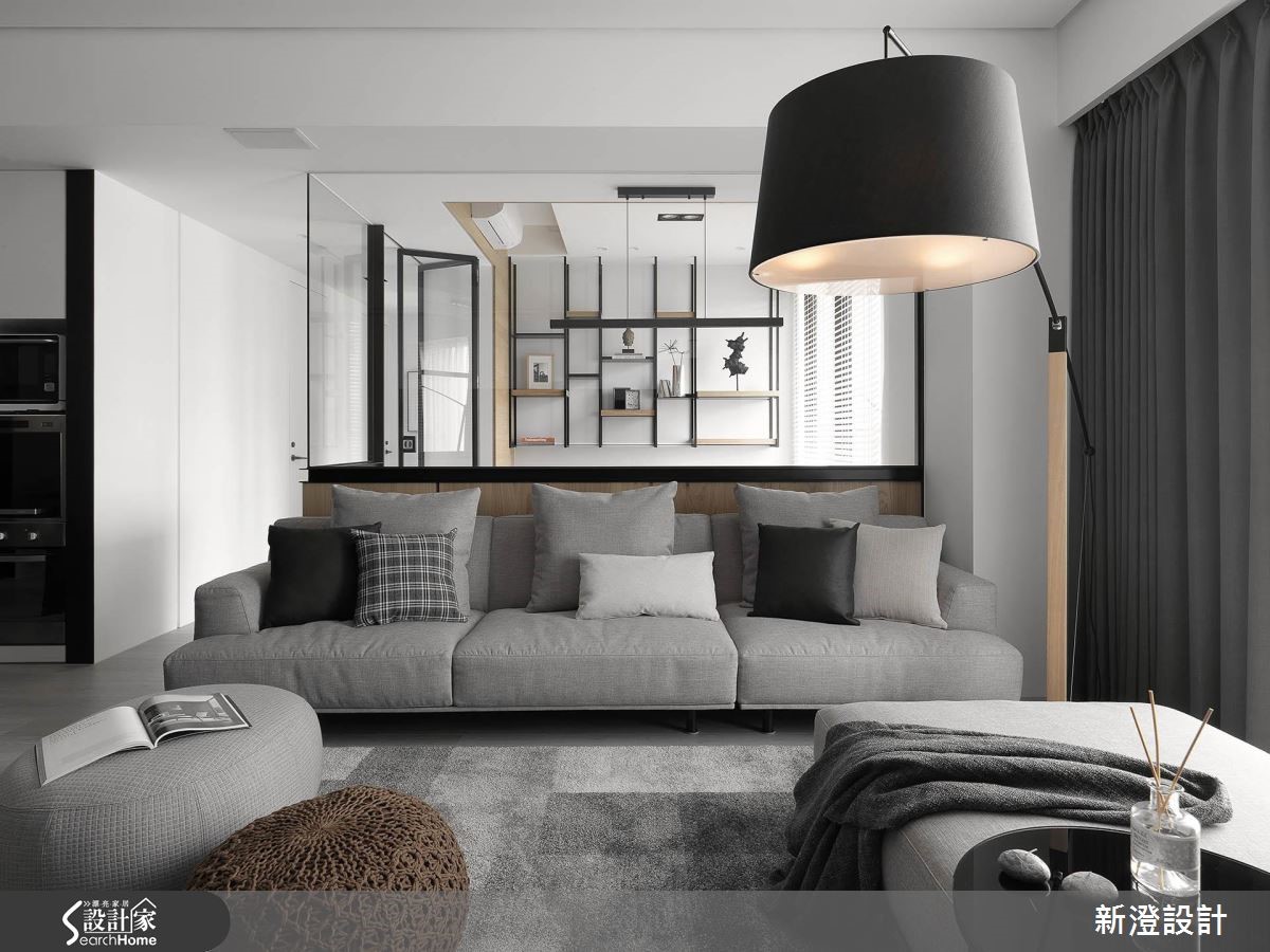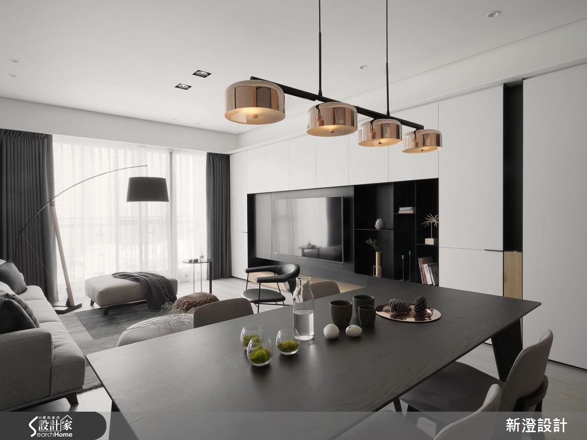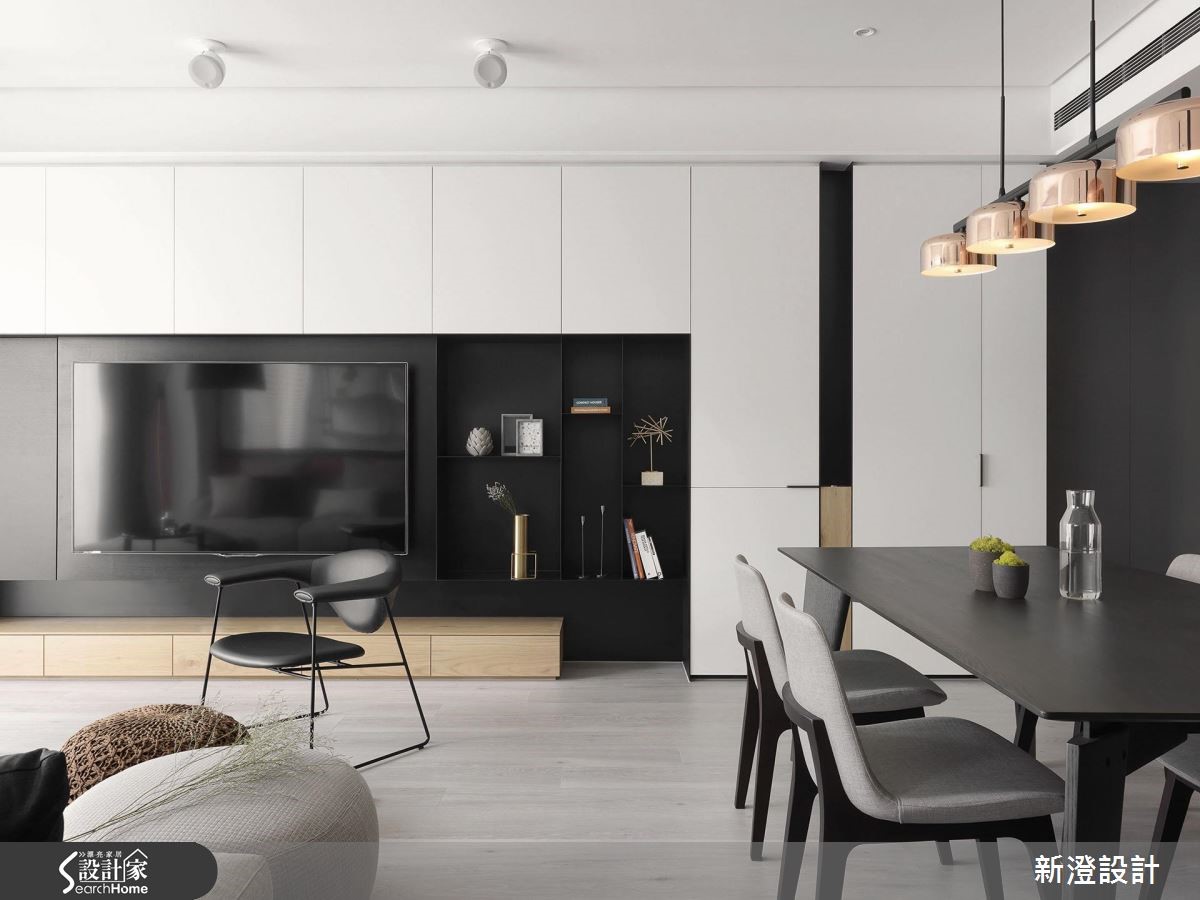 172平方米居家,设计师引用经典的黑白色调,在低彩主调中结合简约的现代语汇,同时将收纳机能隐藏,创造出空间、人、生活的和谐样貌。【舍弃复杂,简约线条延伸视感】空间舍弃过于复杂的线条,透过大面积的白色延伸,佐以黑色与木皮相间,让面与面、线与线之间,存在着细致的秩序感,无形中亦让视觉有所延伸,而书房的清玻隔断,则适时破除视线局促,增添公共场域的穿透视角,型构悠远的风景画面。【隐藏式机能,收纳简洁表情】同时于电视墙、廊道植入隐藏式机能,餐厅则给予简洁的电器收纳型式,落实利落的立面表情,餐厅、厨房之间规划两道铝制滑门,利用冷灰色玻璃型塑半通透效果,达到延伸光线与隔绝油烟目的。【强调立体感,营造视觉扩容效果】寝卧延续着白色底调,以黑色线性强调立体视感,同时为卧室争取视觉扩容效益,在转角畸零处做出阅读区、梳妆台,且另辟实用的更衣间,完善起居中的需求!